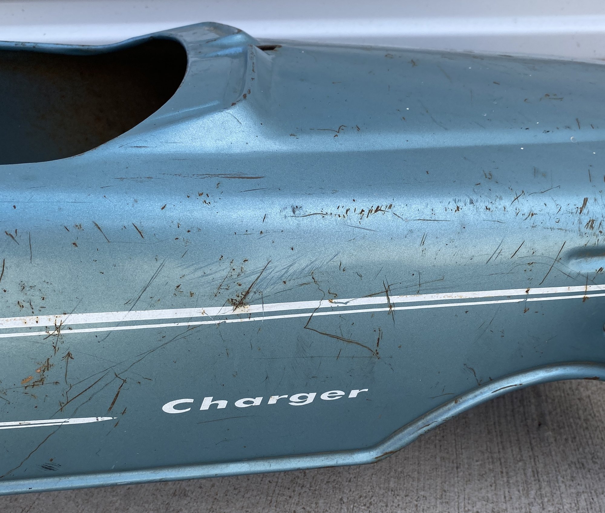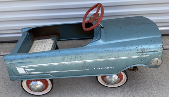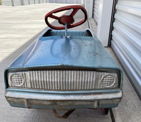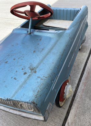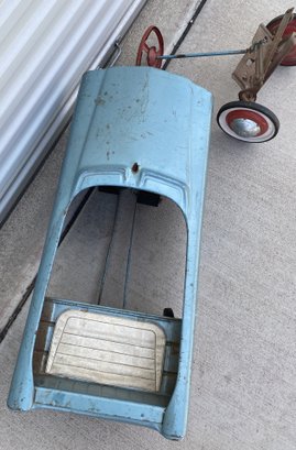 The front tires and pedal mechanism are not attached to the rest of the car. Otherwise, it is in good, used condition. It is " long x " wide.