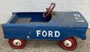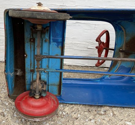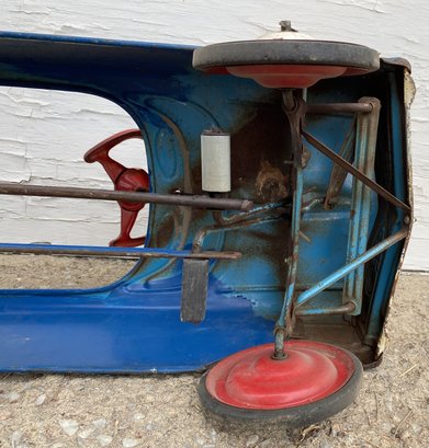 The car is in good, solid condition, although it is missing one pedal (see fifth picture). The pedal mechanism moves, but we do not know if they will move the car. The car is 32-1/2" long x 13-1/2" wide. We think it was made by Murray.