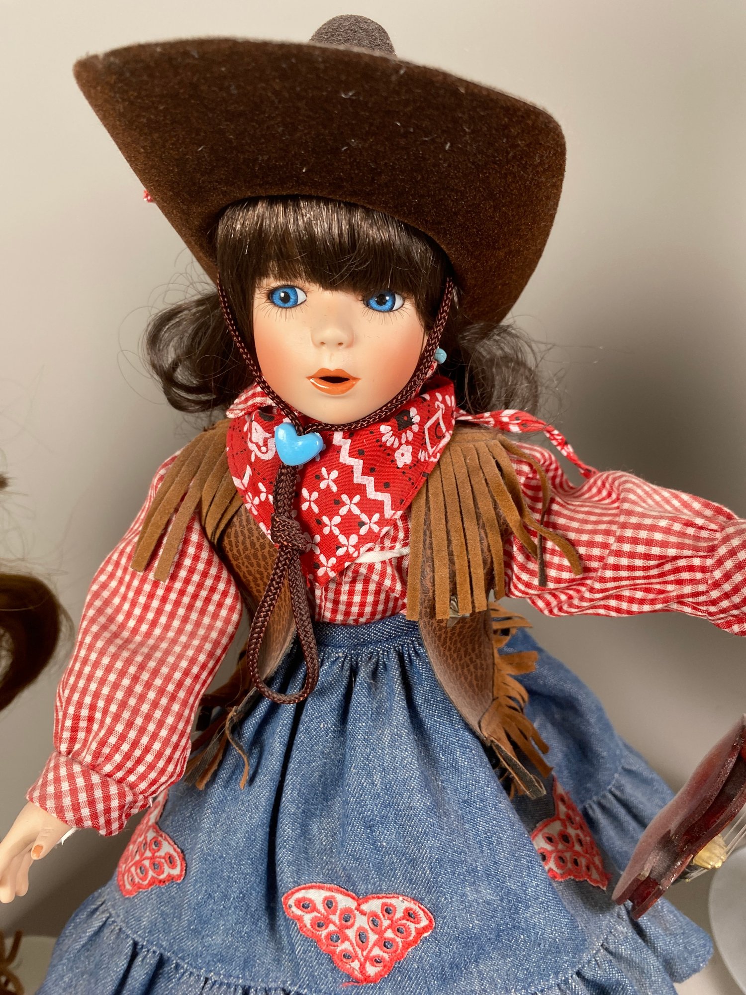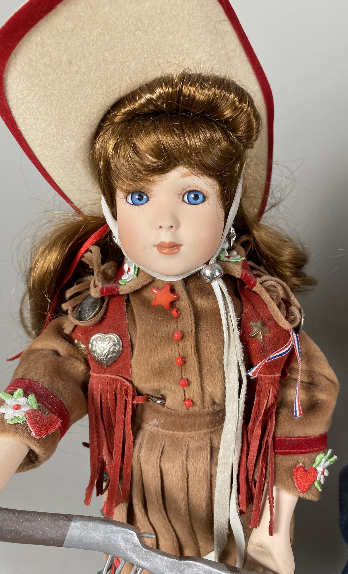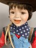 The dolls are in very good condition, although they need a bit of light dusting. The largest is approximately 20" tall. All have doll stands. The doll with the fiddle plays music and is call Miriah, the doll in overalls is called Kelsey and the Annie Oakley doll is from the Paradise Galleries "Little Ladies of the Wild West" Treasury Collection.