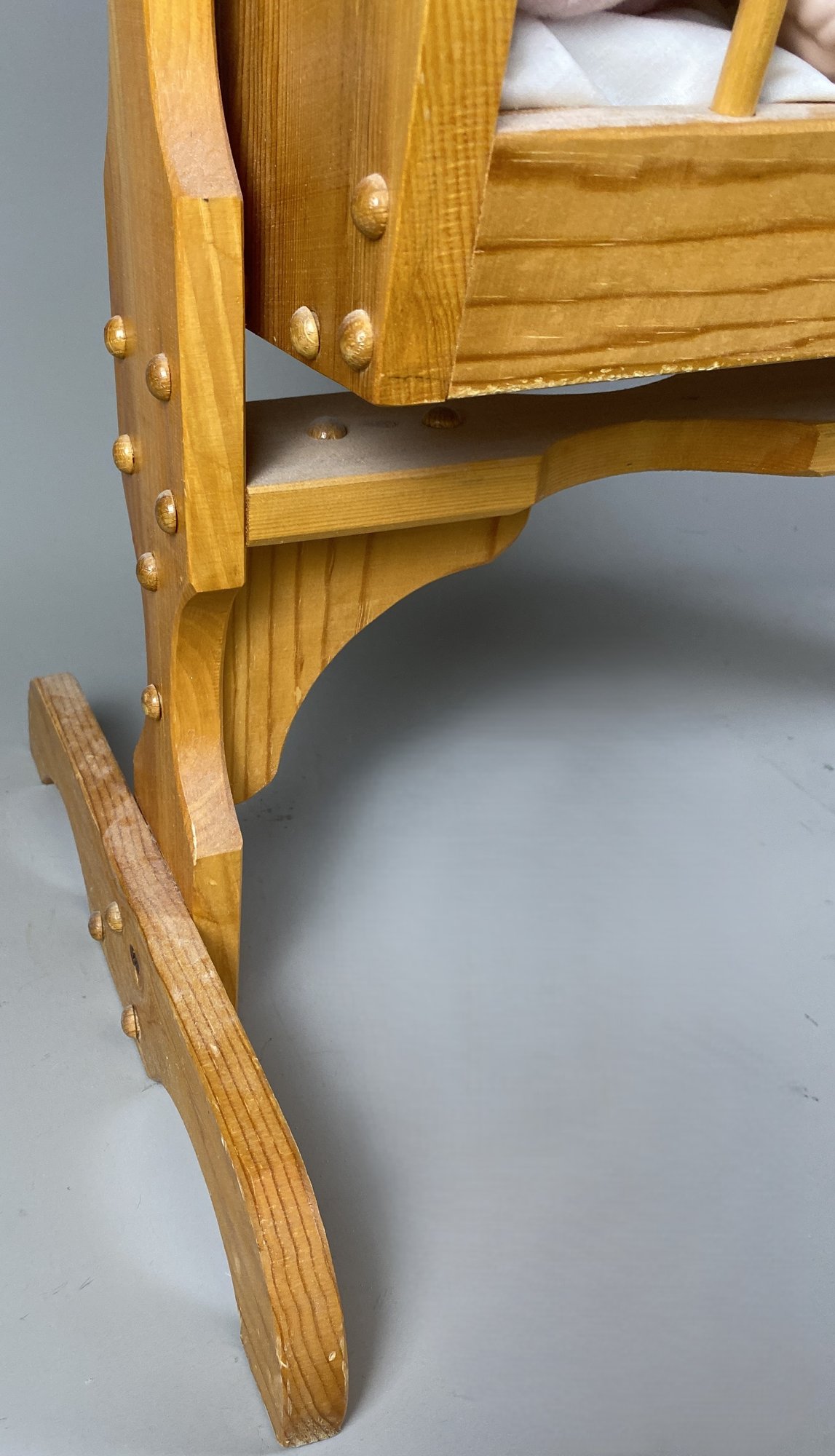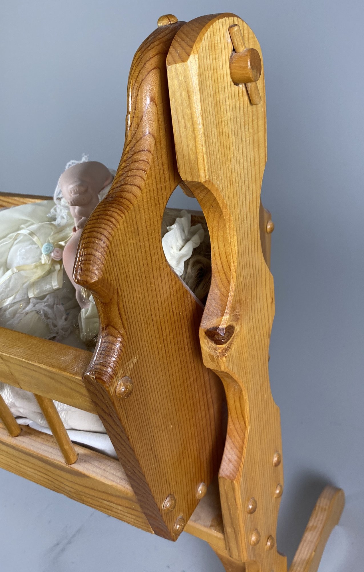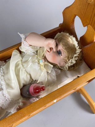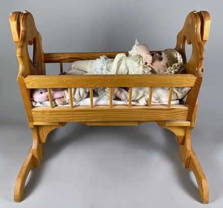 The doll and cradle are in very good condition, although they may need to be dusted. The cradle is 25" long x 15-1/4" wide x 24" tall.