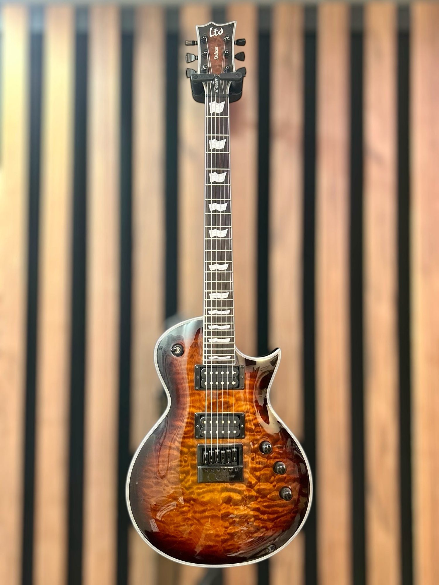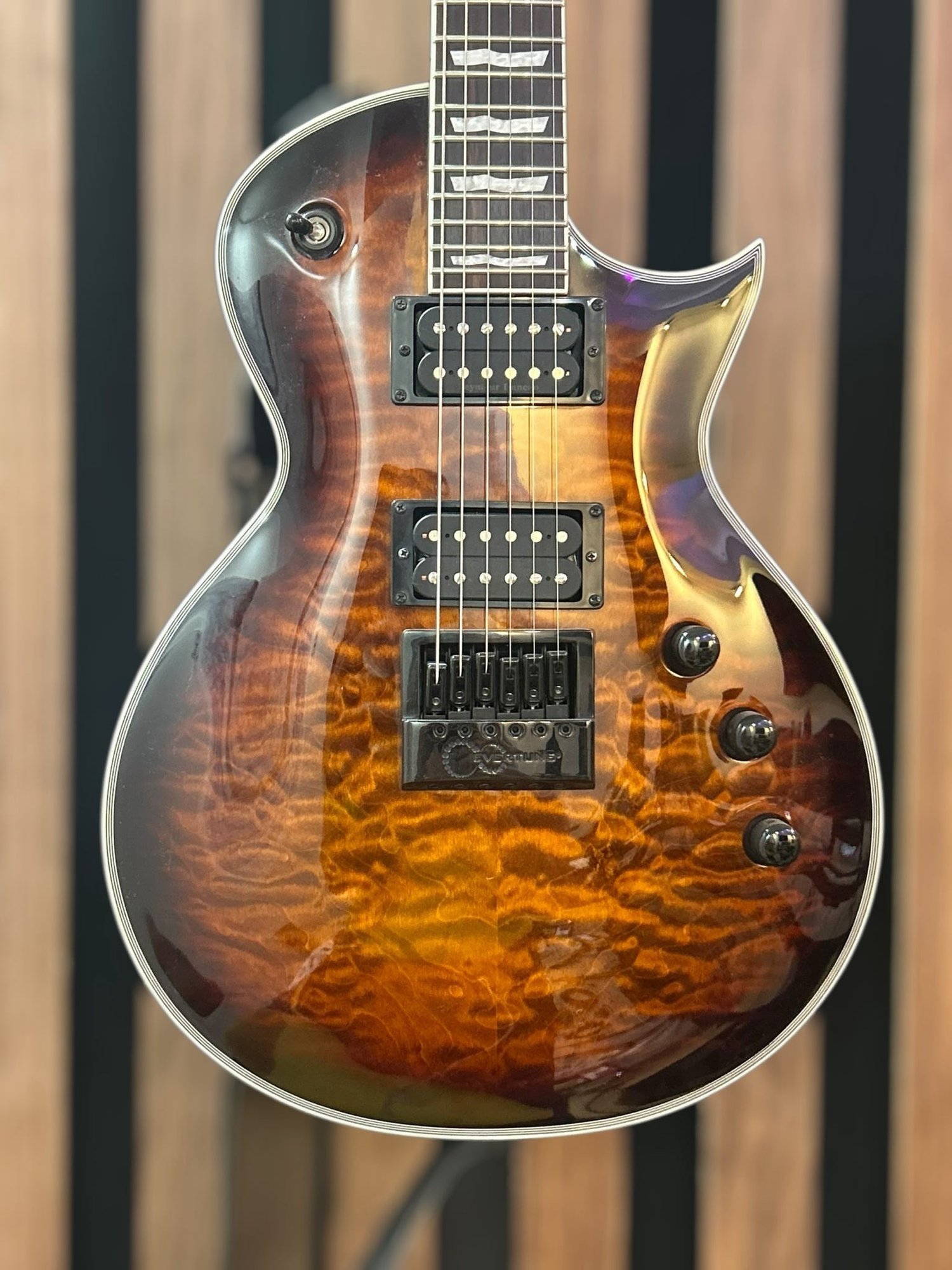 This beautiful guitar is designed for professional musicians and is highly regarded for its build quality and tuning. This guitar features a Mahogany build with a quilted maple top. It has an EverTune bridge system for constant tuning stability. The fingerboard is ebony with 24 jumbo frets and flag inlays.