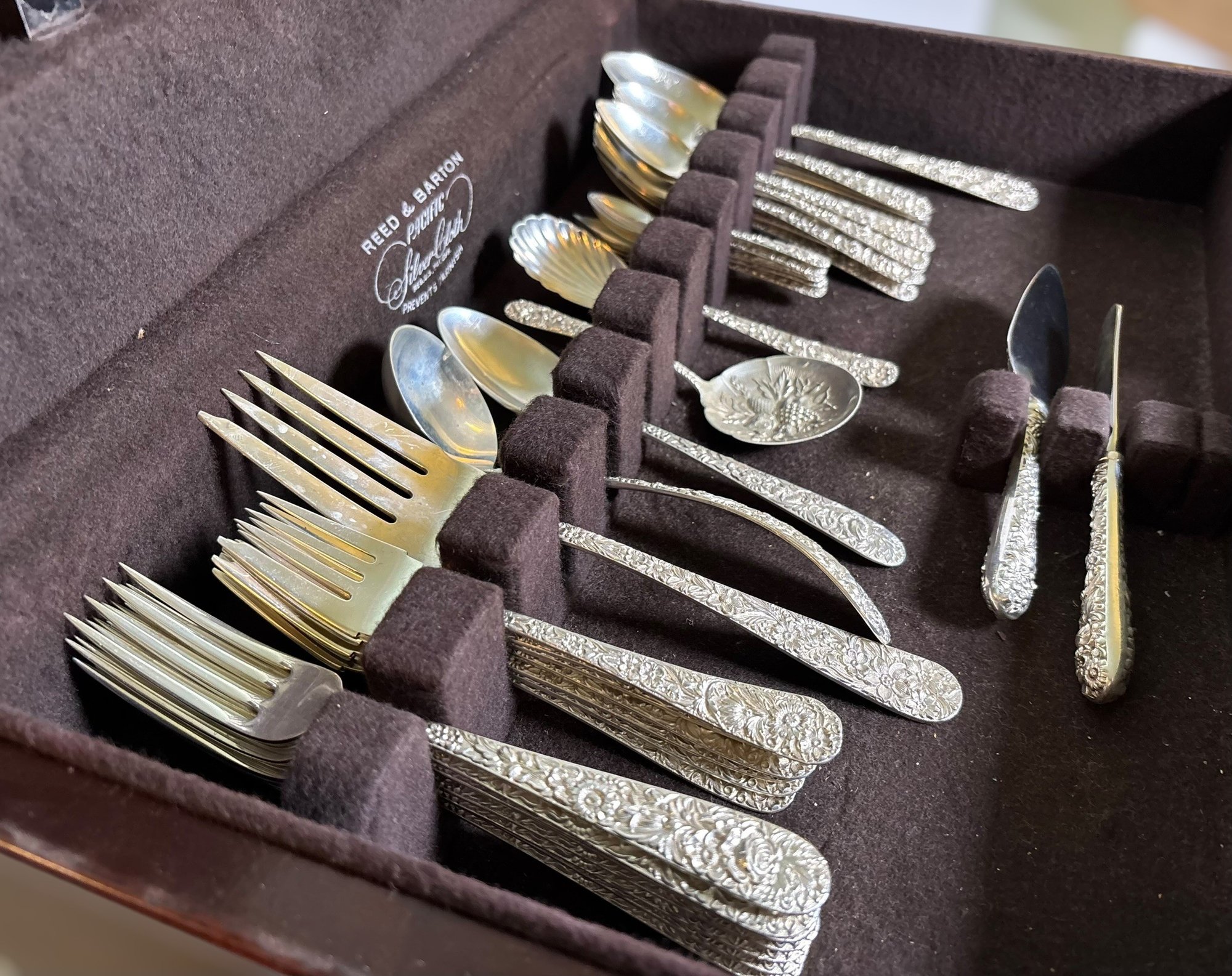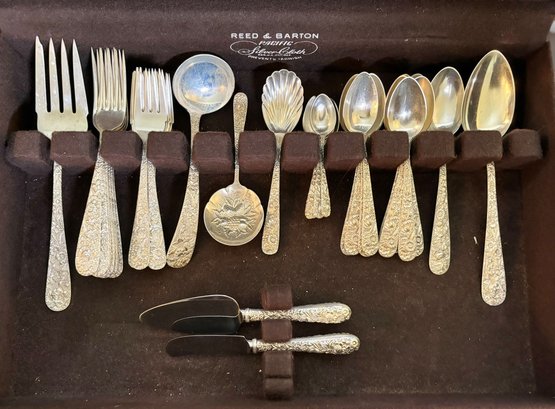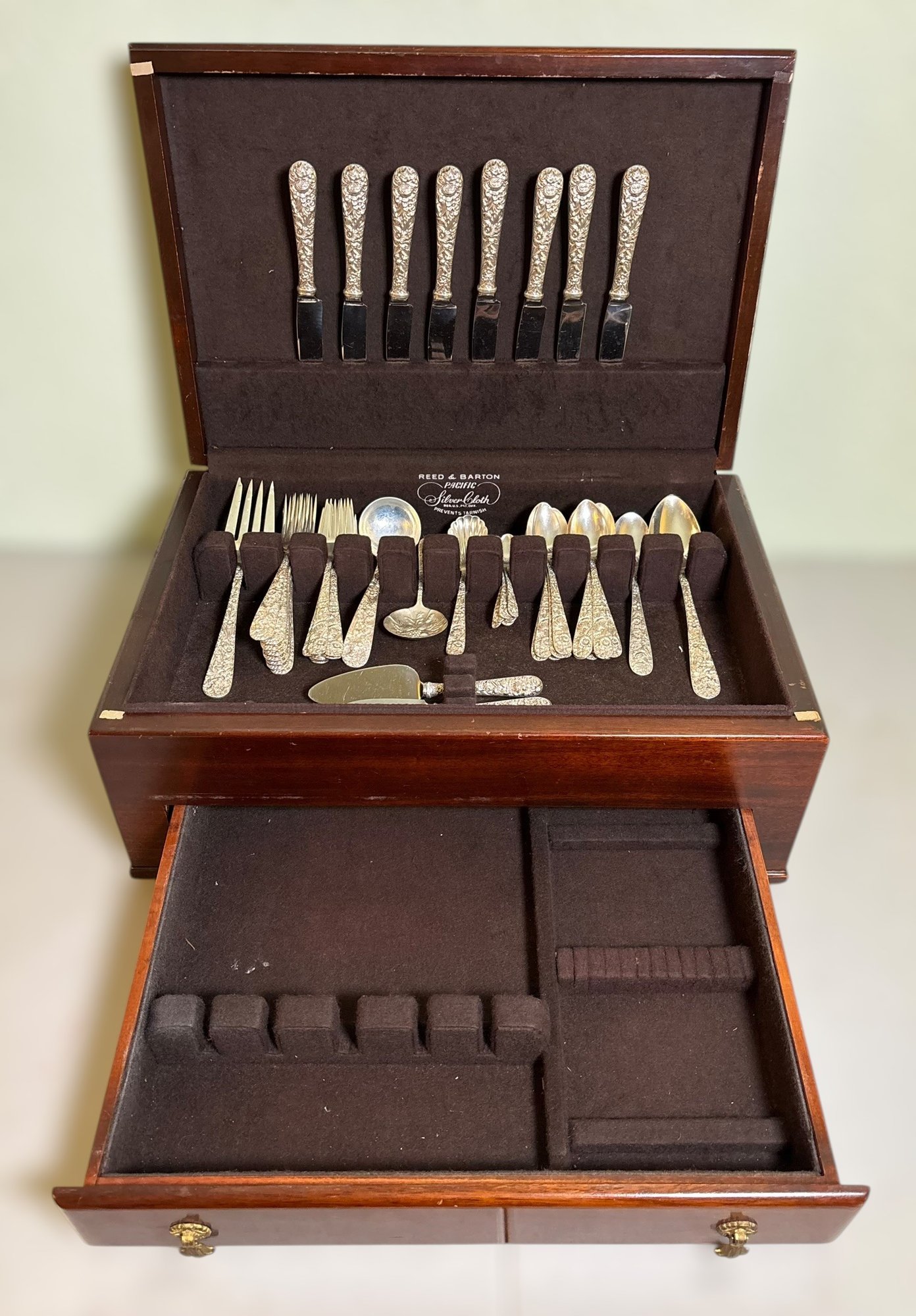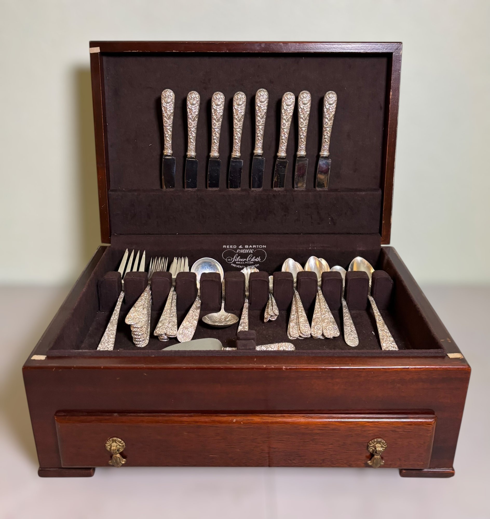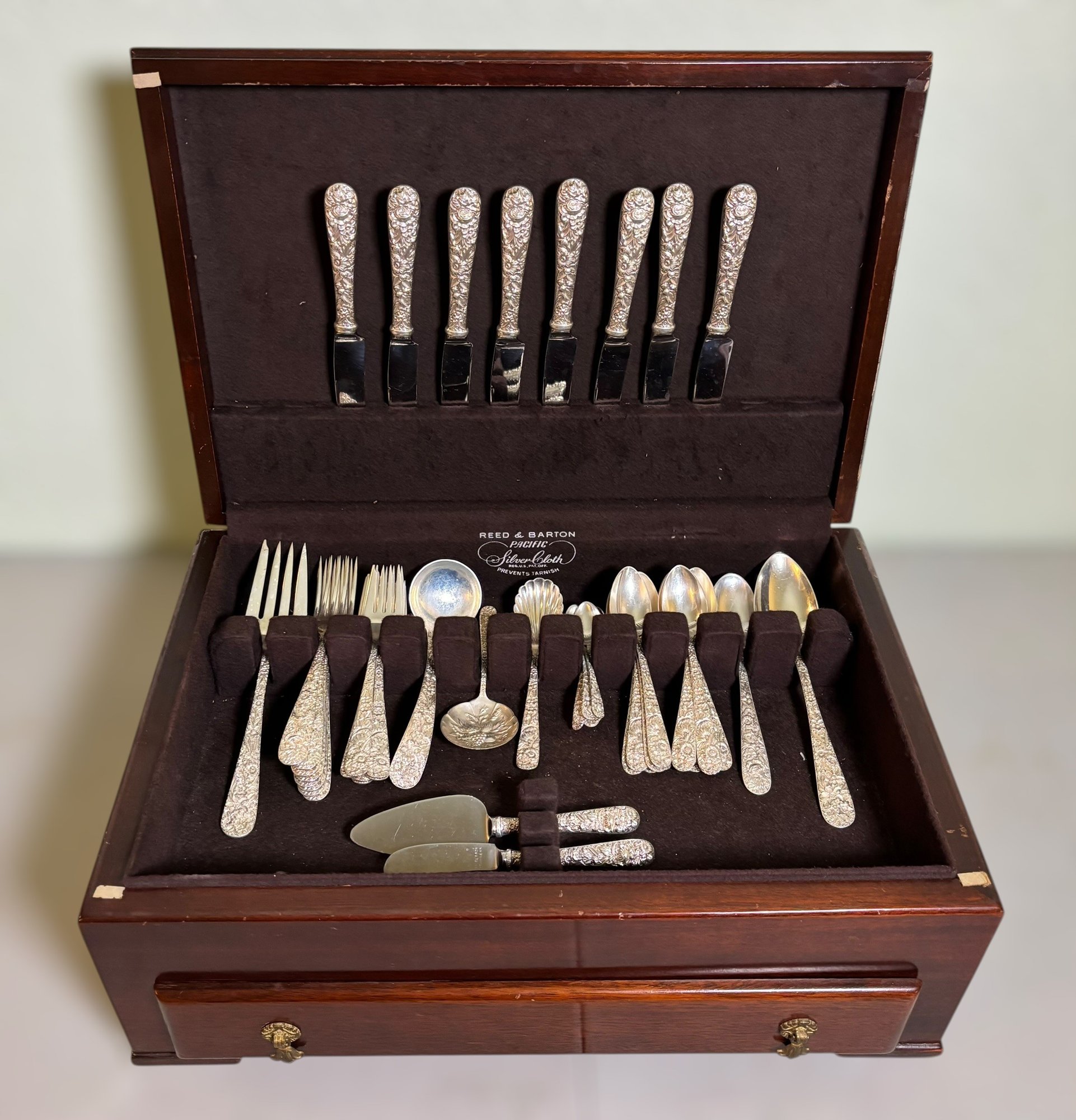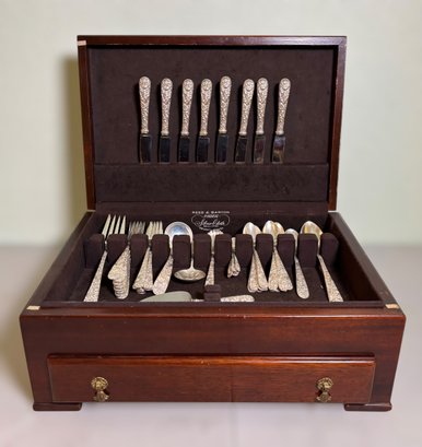 This set includes a variety of flatware and serving pieces, all housed in the original Reed & Barton tarnish-resistant chest.