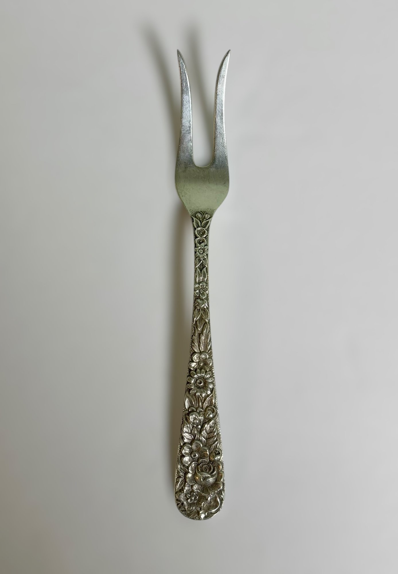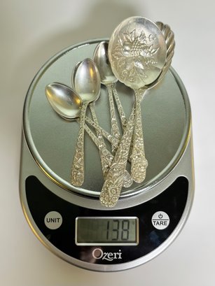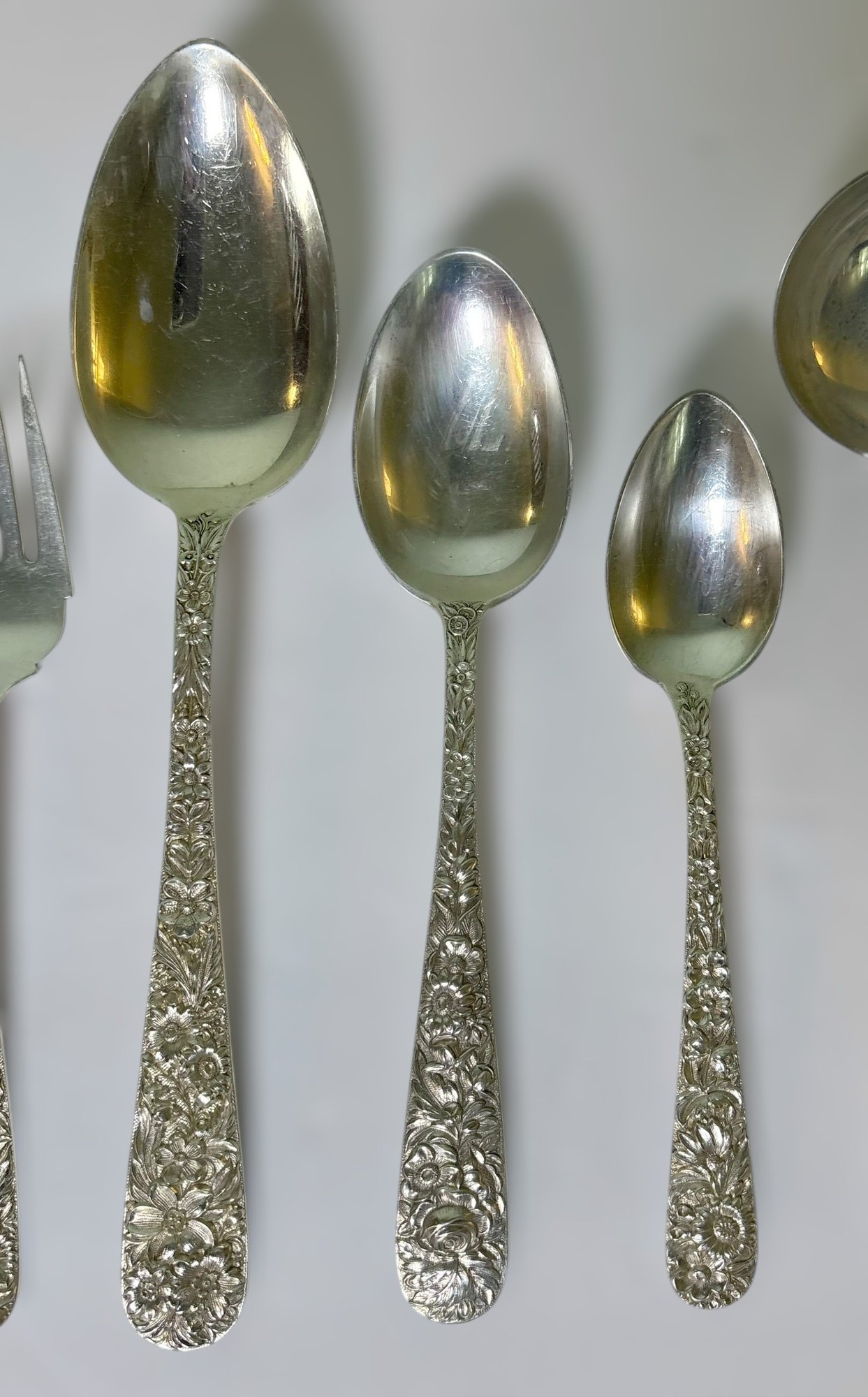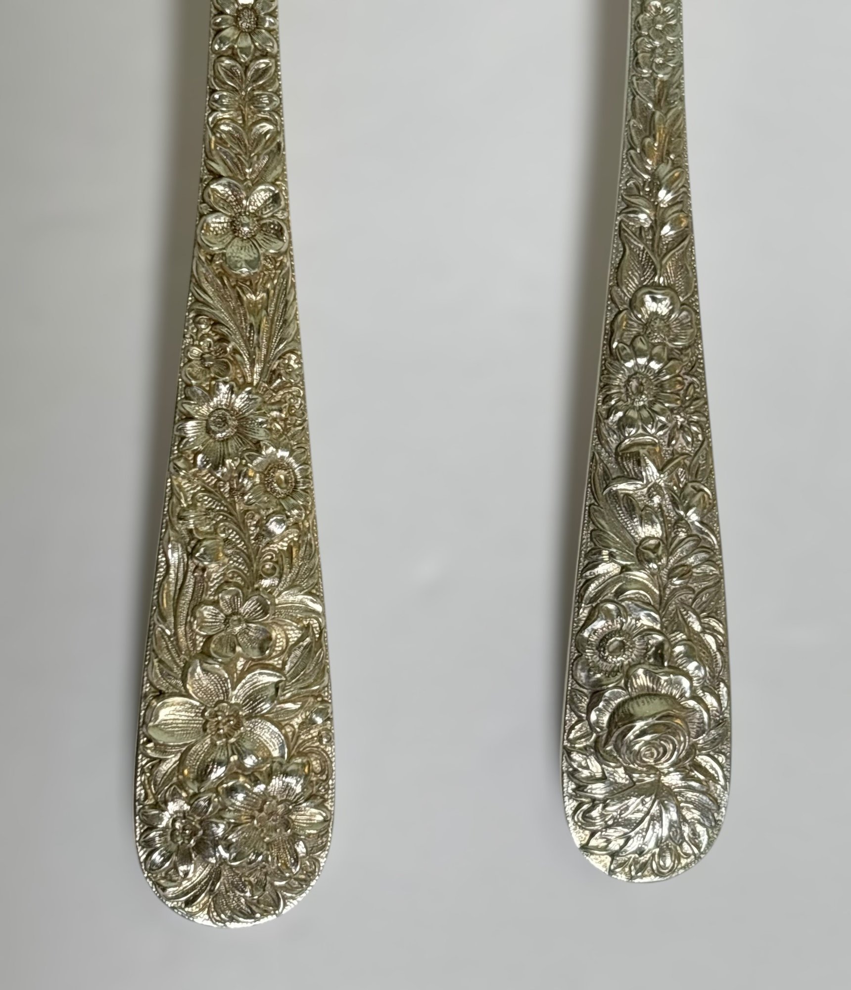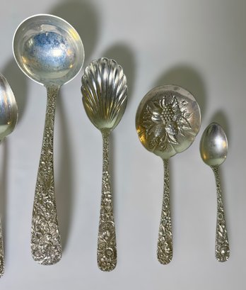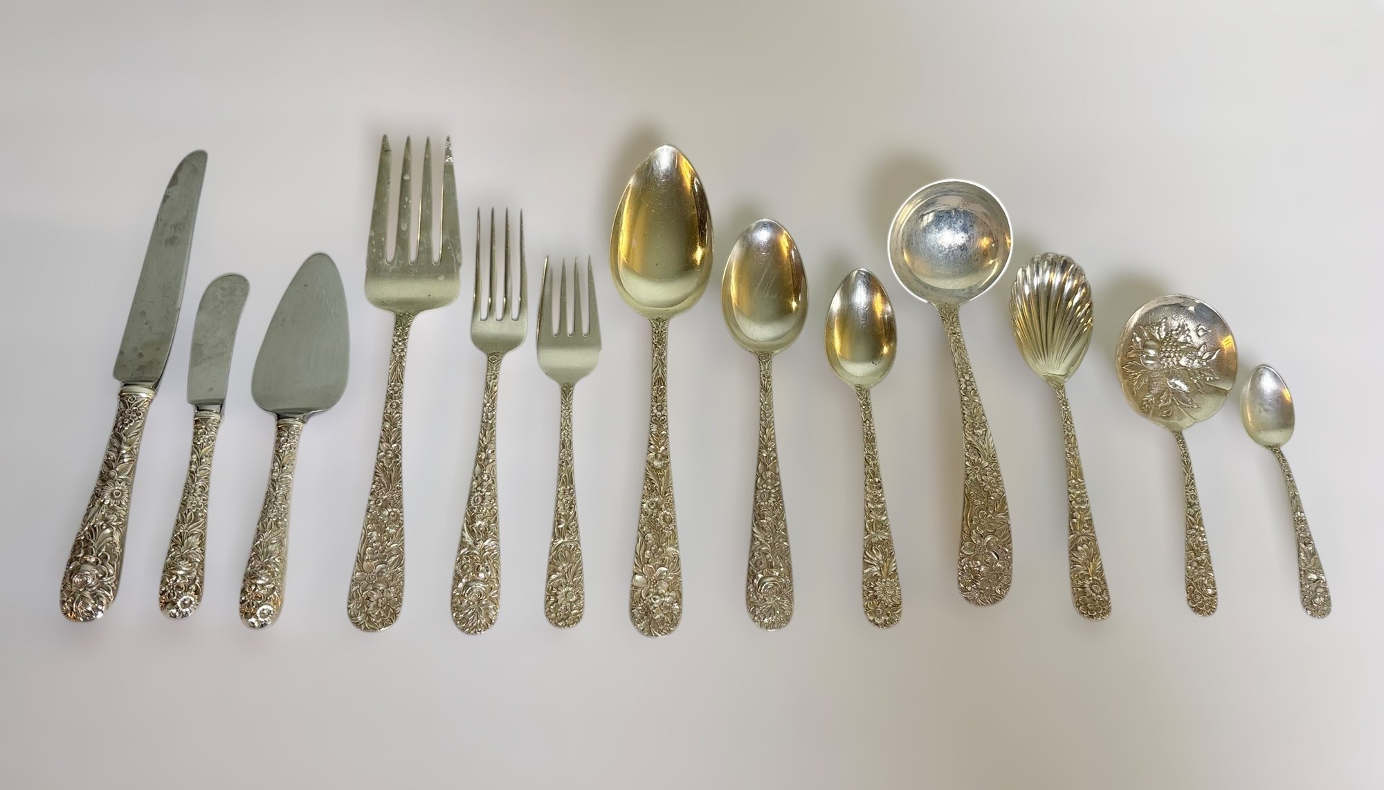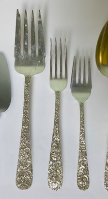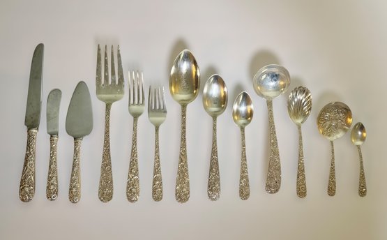 Stunning vintage S. Kirk & Son sterling silver flatware set featuring the iconic repoussé floral pattern, known for its deeply detailed hand-chased flowers and high craftsmanship.