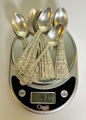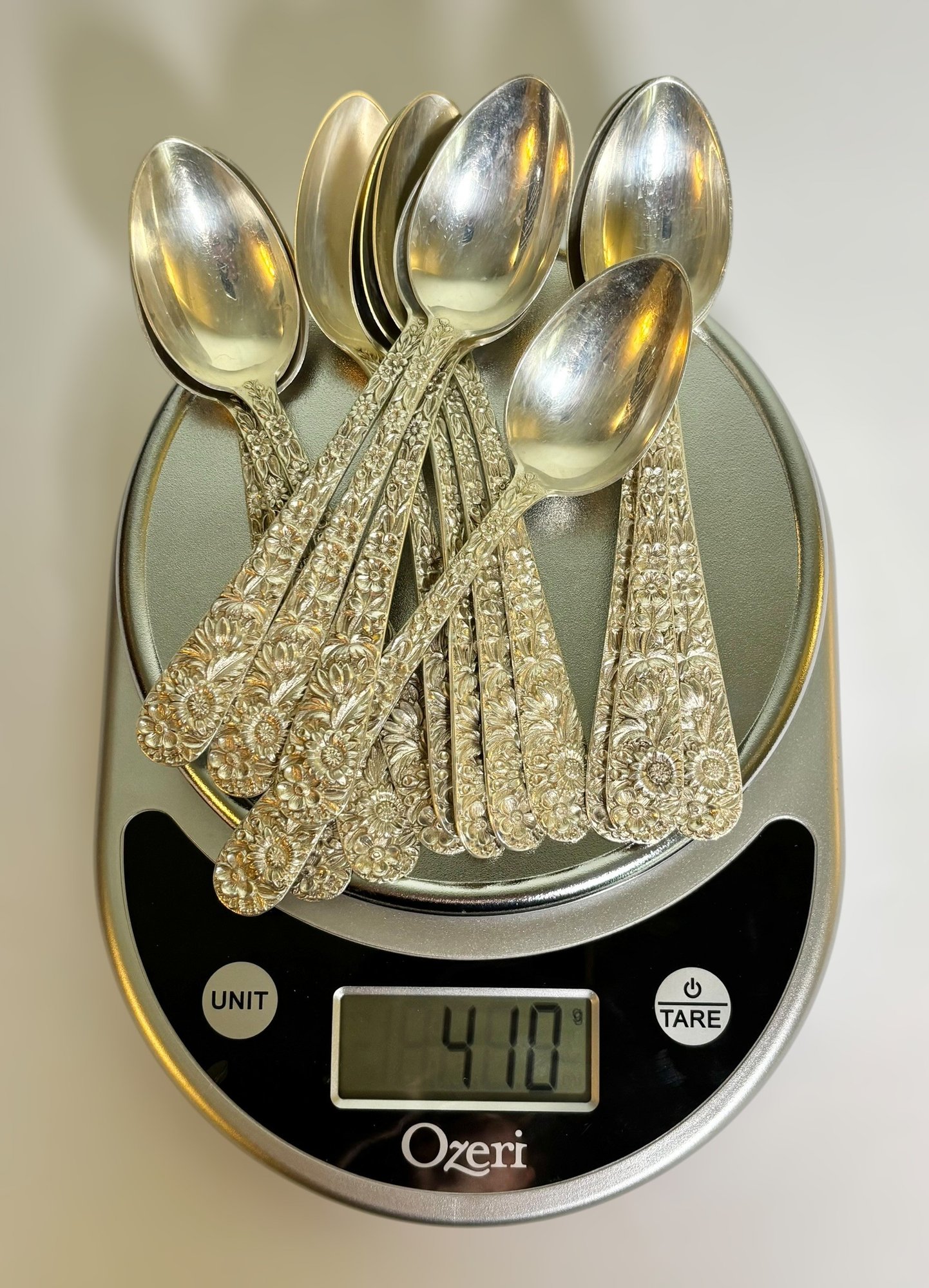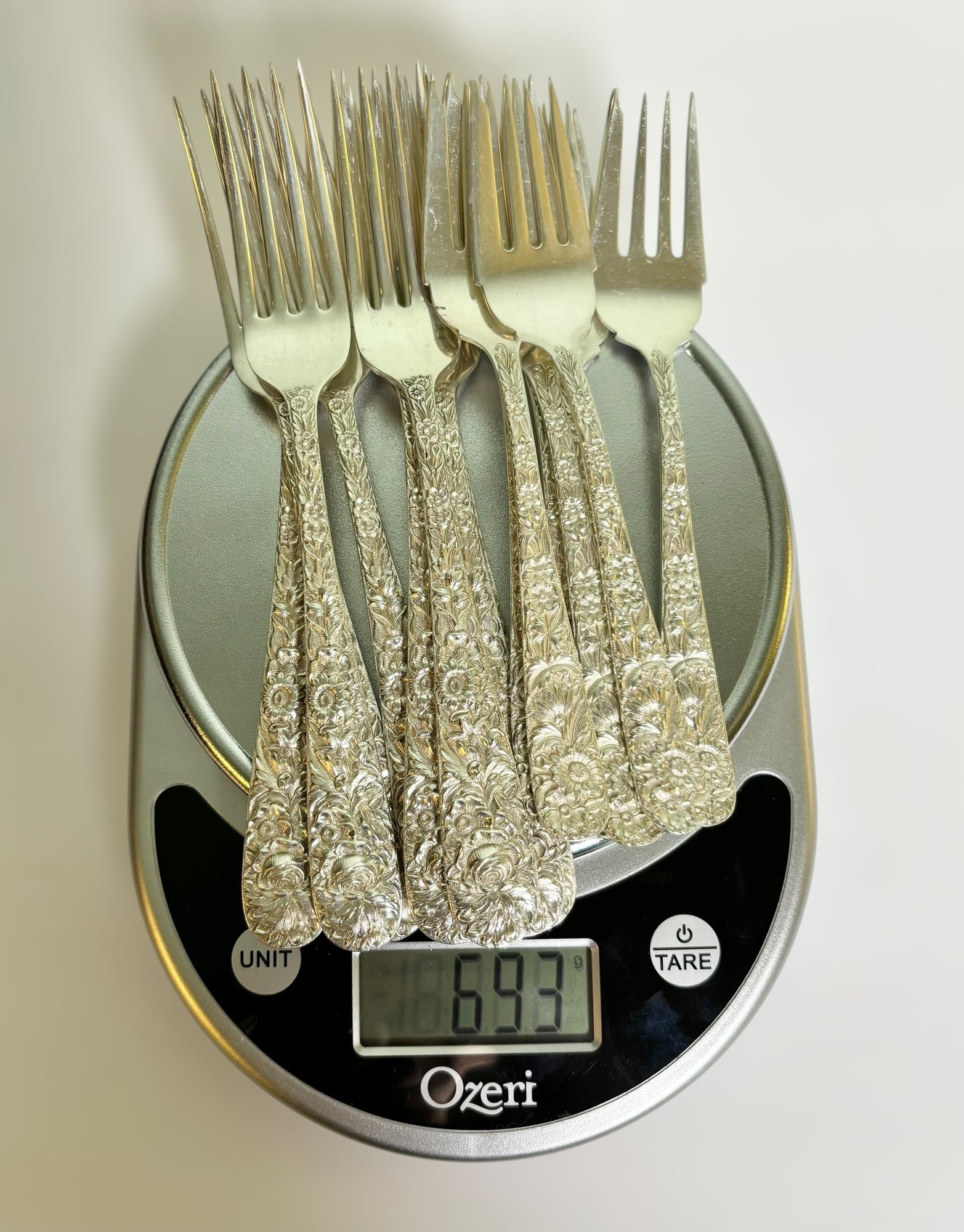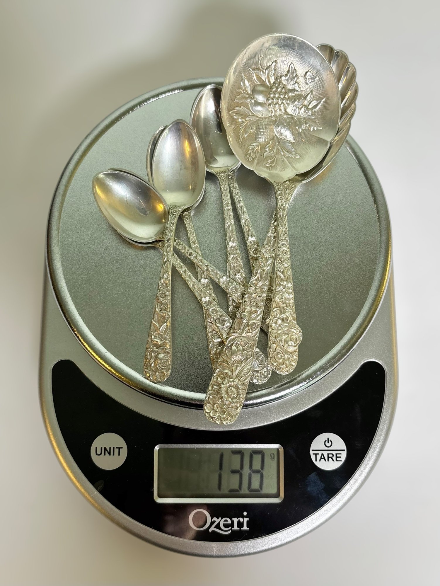 The silver weighs 2,088 grams all together. The weight includes the stainless steel on the butter knives & pie server.
