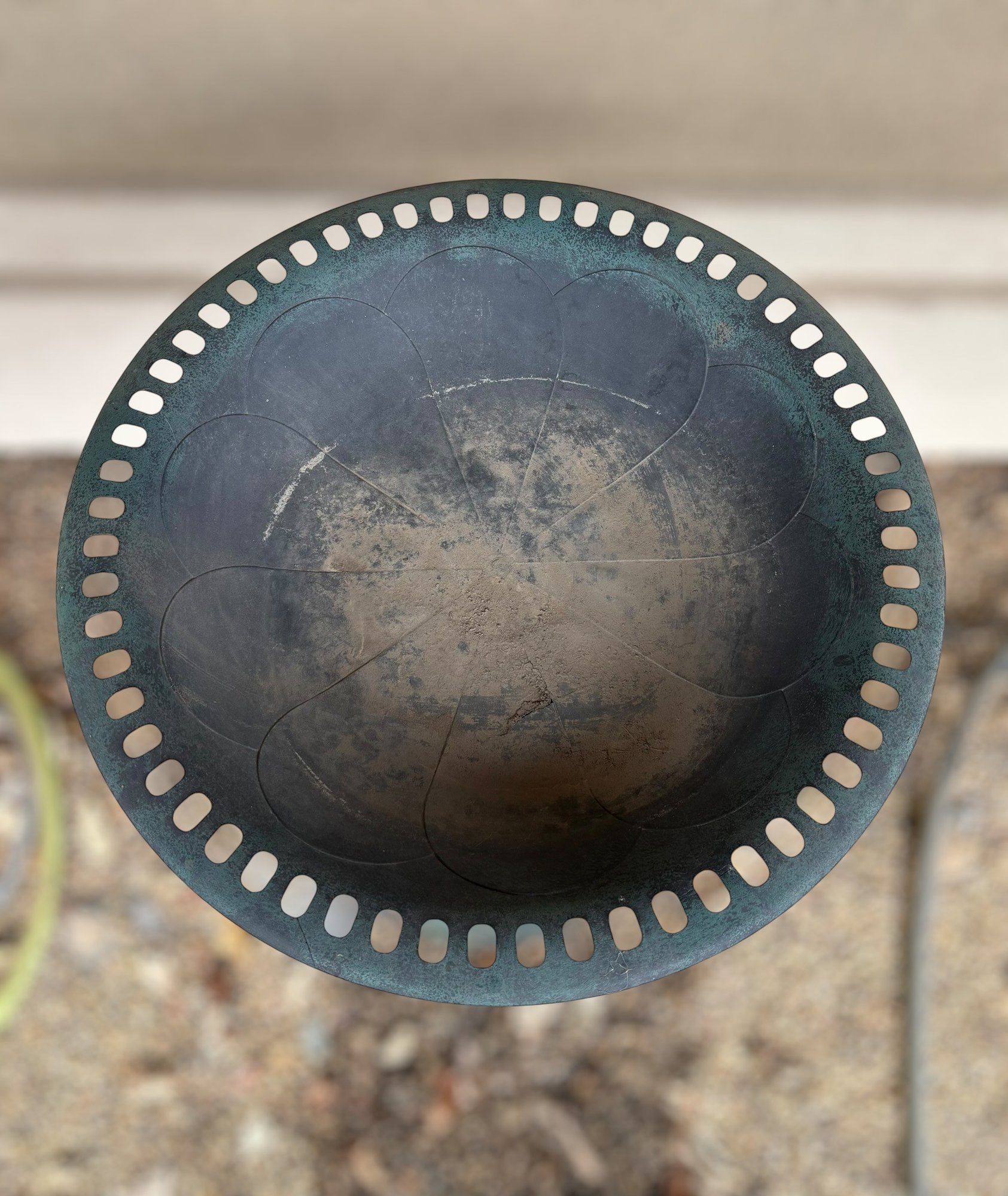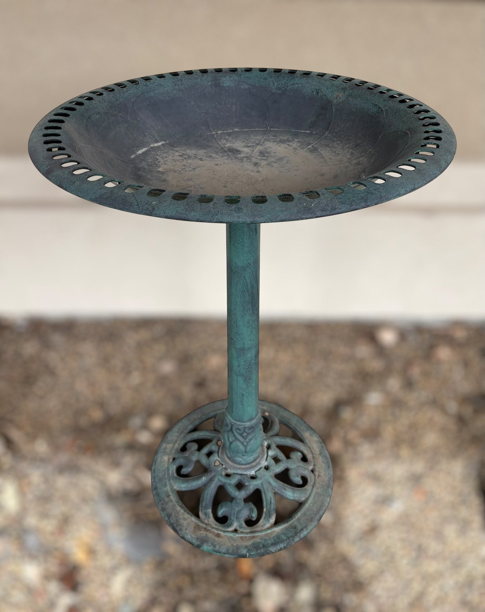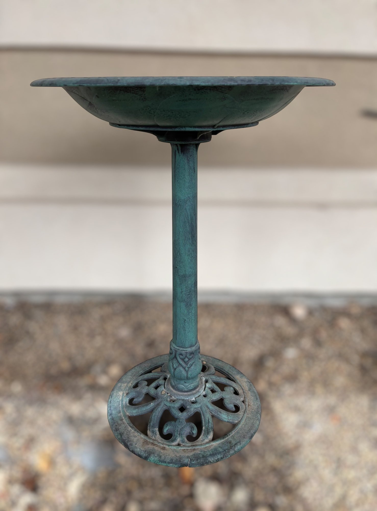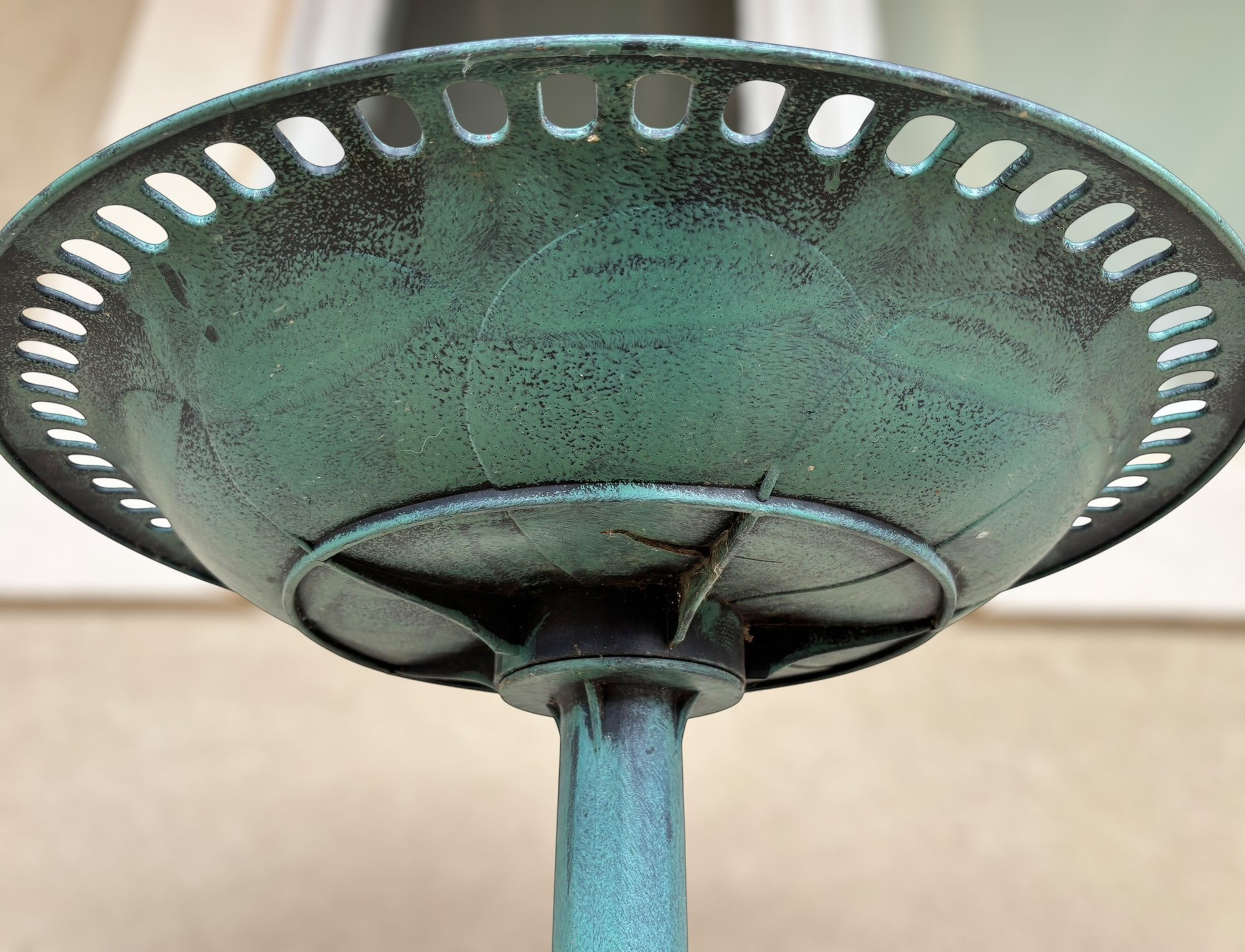 The birdbath has a minor crack in the bowl. There is moderate wear from being outside. Item needs to be cleaned. Please see images for condition.