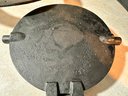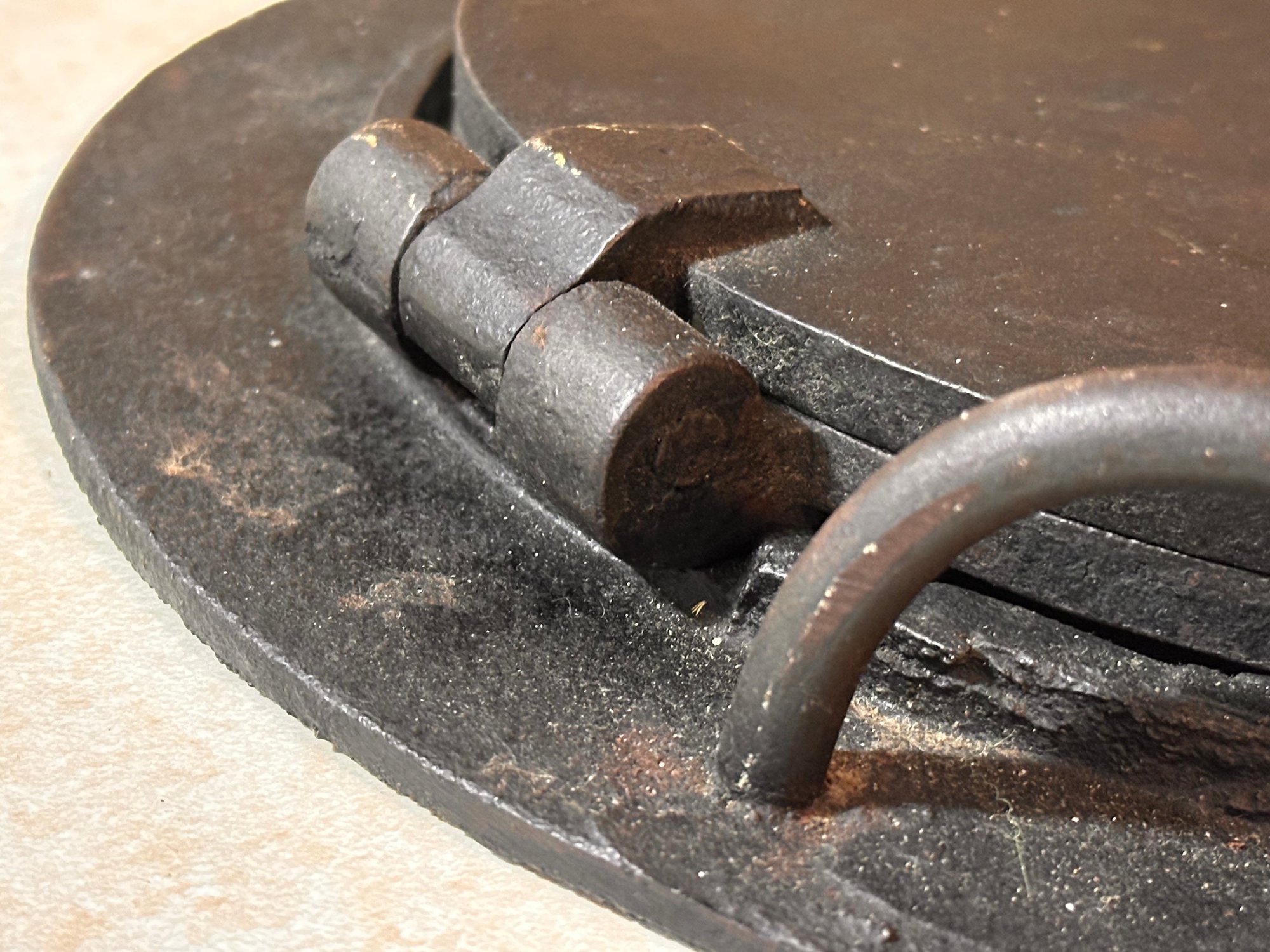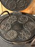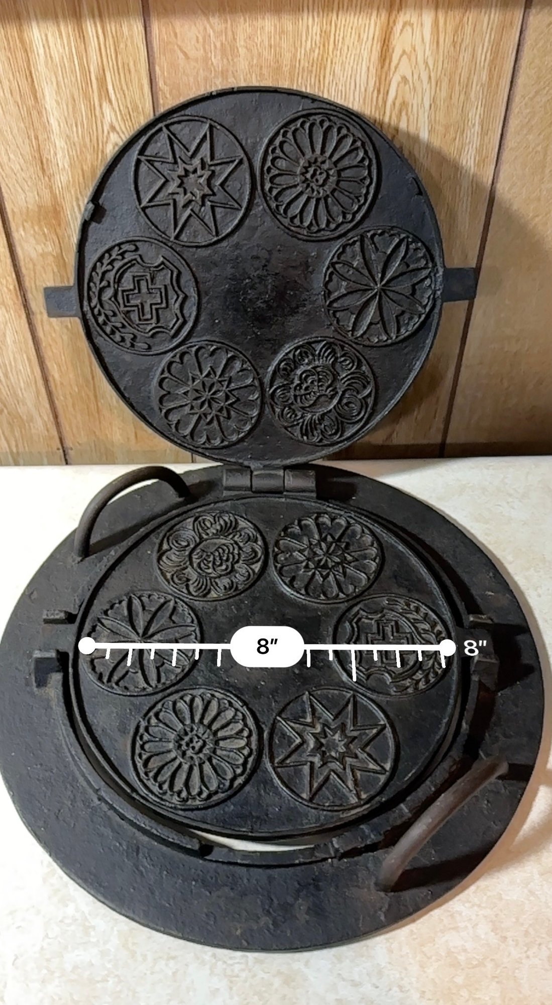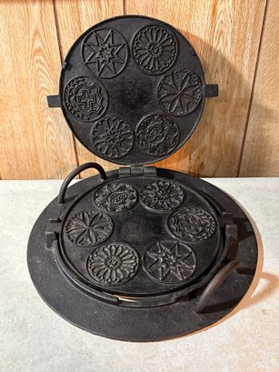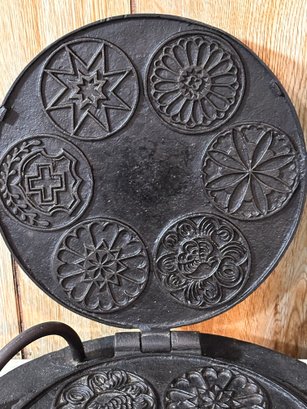 This iron features multiple small, distinct patterns on its plates for creating decorative cookies. It is a stovetop model, designed to be heated over a fire or burner. They are used for making thin crisp Italian waffle cookies.