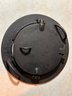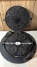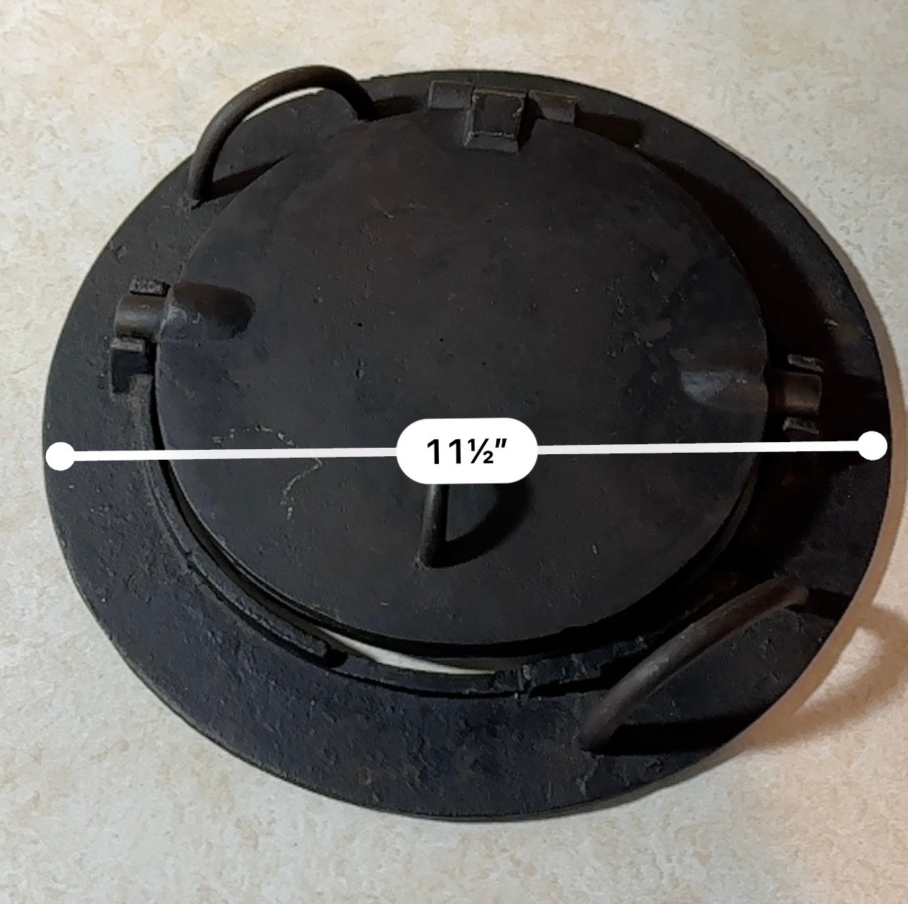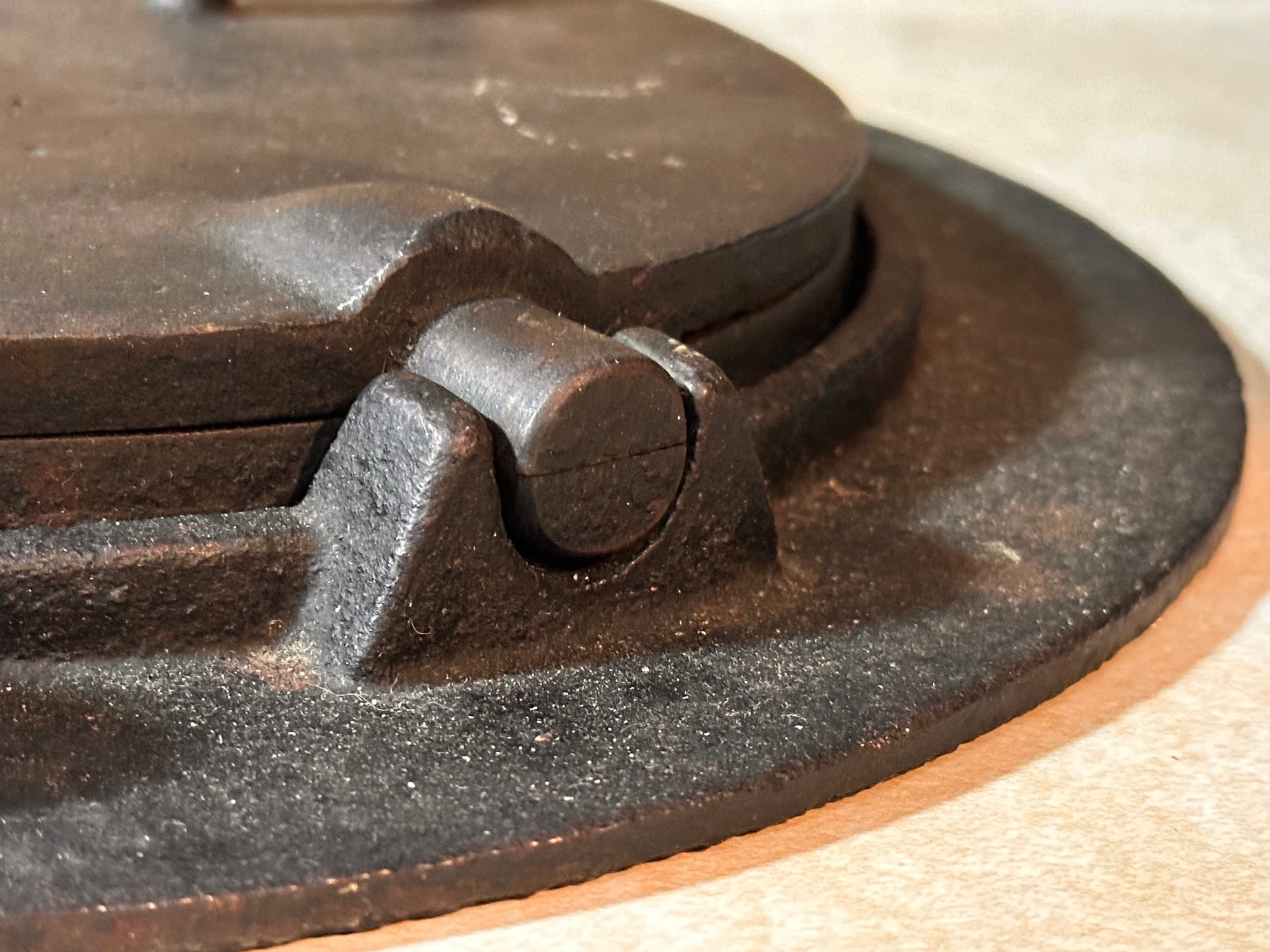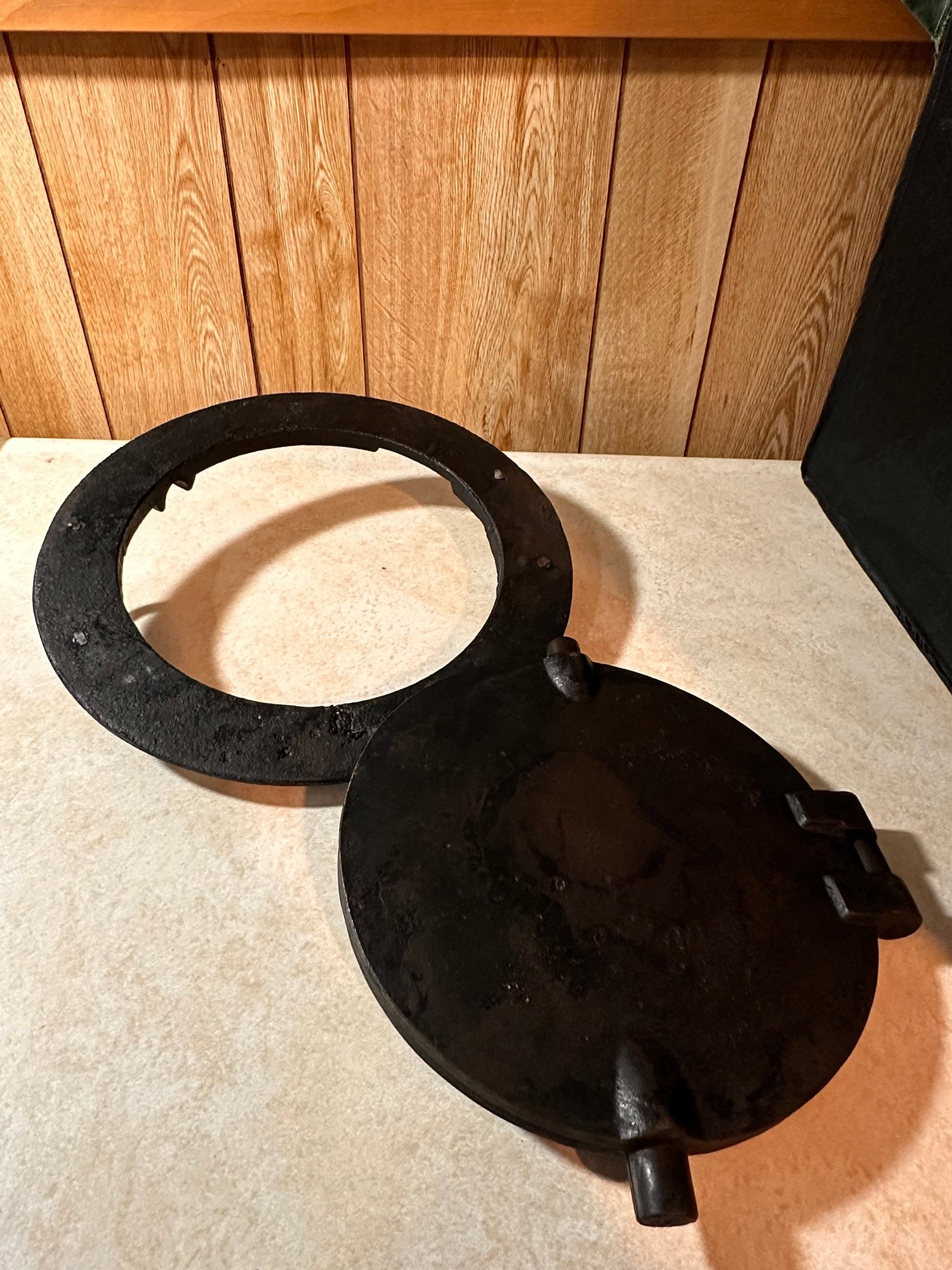 This iron features multiple small, distinct patterns on its plates for creating decorative cookies. It is a stovetop model, designed to be heated over a fire or burner. They are used for making thin crisp Italian waffle cookies.