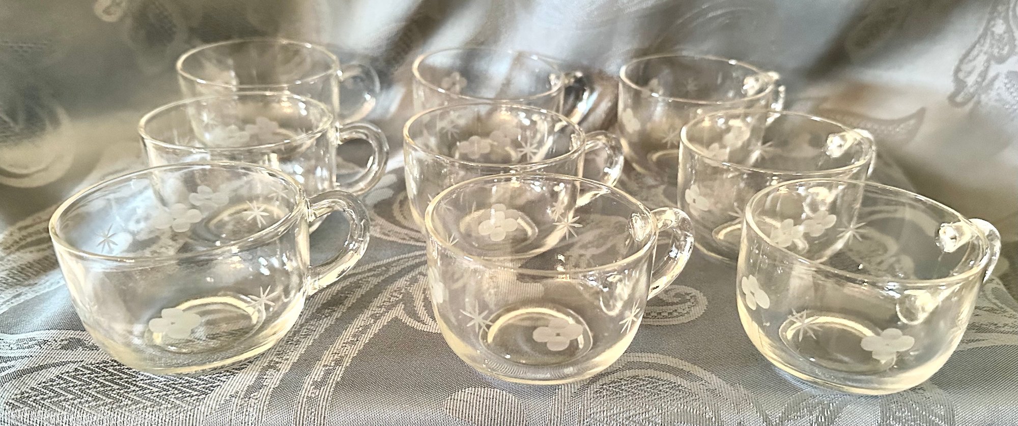 This set of 9 punch bowl cups features a lovely etched floral design.