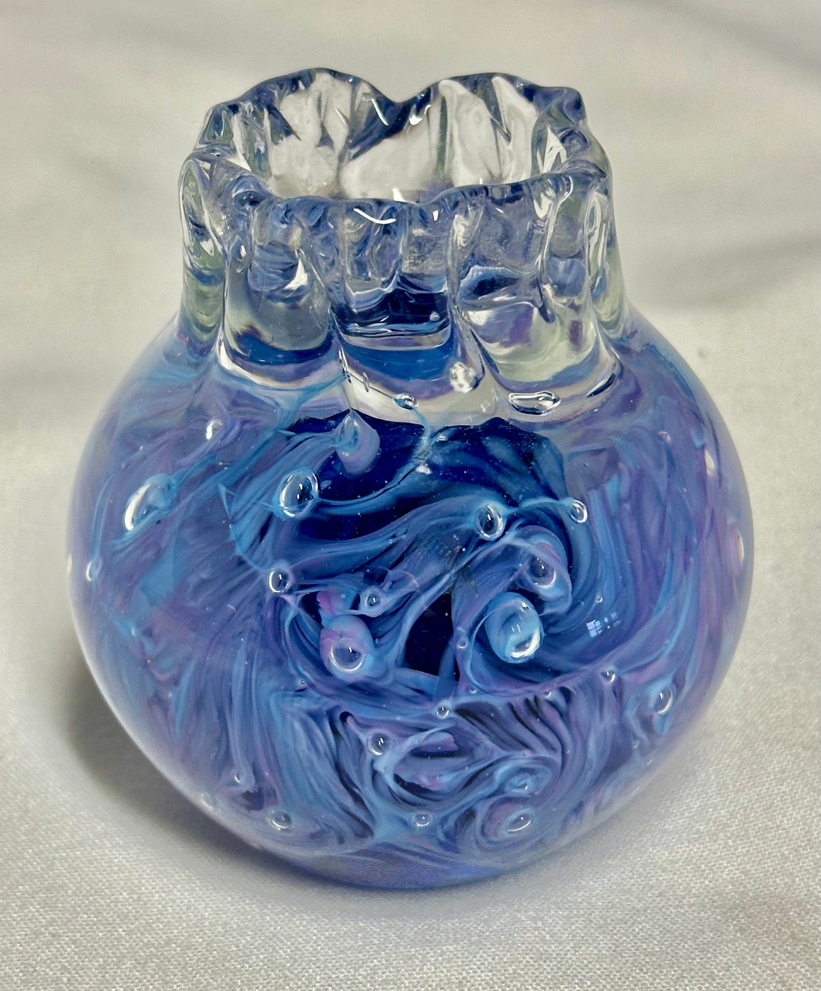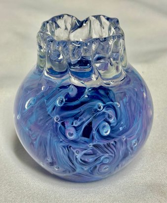 This is a lovely art glass bottle with blue swirls. Initialed by the artist on the underside.
