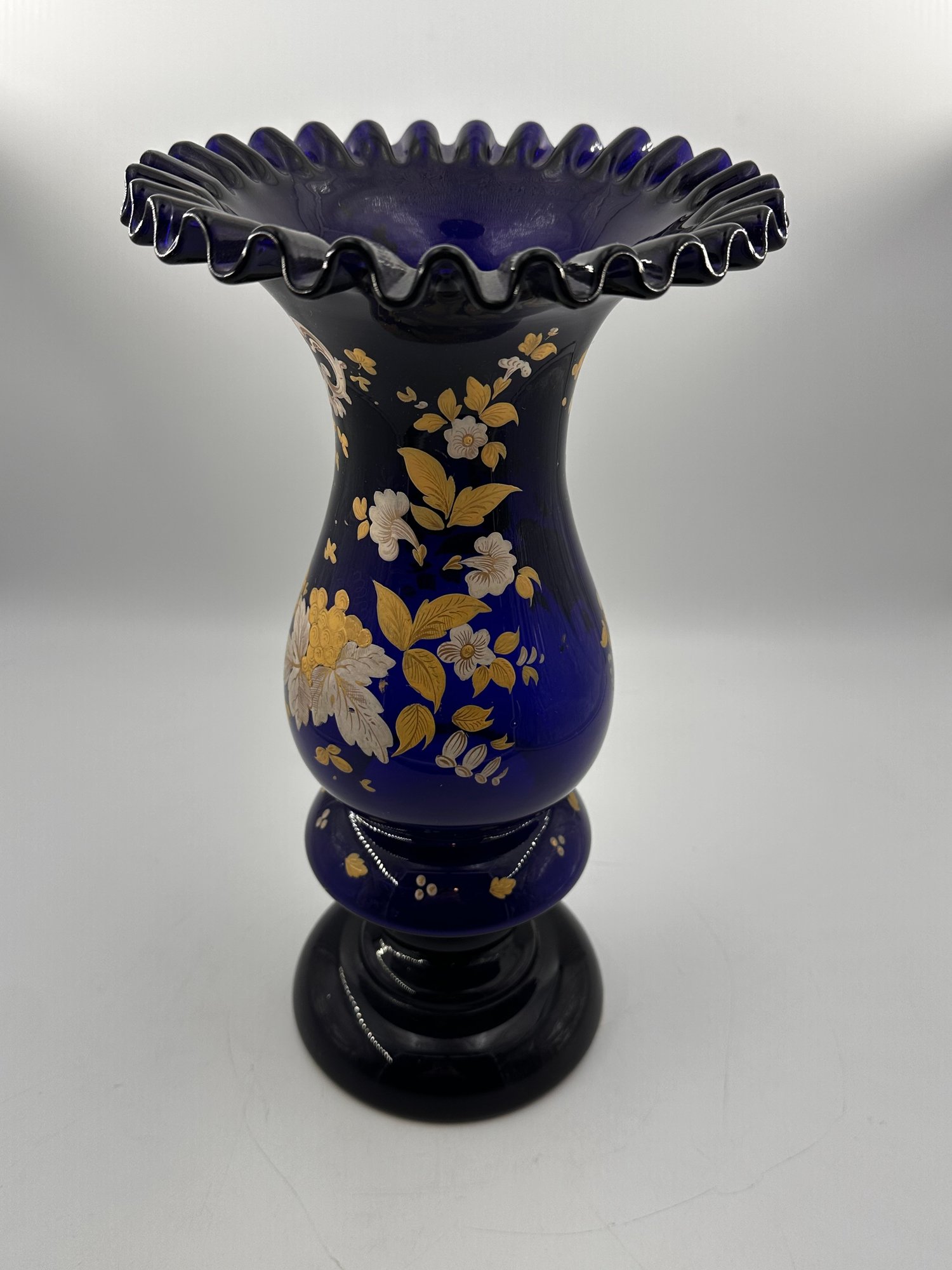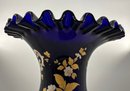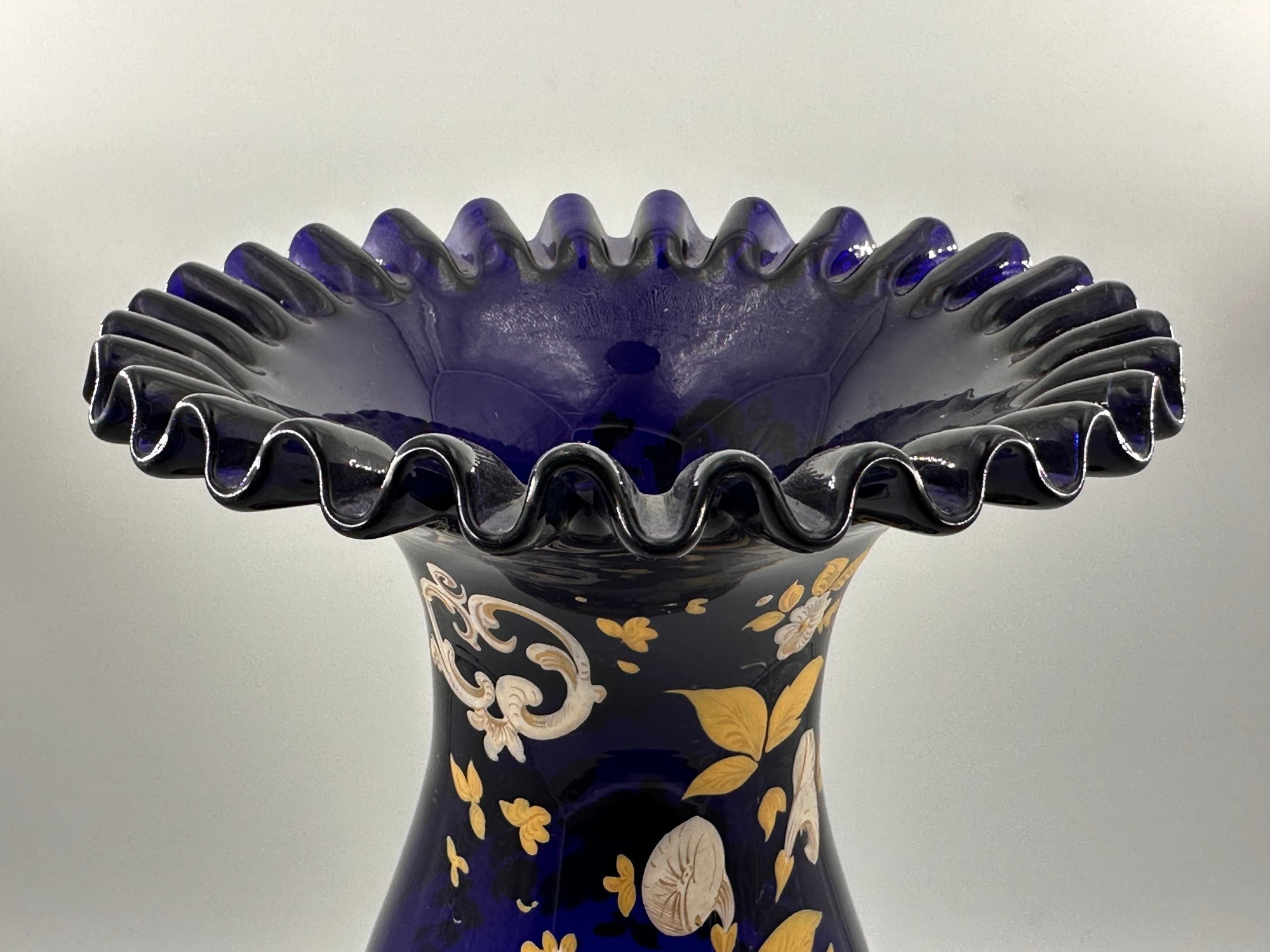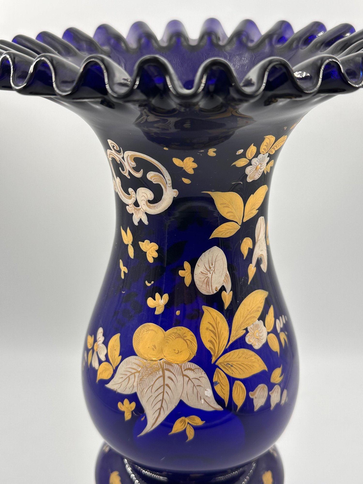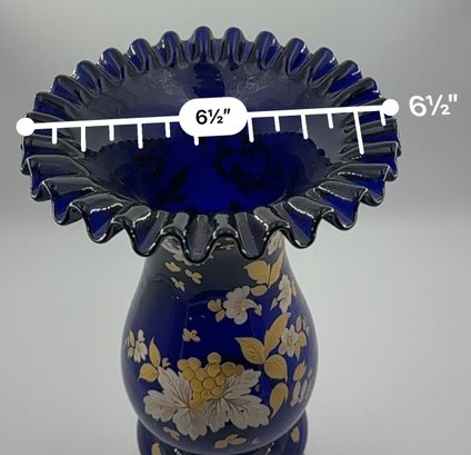 In the Bohemian-style, this heavily ruffled-edged vase in a stunning cobalt blue with an equally off-setting gold floral design, would make for a grand centerpiece for your table setting or shelving display.