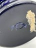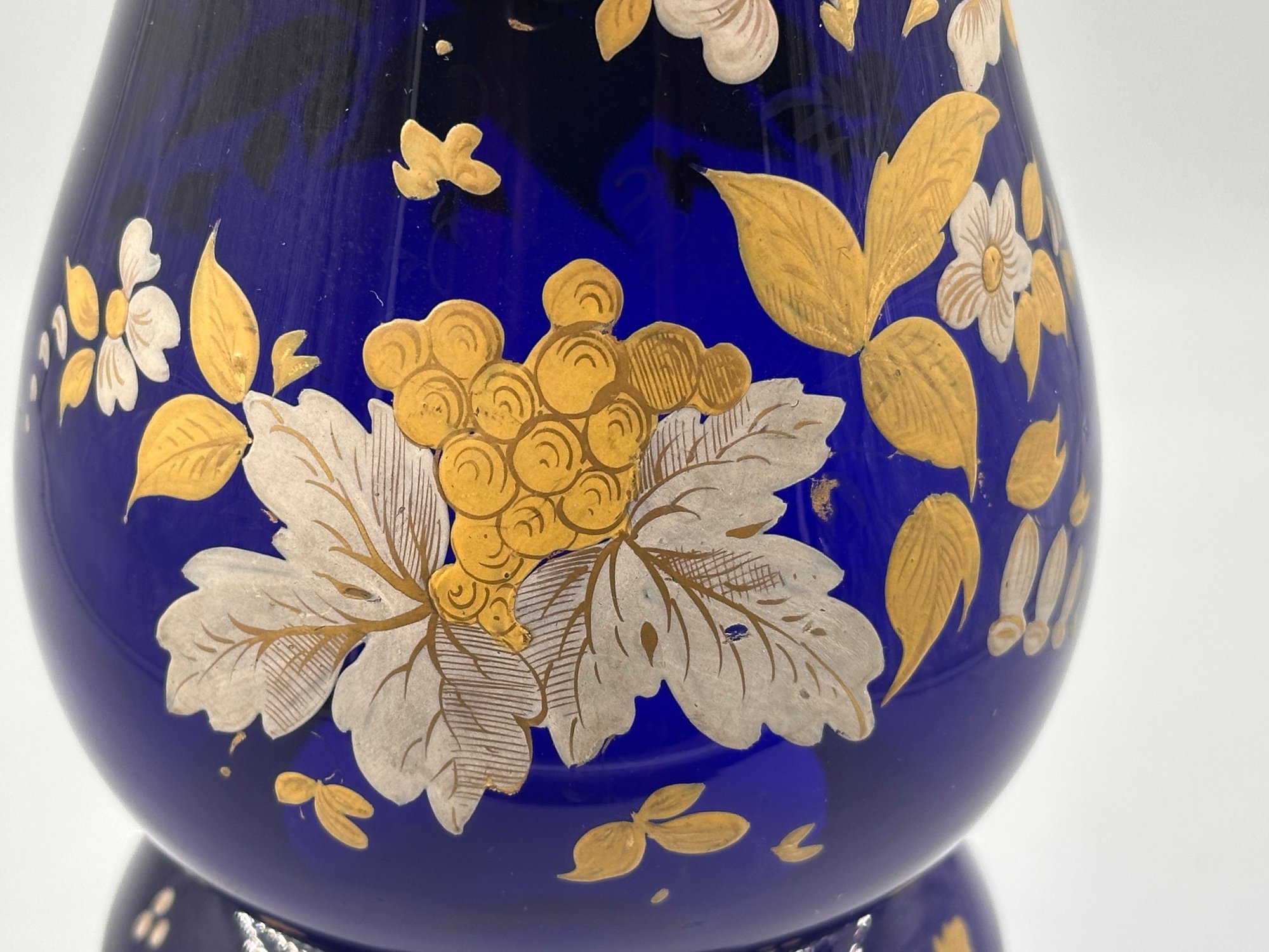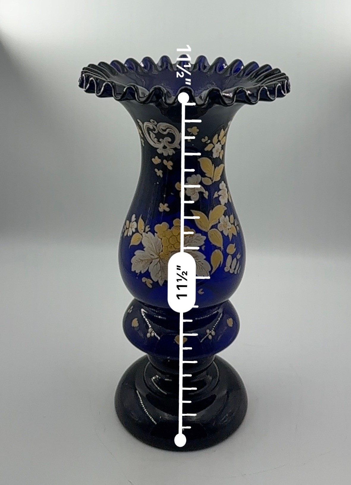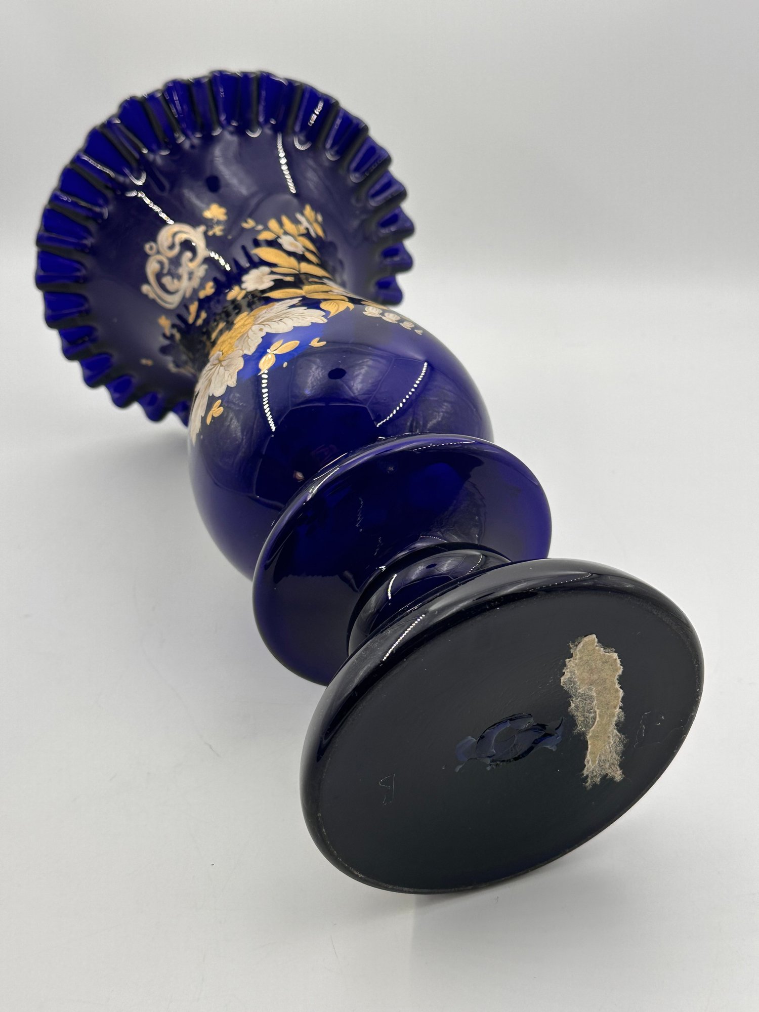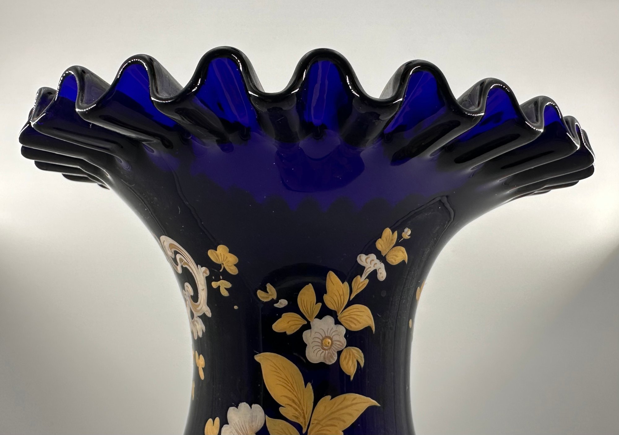In the Bohemian-style, this heavily ruffled-edged vase in a stunning cobalt blue with an equally off-setting gold floral design, would make for a grand centerpiece for your table setting or shelving display.