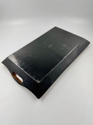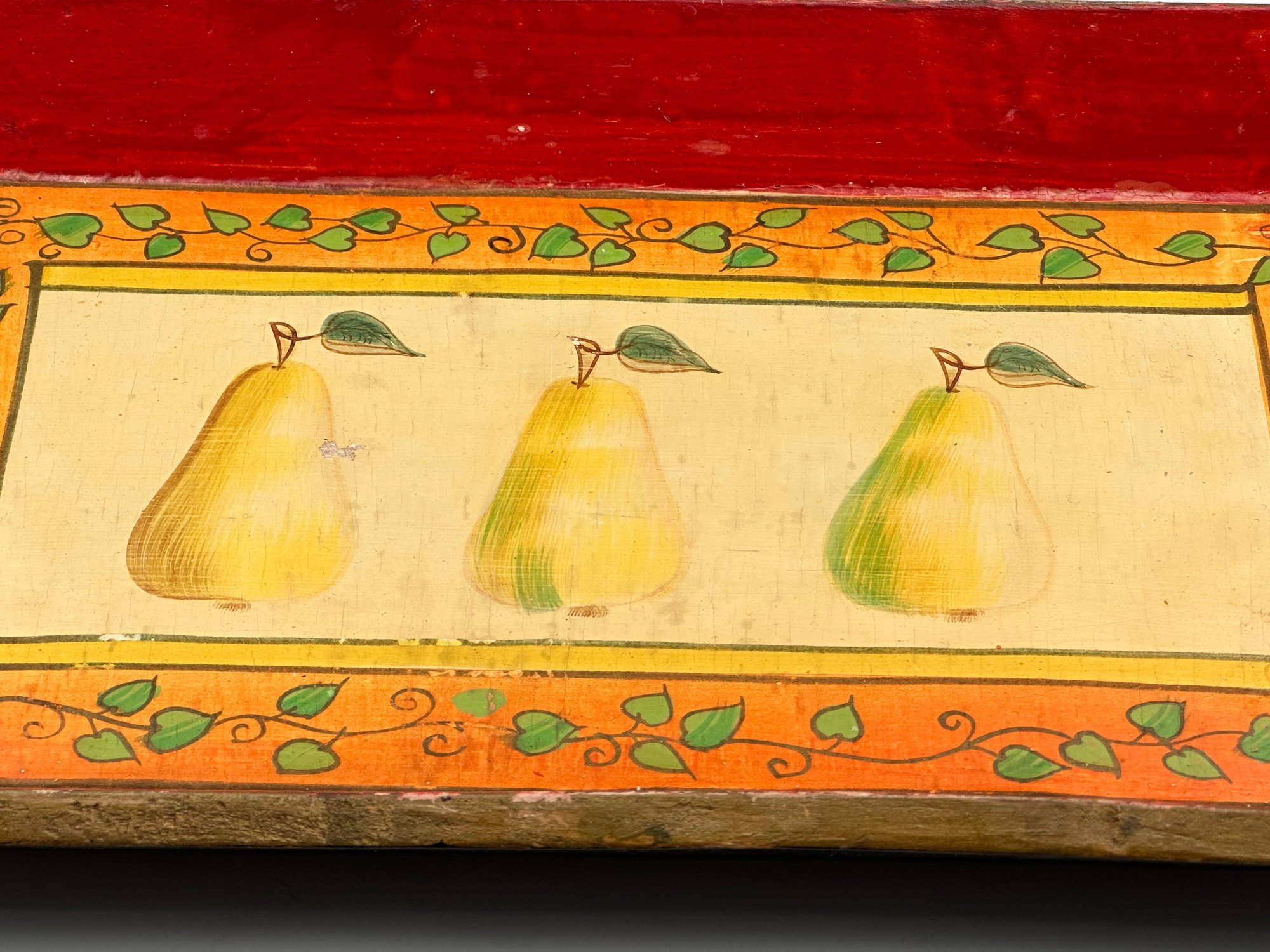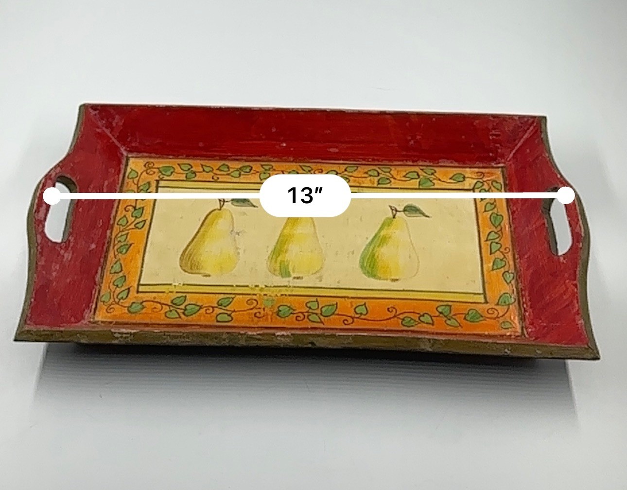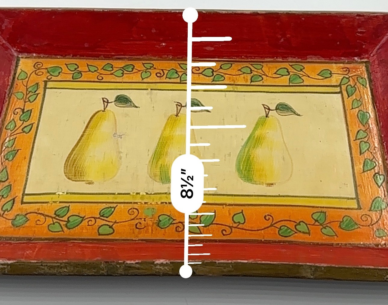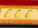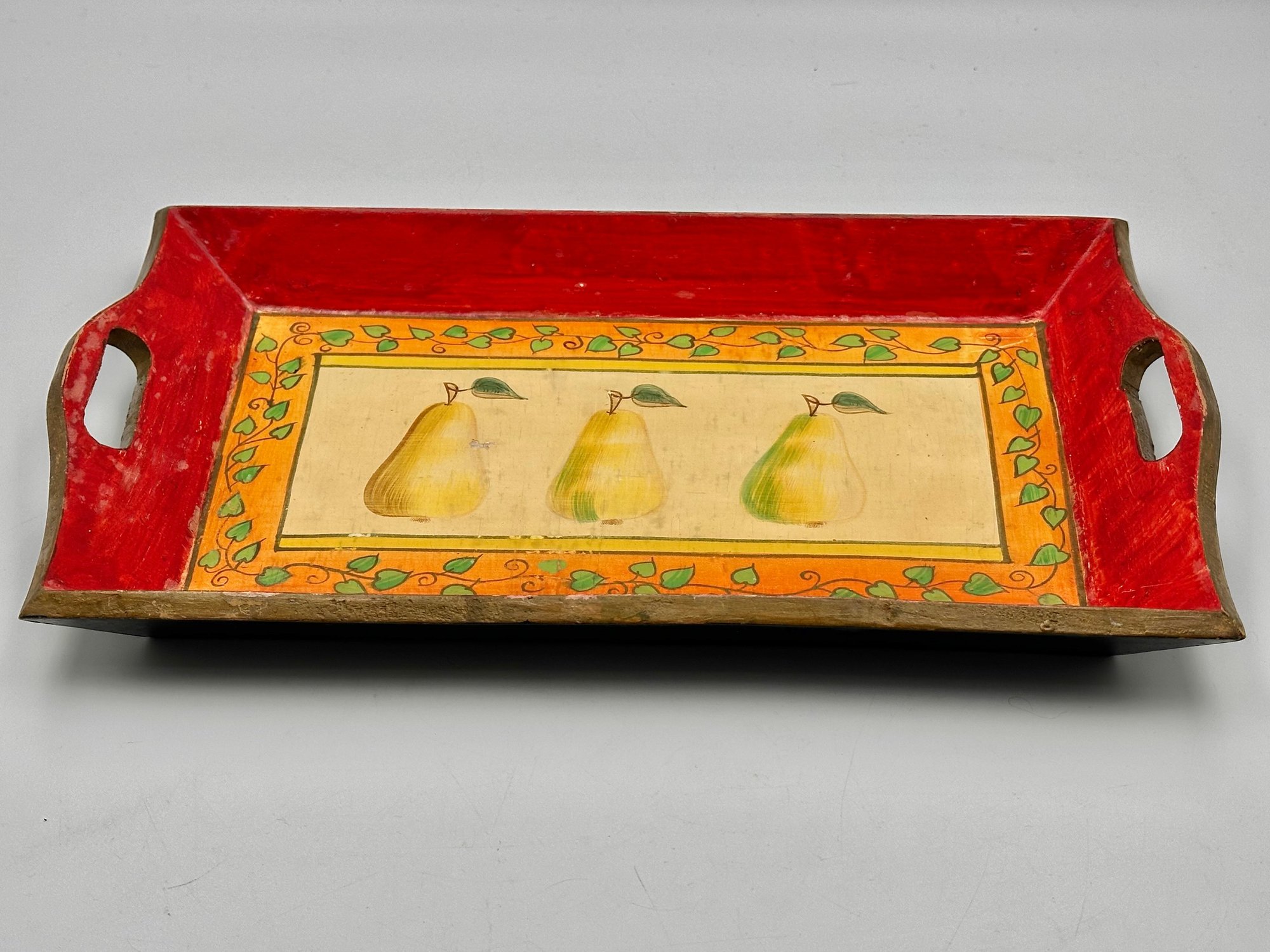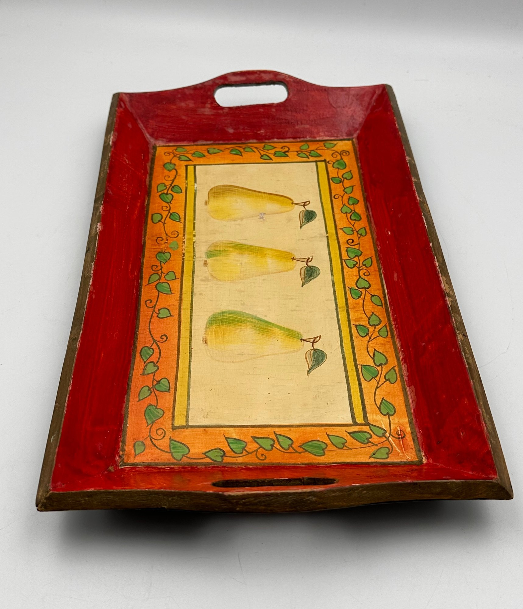 This is a lovely wooden serving tray featuring a decorative design with three pears in the center of the tray.