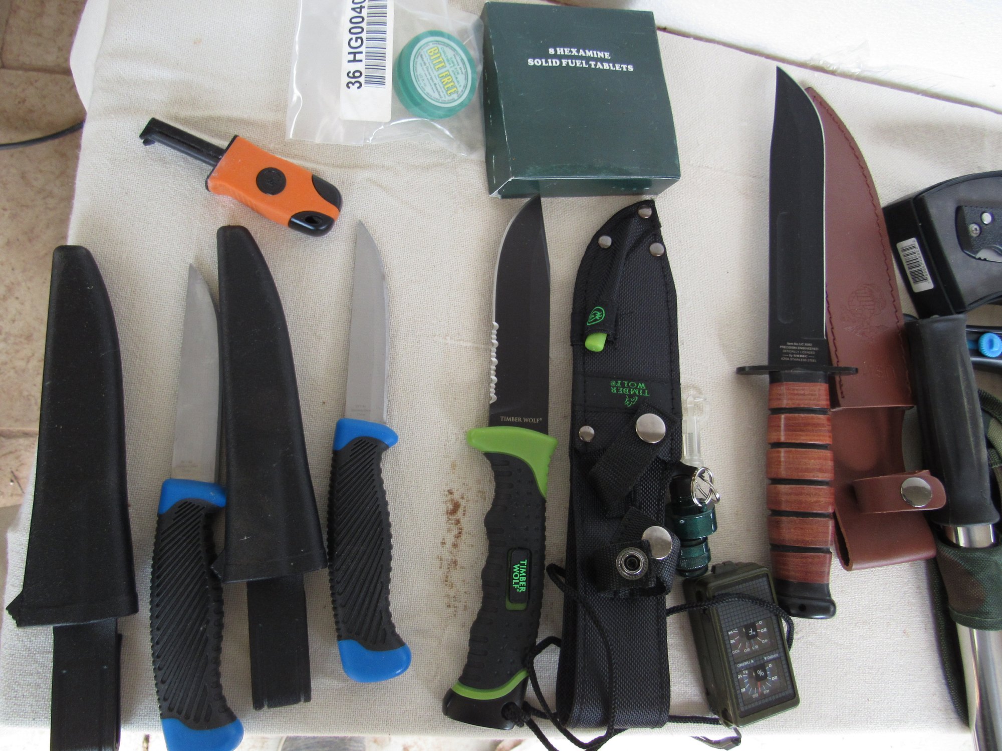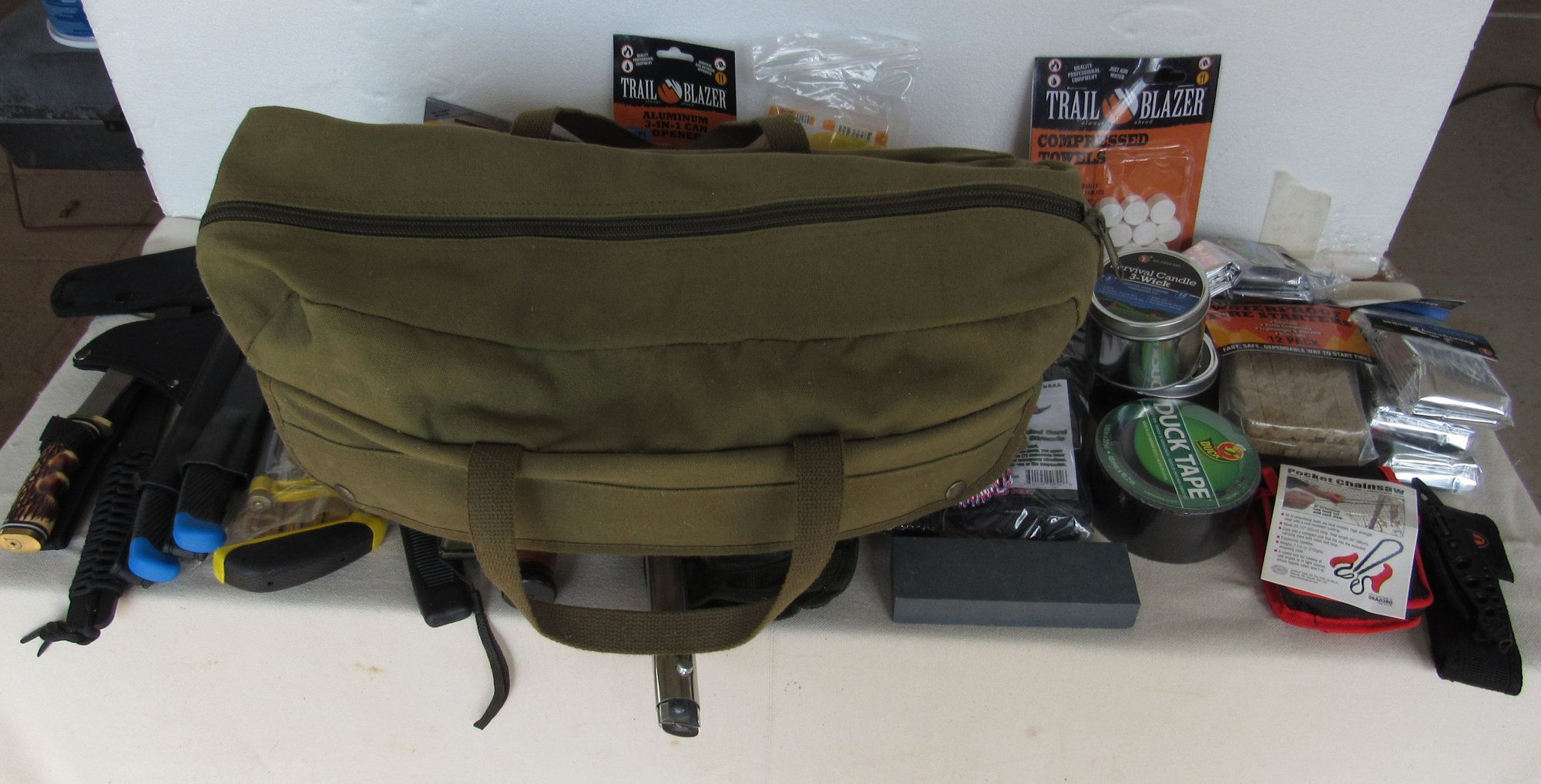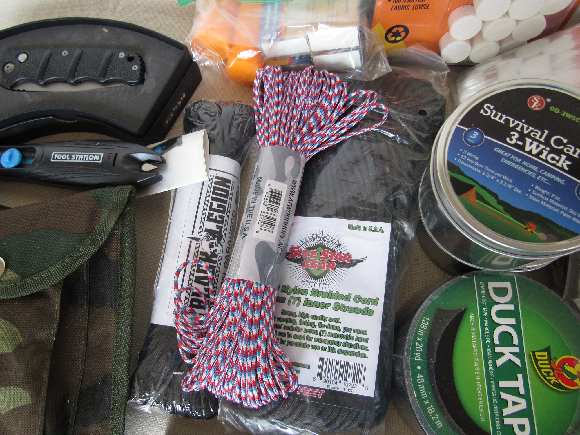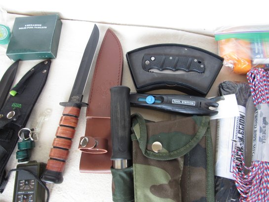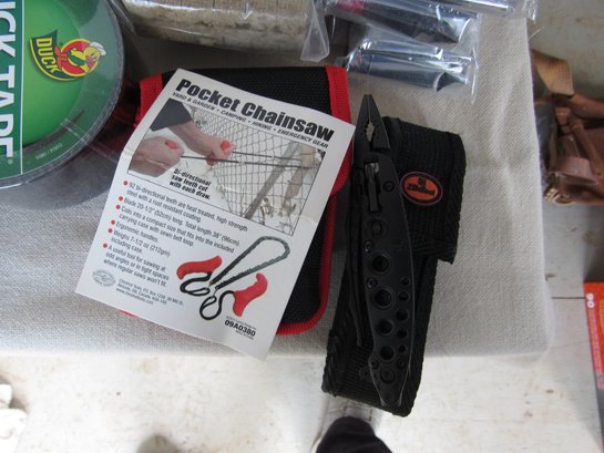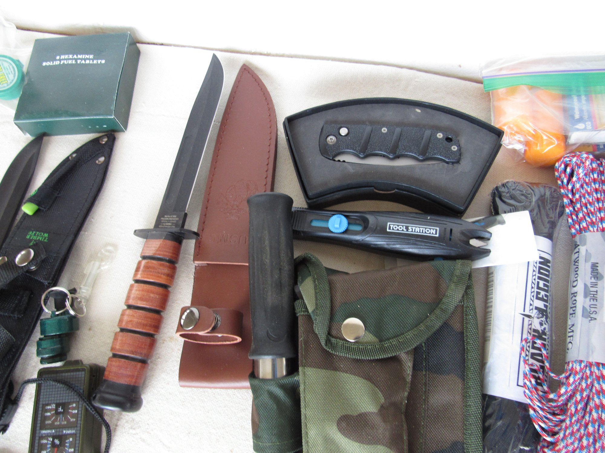 Has, rope. knife, tape, things to light a fire and a lot more
