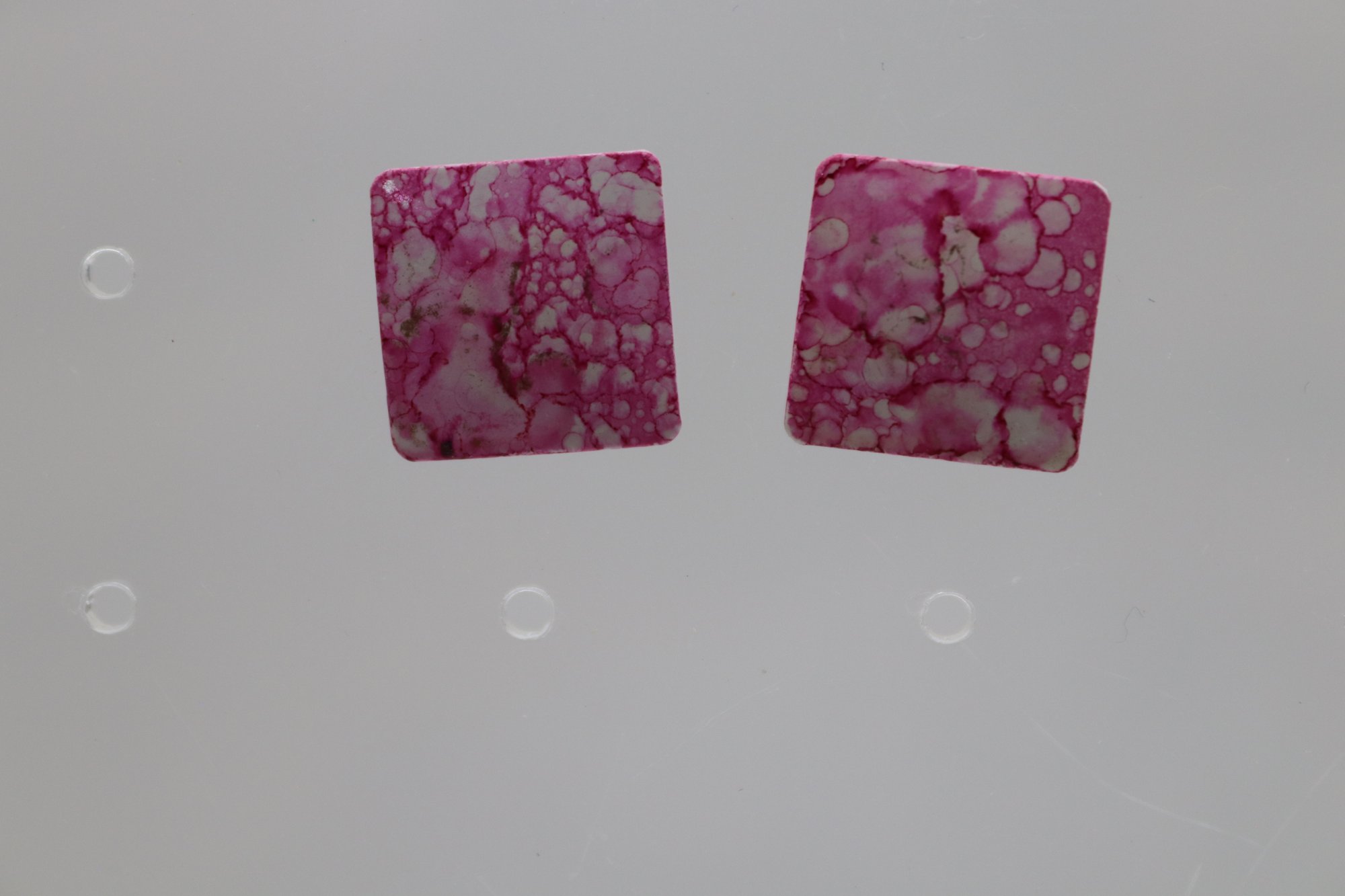 Stand out with these captivating square stud earrings, featuring an abstract pink resin design that resembles miniature artworks. The vibrant pattern within the resin evokes a modern, painterly style, while the square shape offers a geometric flair. These earrings are the perfect accessory to add a splash of color and artistic charm to any ensemble.