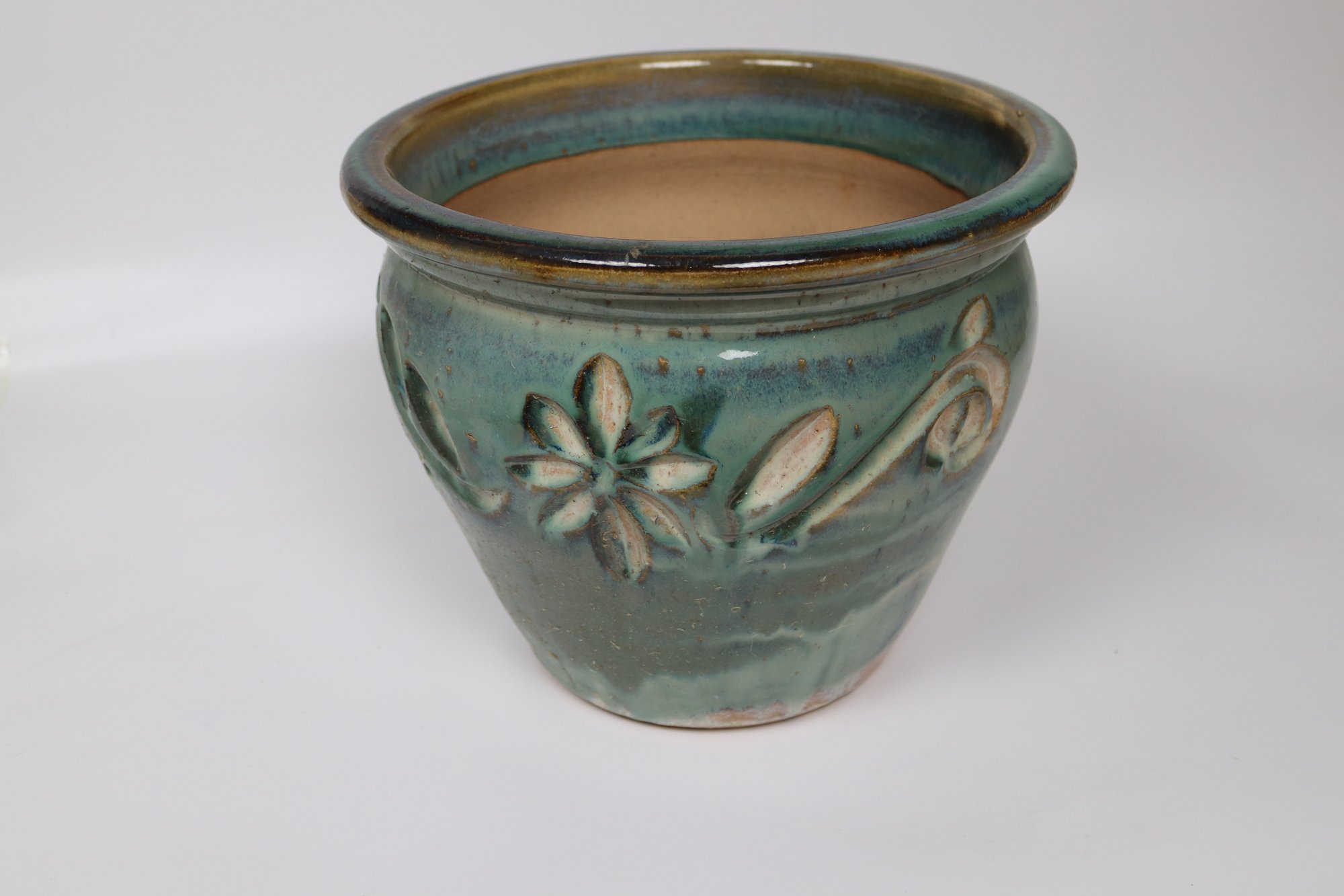 his handcrafted stoneware planter exudes rustic charm with its robust silhouette and earthy glaze finish. The intricate floral and swirl reliefs adorning its exterior are a testament to its artisanal origins. Measuring approximately 9 inches in diameter and 8 inches in height, this pot is perfect for showcasing your favorite blooms or herbs. The rich, variated blue glaze is a striking contrast against the natural tones of any foliage, making it a statement piece for any garden or home.