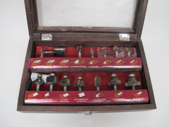 Essential woodworking router bit set, includes multiple bit types, and organized in a sturdy wooden storage case. Ideal for professionals and hobbyists.