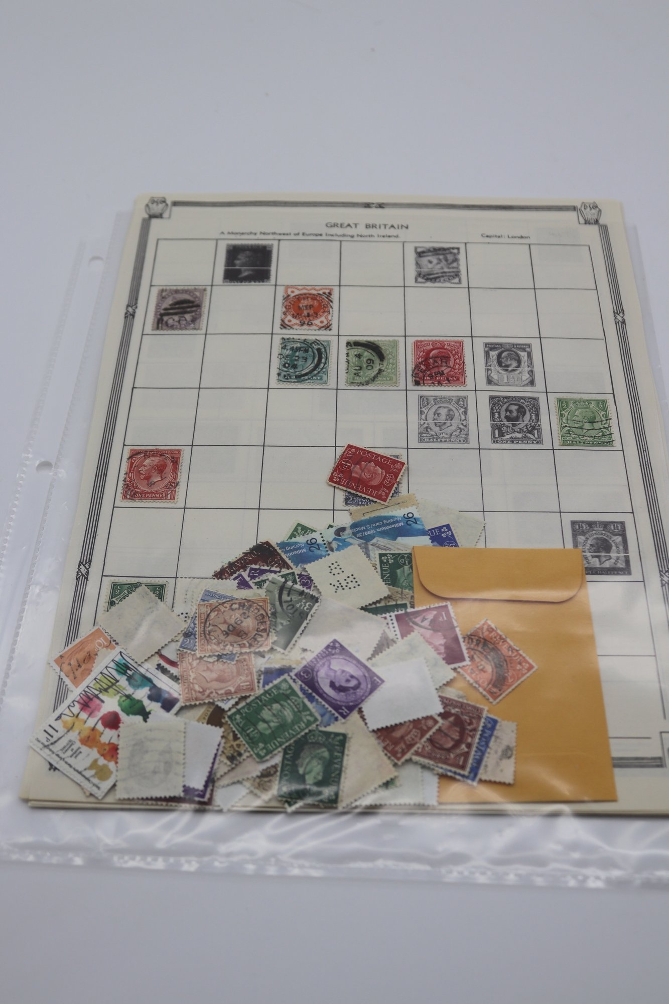 Presenting a fascinating assemblage of vintage British stamps, this lot is a philatelist's dream. It features a diverse selection of stamps that paint a rich portrait of Great Britain's storied postal history. From definitive to commemorative issues, these stamps range in design, featuring iconic British imagery and monarchical portraits. The collection is housed on a collector's page, with additional loose stamps, suggestive of a passionate collector's long-standing dedication to philately.