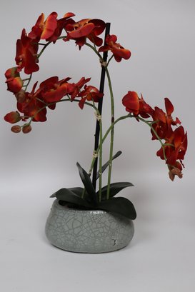 This lot presents a stunning faux red Phalaenopsis orchid arrangement, a testament to the harmonious intersection of art and nature. Crafted with meticulous attention to detail, each petal and leaf exhibits a life-like texture and vibrant color, creating a perennially beautiful display. The orchids arc gracefully, reaching heights up to 20 inches, supported by slender stems that affirm the sculpture's authenticity. The arrangement is nestled in an artisanal ceramic pot, showcasing a subtle crackle glaze that speaks to its handcrafted origin, adding to the item's sophisticated allure.