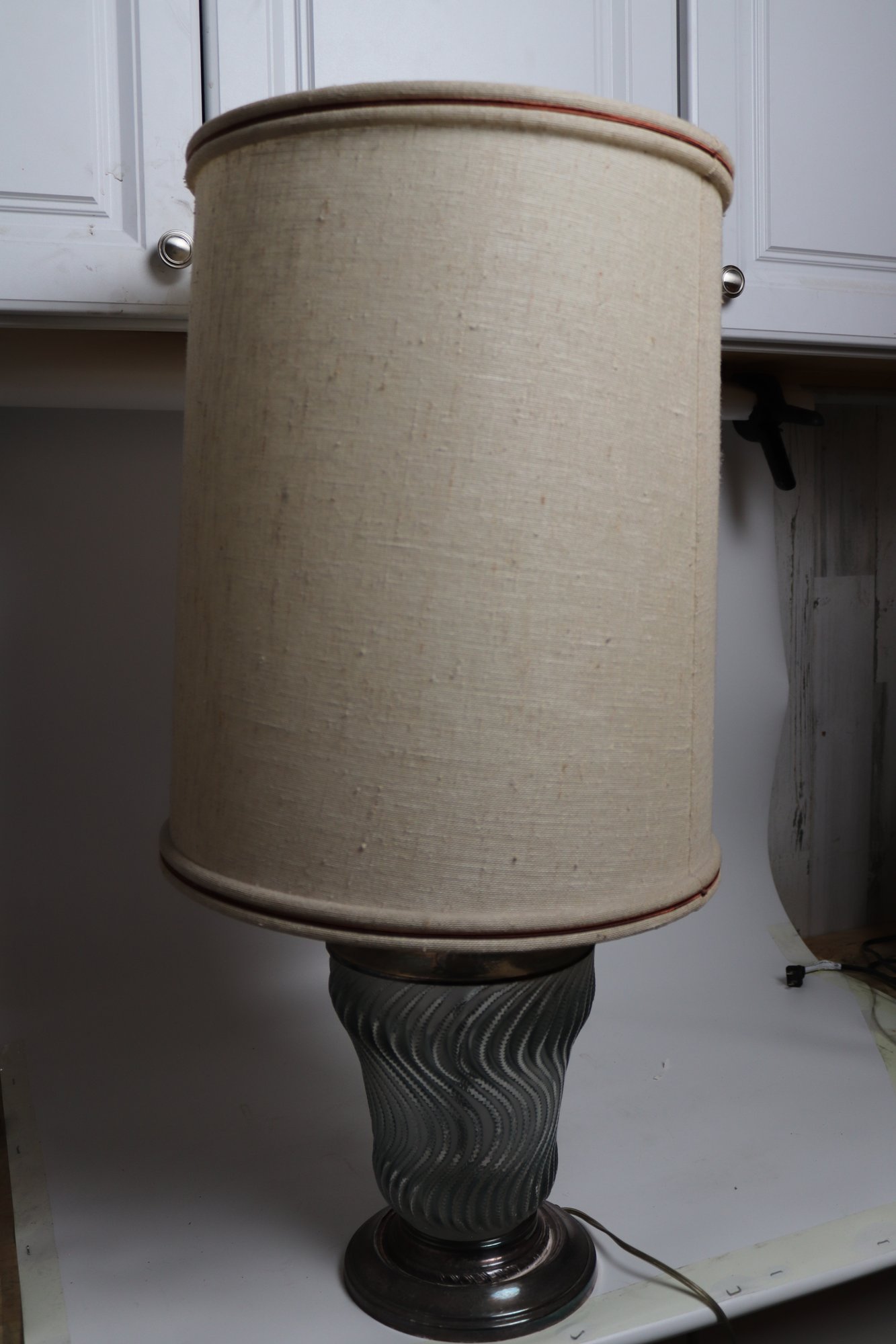 dd a touch of sophistication to your decor with this exquisite table lamp, featuring a glass base with a stunning silver-tone swirl pattern that exudes elegance. The design is beautifully complemented by a high-quality linen shade, which diffuses light to cast a warm, inviting glow in any room. It’s an exceptional piece that combines functionality with a refined aesthetic.