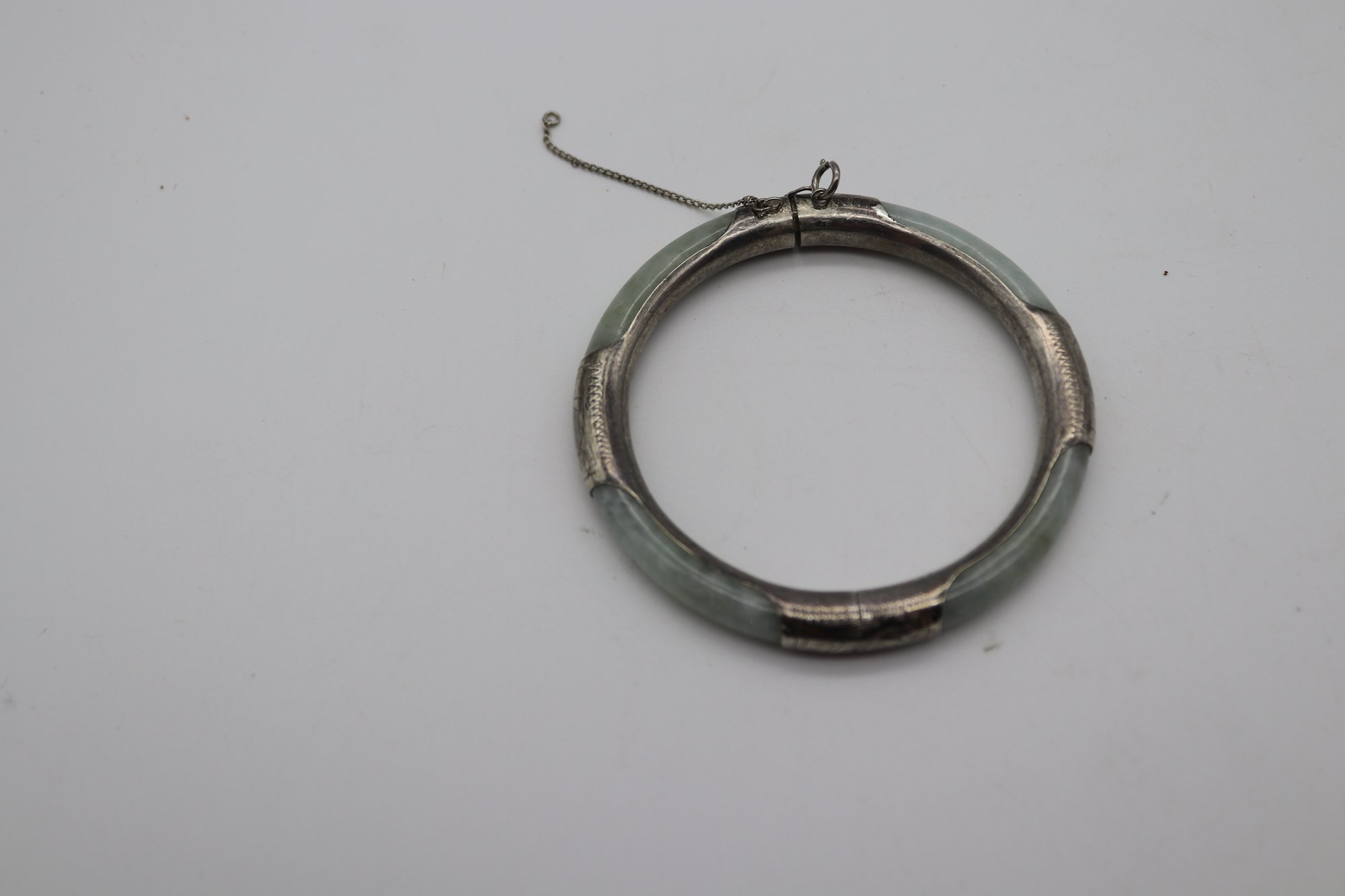 Experience the serene elegance of the Orient with this exquisite vintage bracelet, featuring polished translucent green Jadeite Jade, gracefully set in sterling silver. Accompanied by a delicate safety chain for secure wear, this piece echoes the beauty and mystique of ancient Chinese jewelry traditions, making it a timeless addition to any collection.