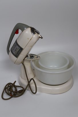 Evoke the charm of mid-century cuisine with this authentic Dormeyer Power Chef Mixer, model 4201. This piece is a genuine reflection of post-war American innovation in the kitchen. Its sturdy design, complete with a milk-glass mixing bowl, is a tangible slice of the 1950s domestic dream. Though showing signs of love and use, it stands as a testament to the era’s quality craftsmanship.