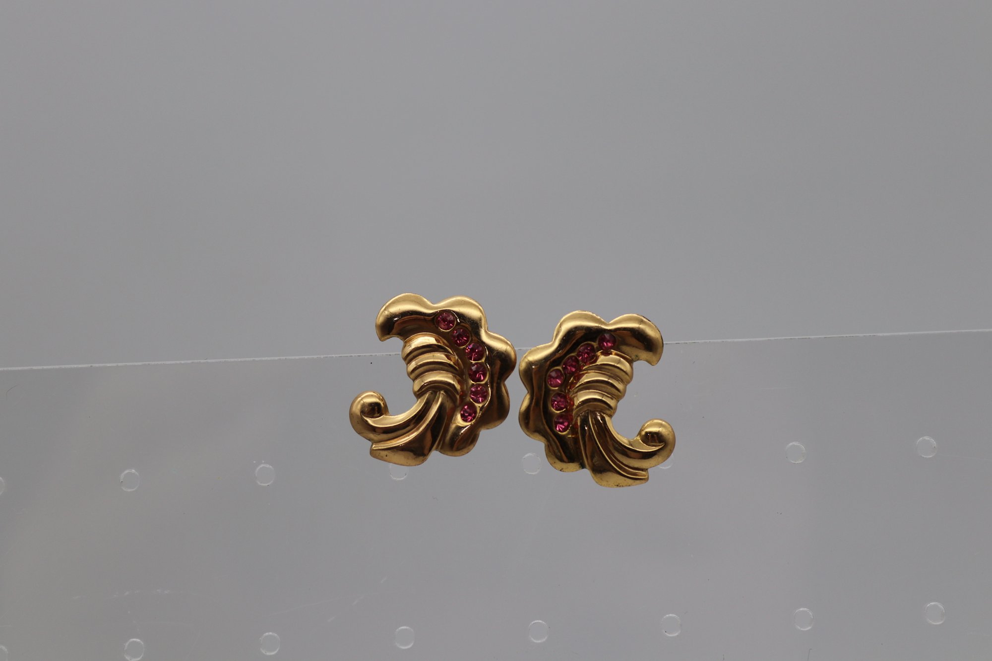 These striking vintage gold-tone earrings capture the essence of timeless costume jewelry with their intricate design and vibrant crimson accents. Their elegant scrollwork is reminiscent of classic jewelry craftsmanship, offering a sense of luxury and charm without the weight of precious metals or stones. Perfect for those who adore the intricate details and rich aesthetic of antique-inspired jewelry, these clip-on earrings provide an exquisite touch to any ensemble, bringing with them the allure of a past fashion era.