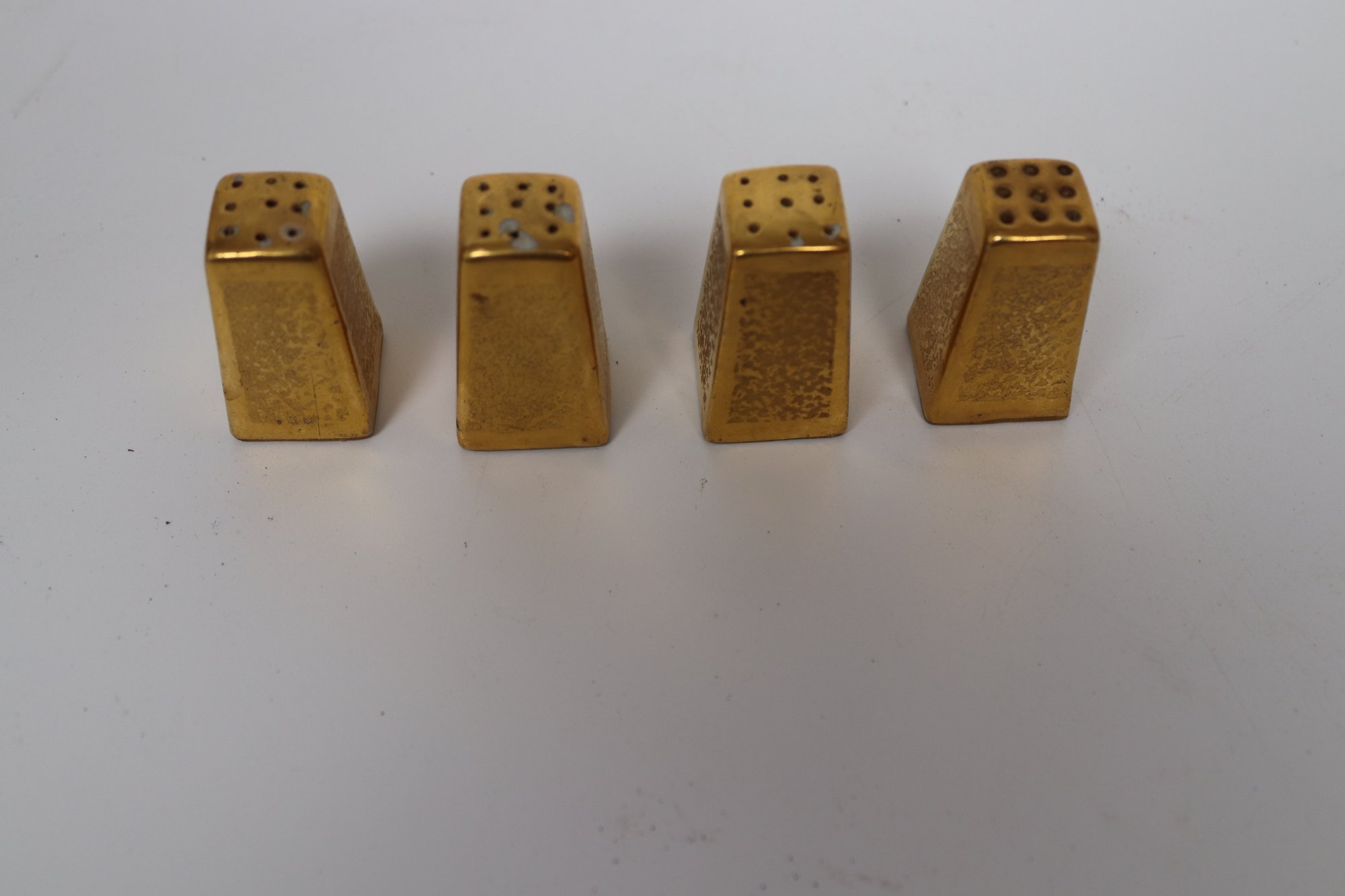Add a touch of retro glam to your mealtime rituals with this charming set of gold-tone salt and pepper shakers. Their mid-century design and shimmering gold-like finish capture the essence of the era's love for bold yet elegant tableware. These shakers, though not made of real gold, bring the same level of sophistication to any dining setting.