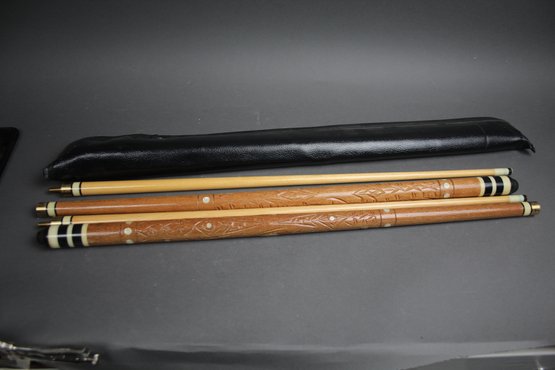 Up for bid is a vintage pool cue set featuring two meticulously hand-carved cues with intricate leaf patterns and inlaid dot detailing. Both cues are two-piece with brass joints, offering solid assembly and disassembly, and stored in a sleek zippered black case for portability and protection. Ideal for both billiards enthusiasts and collectors, these cues also make striking decorative pieces. Their natural wood finish, bold stripe accents, and craftsmanship make them a stand-out addition for game rooms, man caves, or Castlecore-themed spaces.Add timeless sophistication to your billiards collection with this vintage hand-carved pool cue set, complete with two beautifully detailed cues and a zippered black leatherette case.