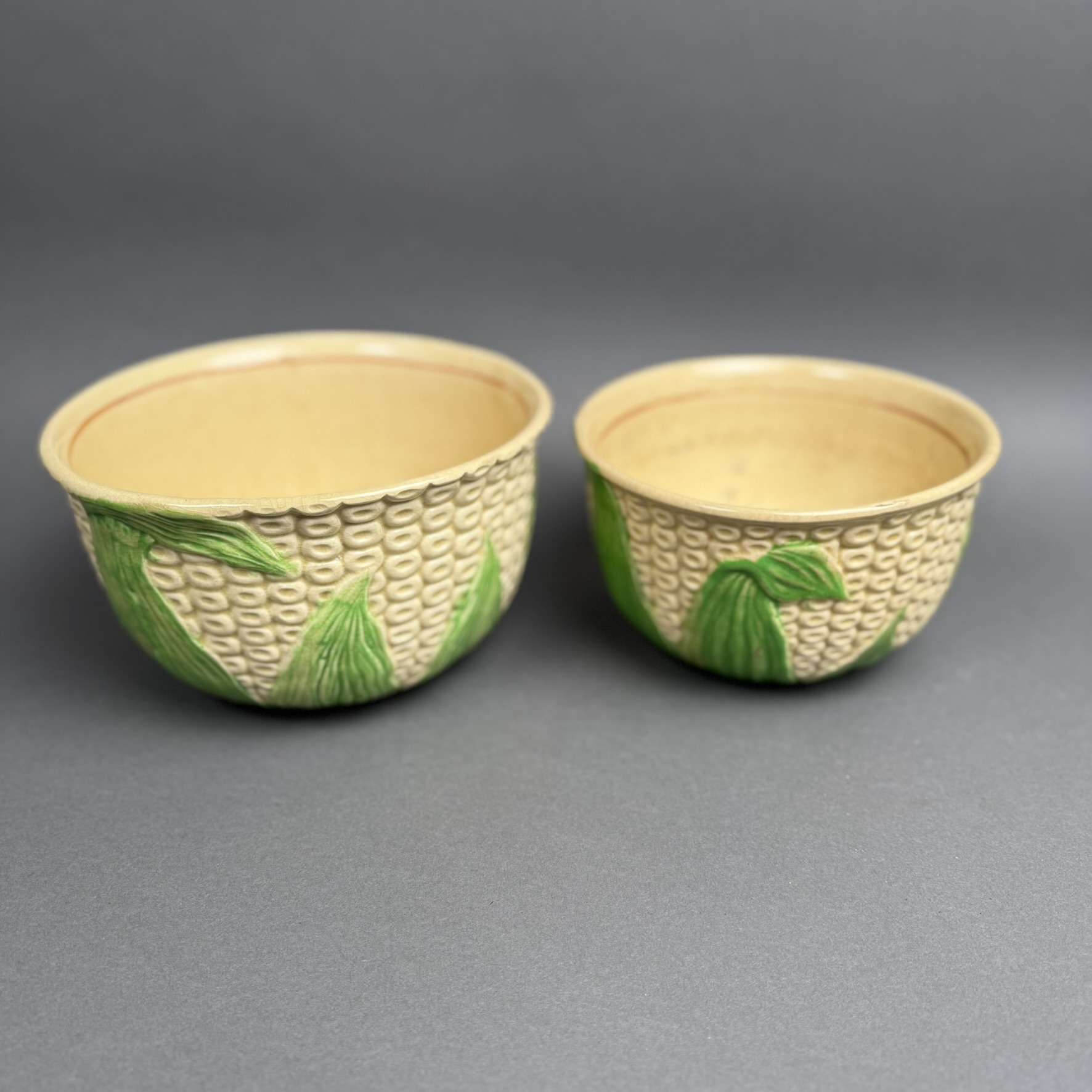 A charming set of two vintage Japanese Majolica corn motif mixing bowls with intricate detailing and rustic farmhouse appeal.