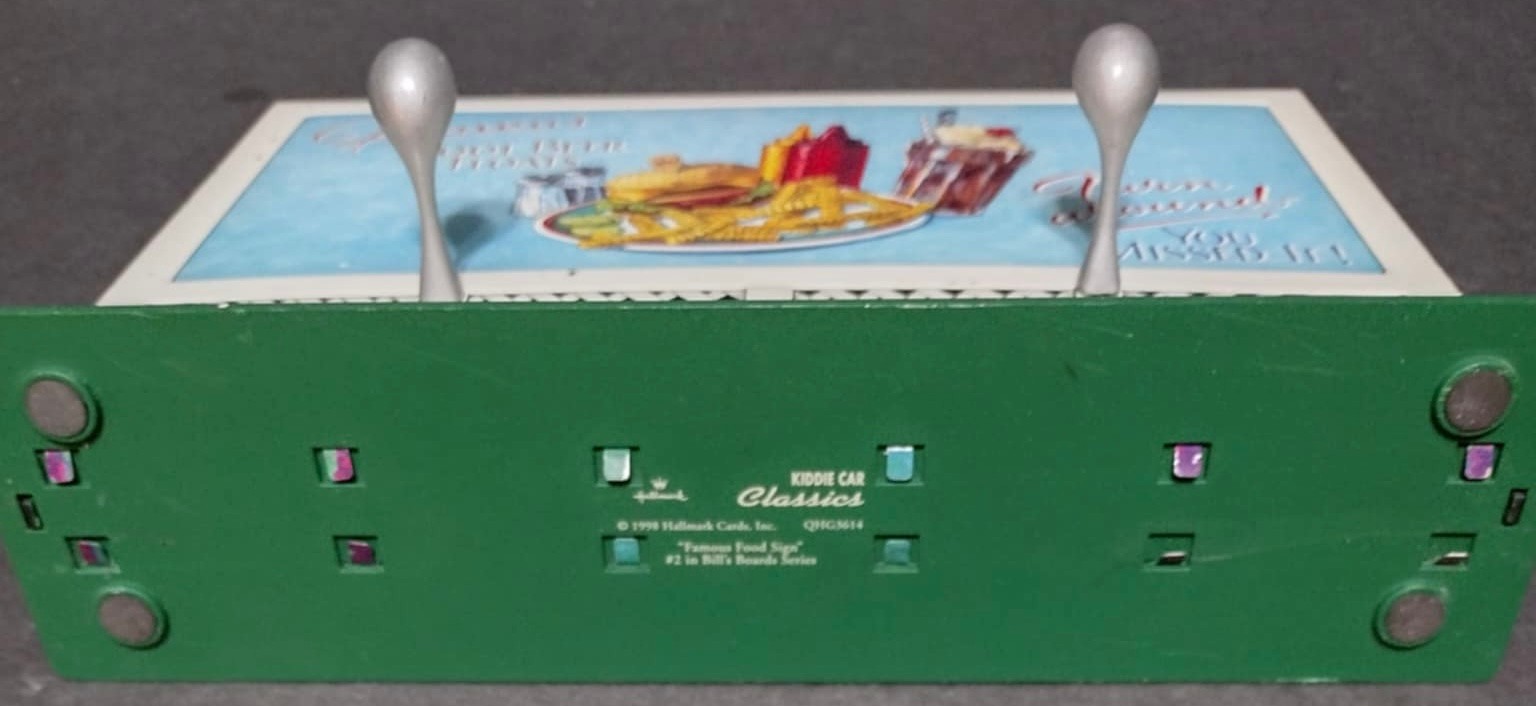 1998 Hallmark ~ Kiddie Car Corner ~ Bill's Boards Series #2 ~ Famous Food Sign. Does have a spot in upper corner. Measures 10 x 8.