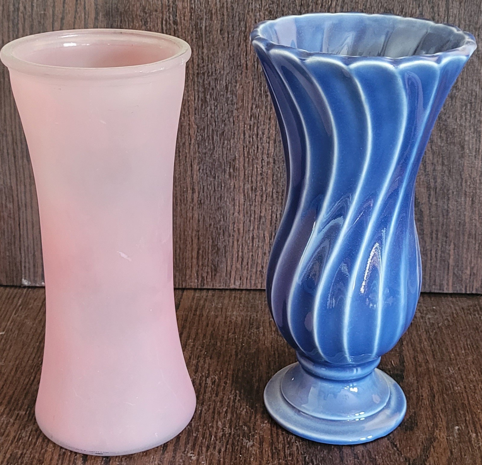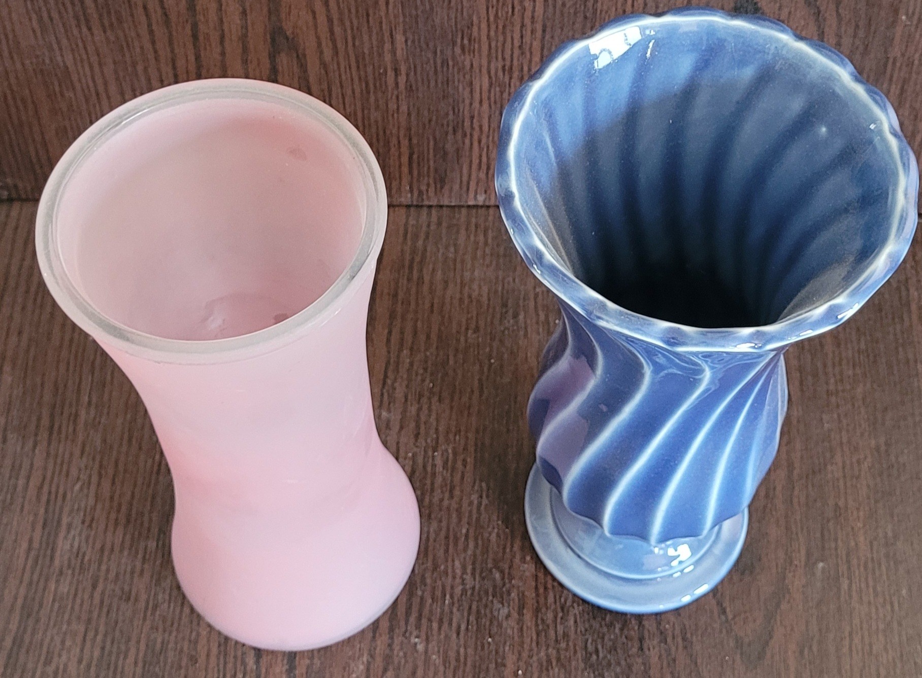 The blue vase measures 10.25" tall by 5.125" in diameter and the other vase measures 9.875" tall by 4.125" in diameter. See pictures for details.
