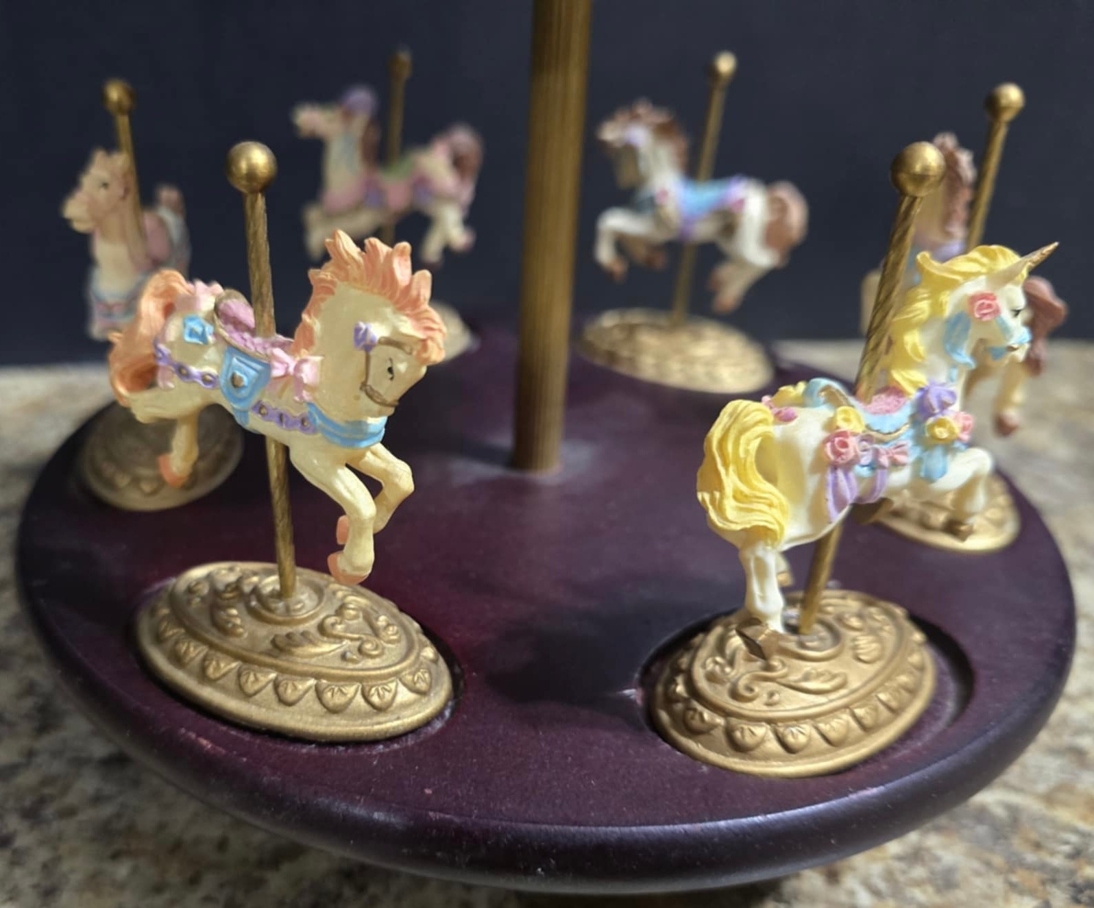 2 Musical Carousels. The single horse looks to have a stain on the top. Measures 10h x 5.5w. The other has 6 removable horses. 3 have a broken leg as pictured. Measures 10.5 x 8. Both need cleaned. Both work.