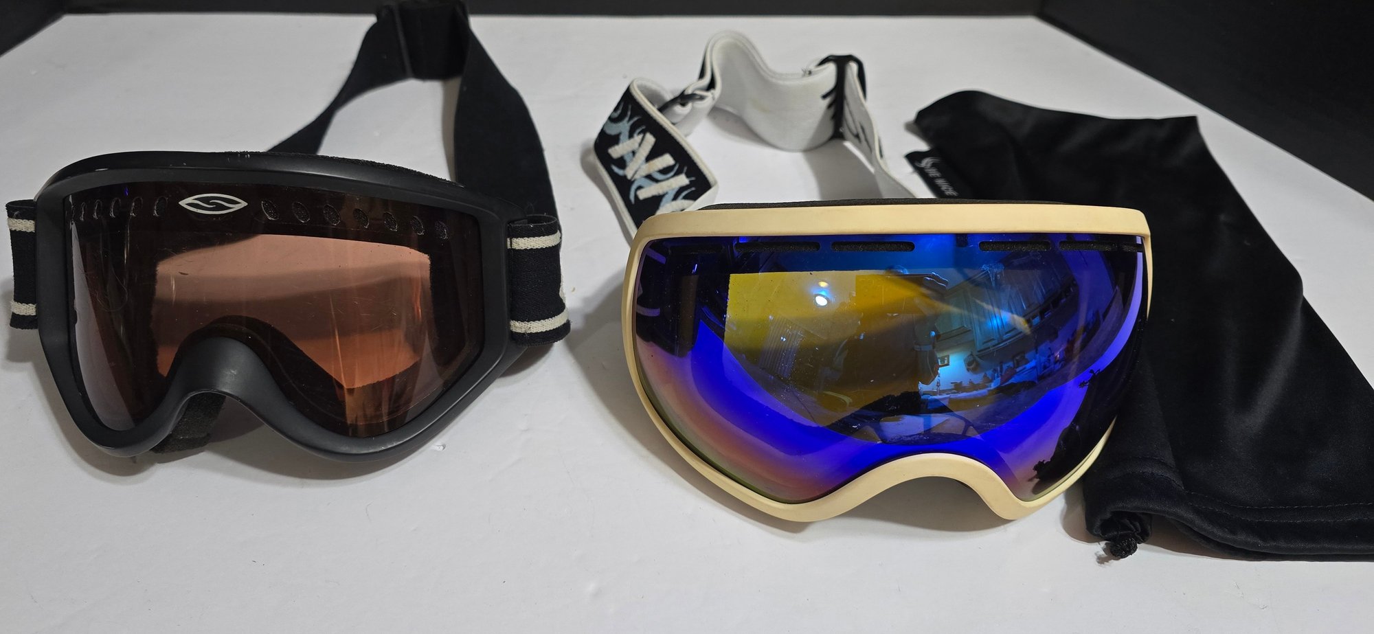 2 Pair Snow Goggles and a cloth bag. Looks to be a pair of Smith Optics Cascade Classic and a pair of Be Nice. Please see all pics for details.
