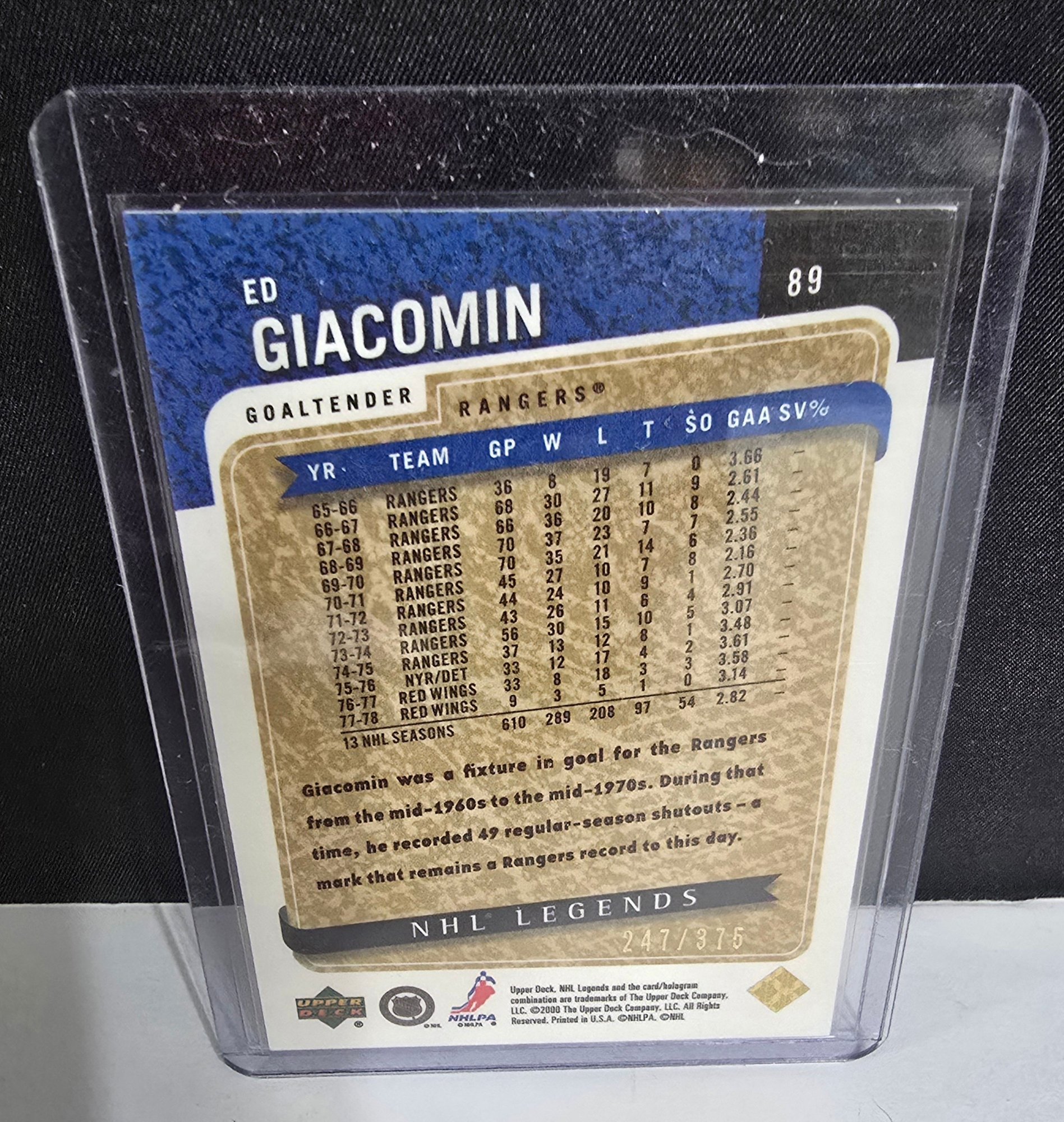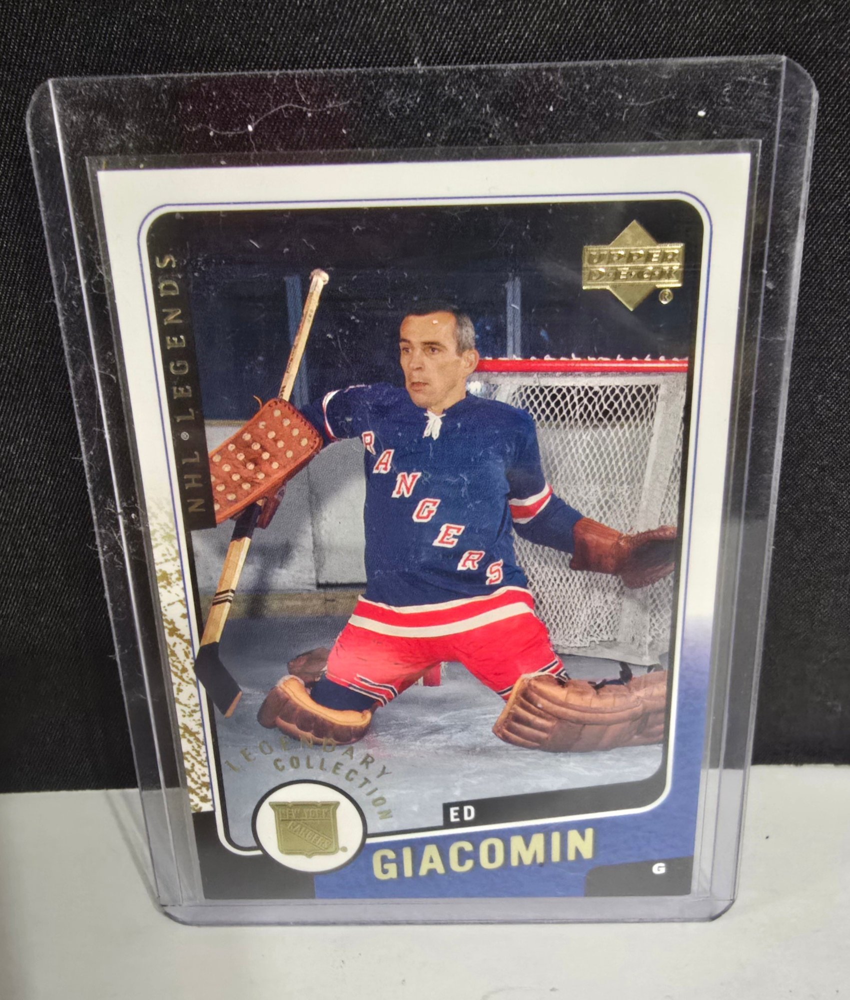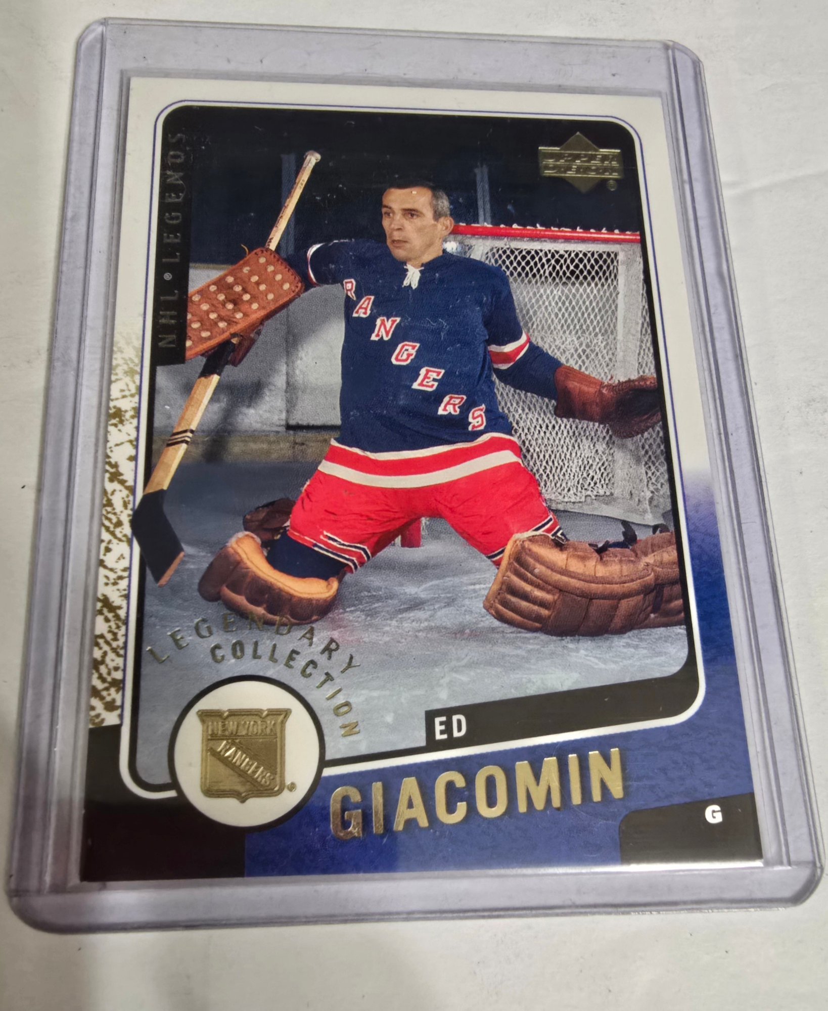 2000-01 Upper Deck Legends Legendary Collection Gold trading card featuring Hall of Fame goaltender Ed Giacomin of the New York Rangers. Please see all pics for details