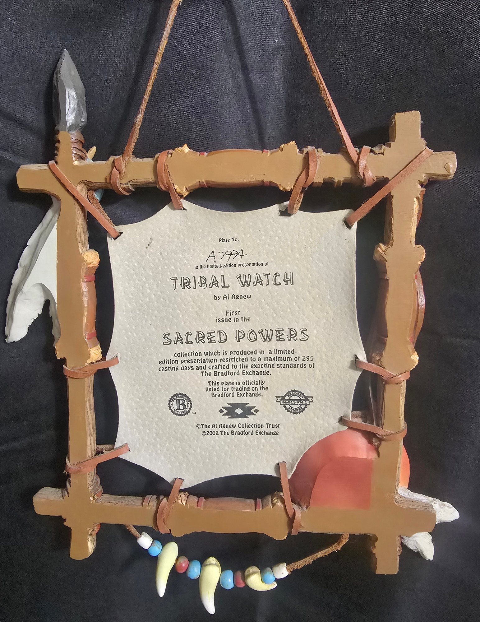 2002 Bradford Exchange "Sacred Powers" wall hanging from the Tribal Watch collection, featuring artwork by Al Agnew. Measures 8 x 12. Please see all pics for details.