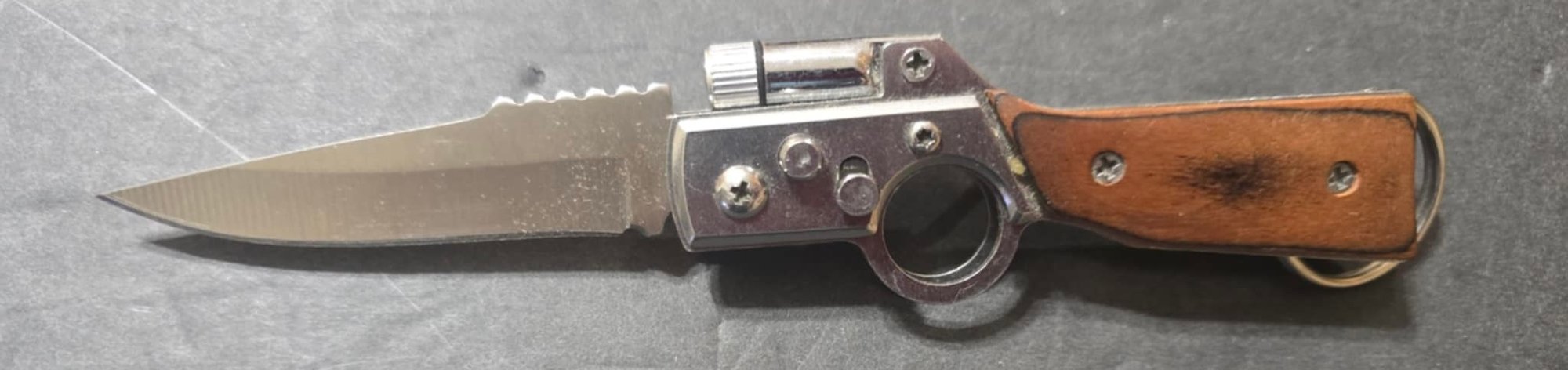 3 pocket knives. AK47 Gun Shape Outdoor Pocket Tactical Survival Folding Knife with LED Light. Light does not work. May just need a battery. Sheffield Premium Lock Back Utility Knife and an unbranded pocket knives. All measures approximately 3.5 to 4 inches closed.
