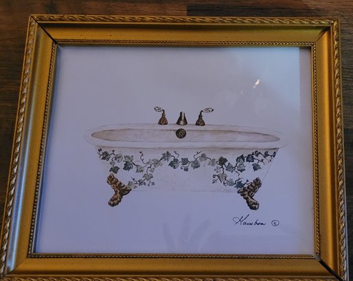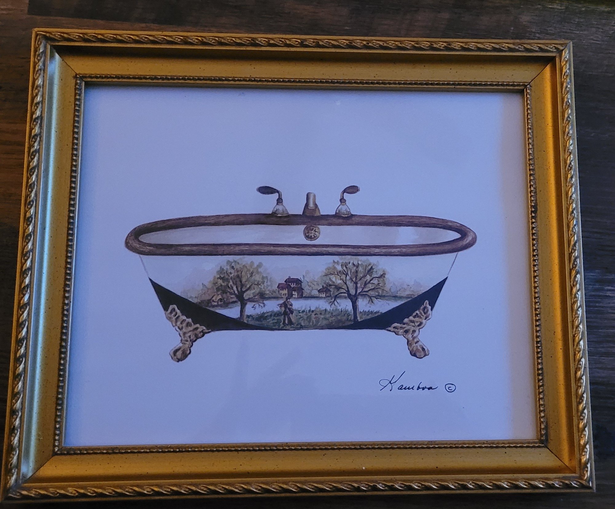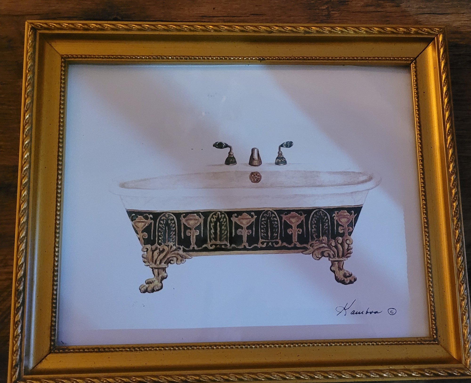 This exquisite framed print features a beautiful Victorian bathtub designed by Consuelo Gambia. The artist's signature is prominently displayed, adding to the value and authenticity of this piece. Measuring 11.75" in length, 9.75" in height, and 0.50" in width, this medium-sized print is expertly framed and ready to hang. The subject of this print is bathtubs, and it is sure to add a touch of elegance to any room. The production technique is prints, and the item is made in an unknown country or region. Whether you are an art collector or simply looking for a stunning piece to decorate your home, this framed print is a must-have.