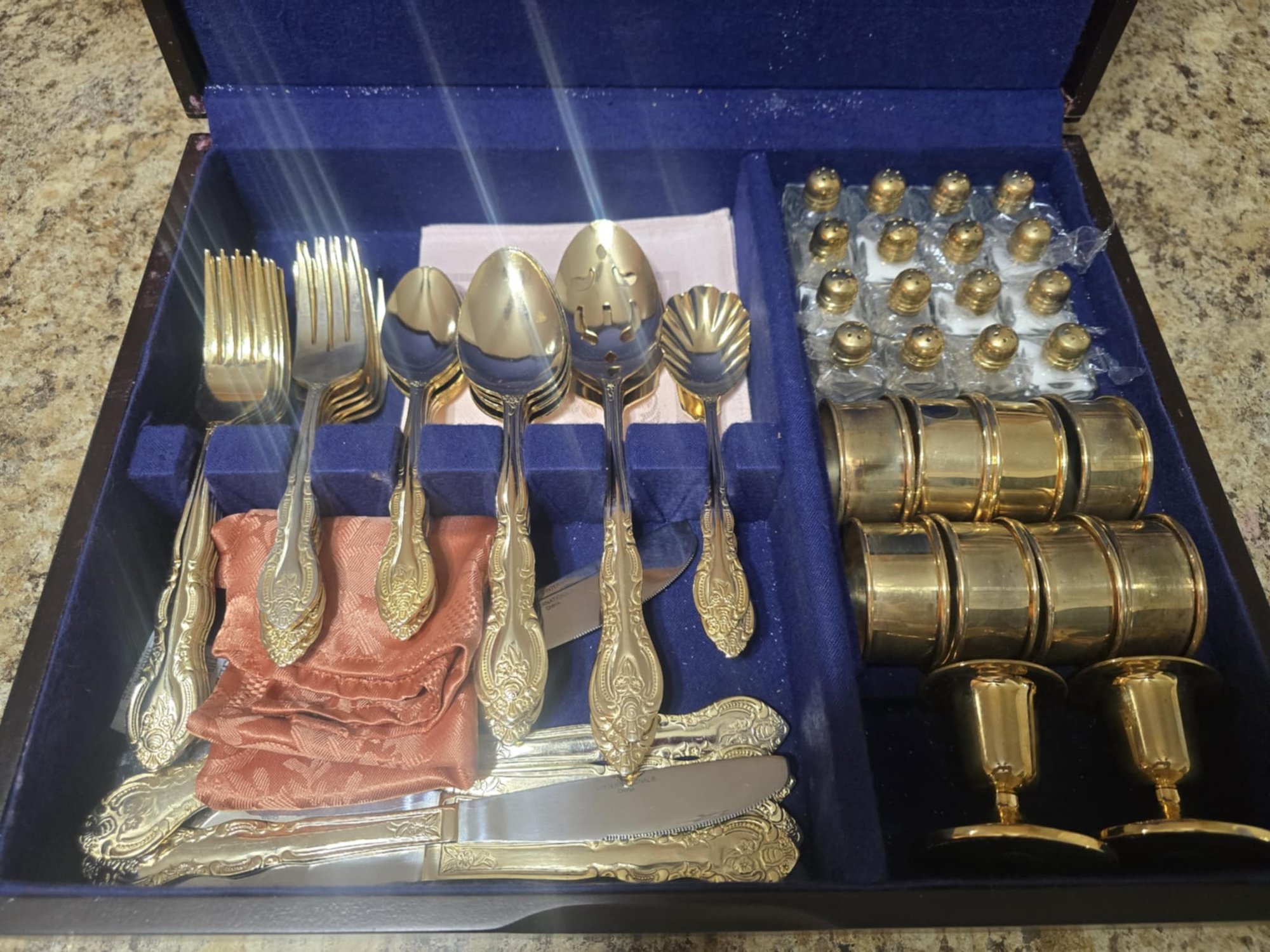 71 piece International Company Flatware Set in wooden case. 8 pieces each of the Flatware and napkins rings. Some discoloration on a couple pieces. Great for the holidays.