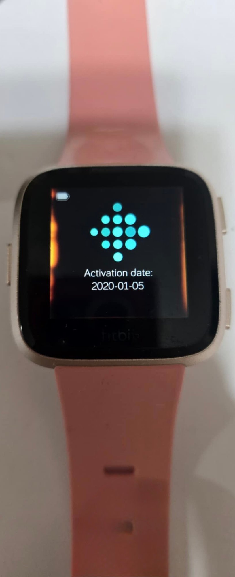 A fitbit Versa series smartwatch in a rose gold/peach color with charger. Works. Ready to be downloaded to your app.