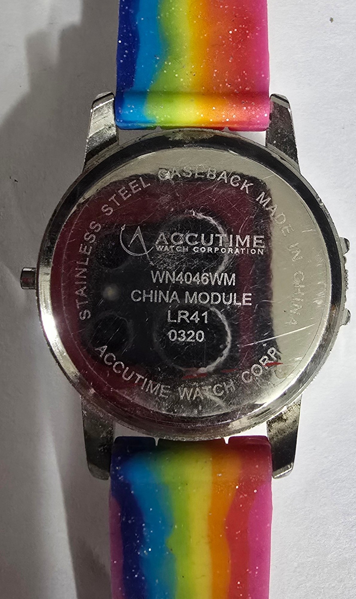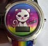 Accutime Hello Kitty digital watch features a rainbow-colored silicone strap and a spinning, flip-up character case. Untested. Does not turn on. May just need a battery. Please see all pics for details.