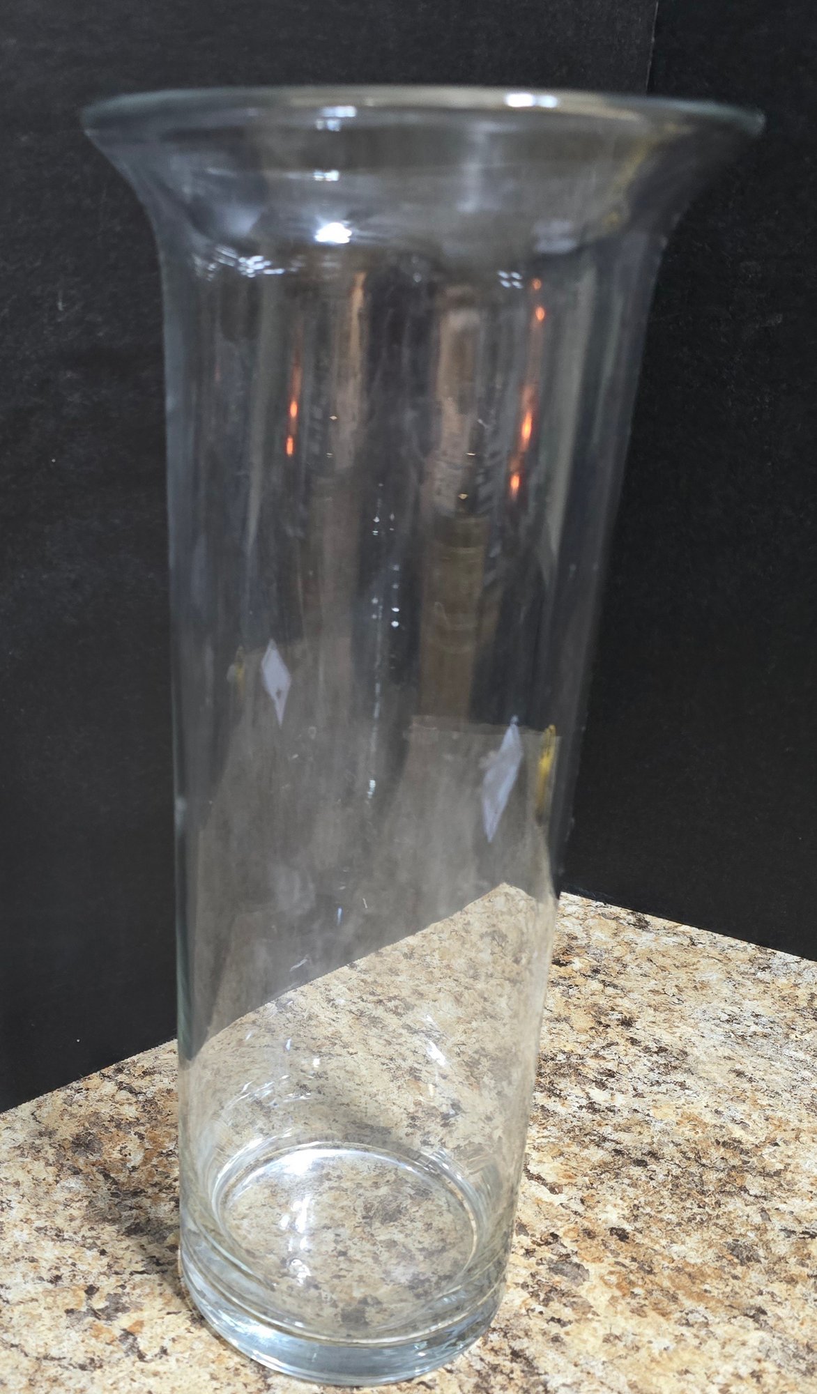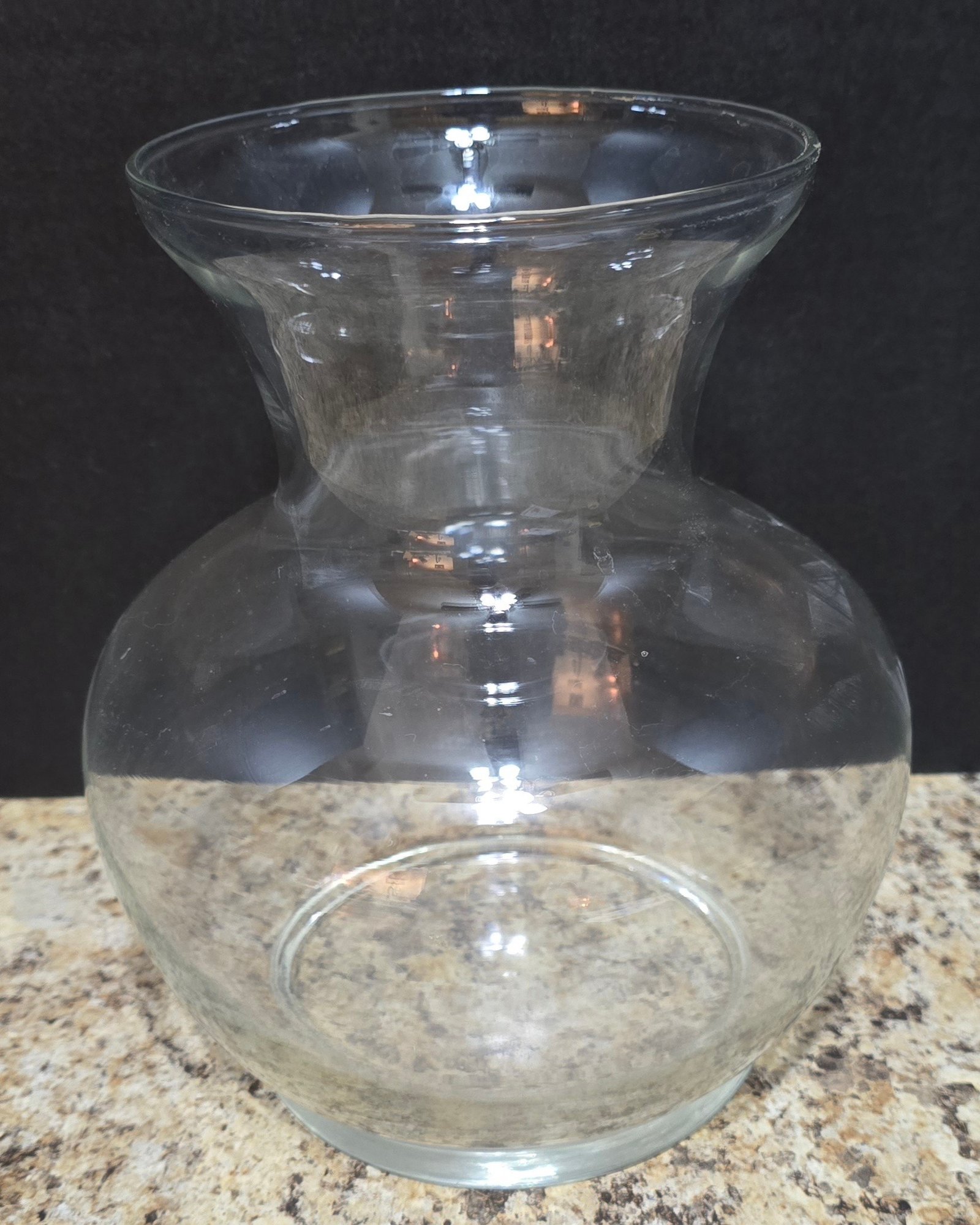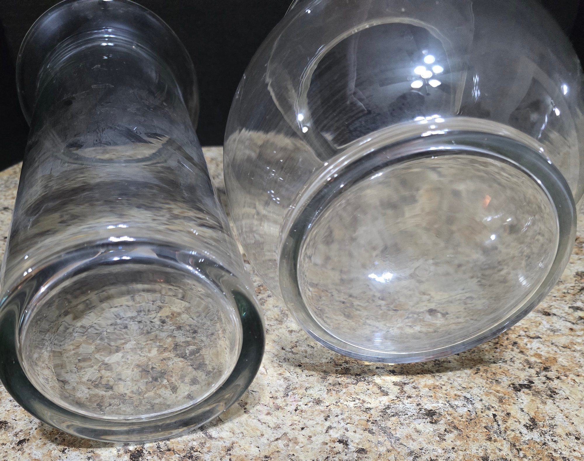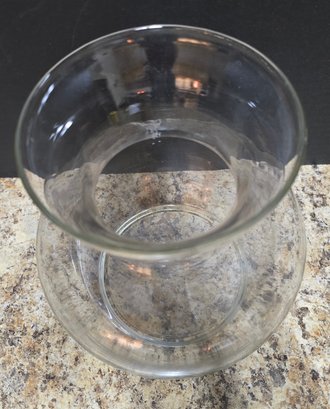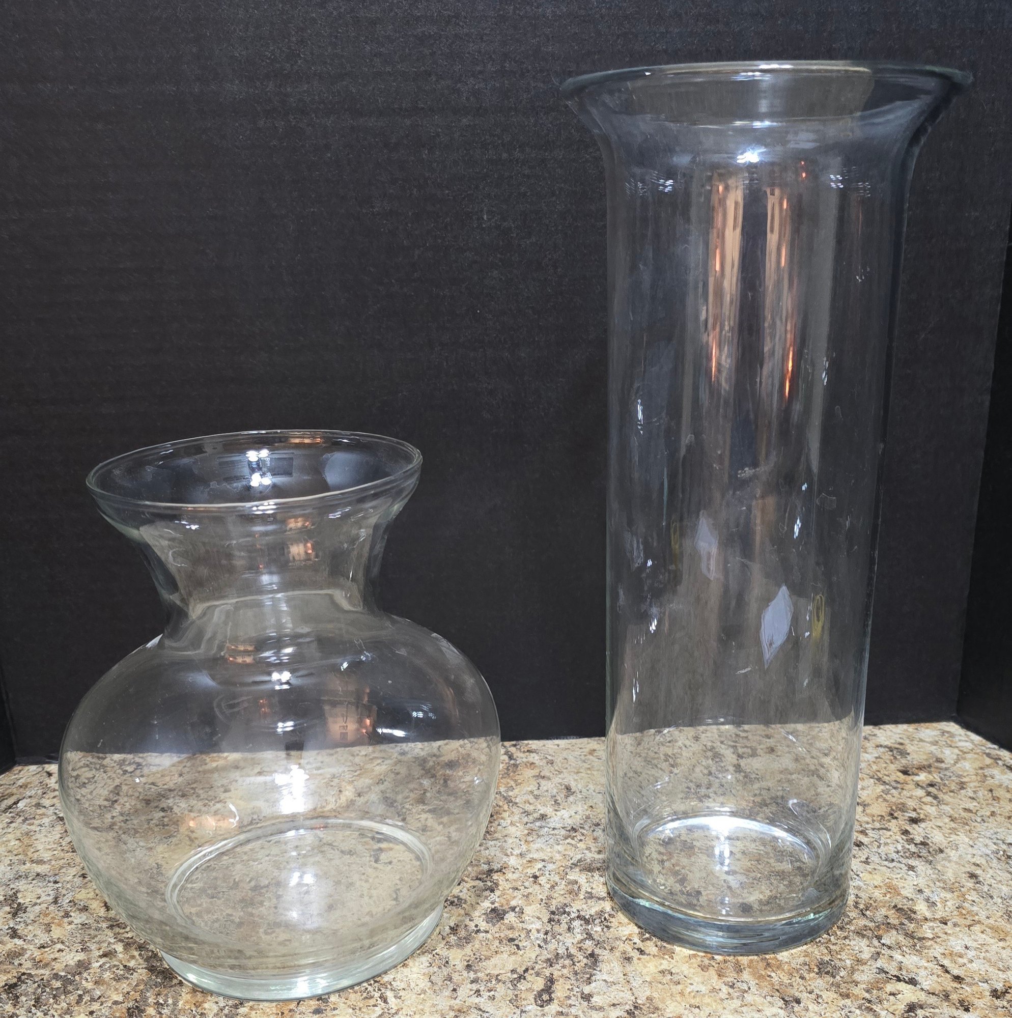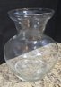 Pair of Clear Glass Vases. Measures 8 x 9 and 6 x 14. No cracks or chips noted. Please see all pics for details.