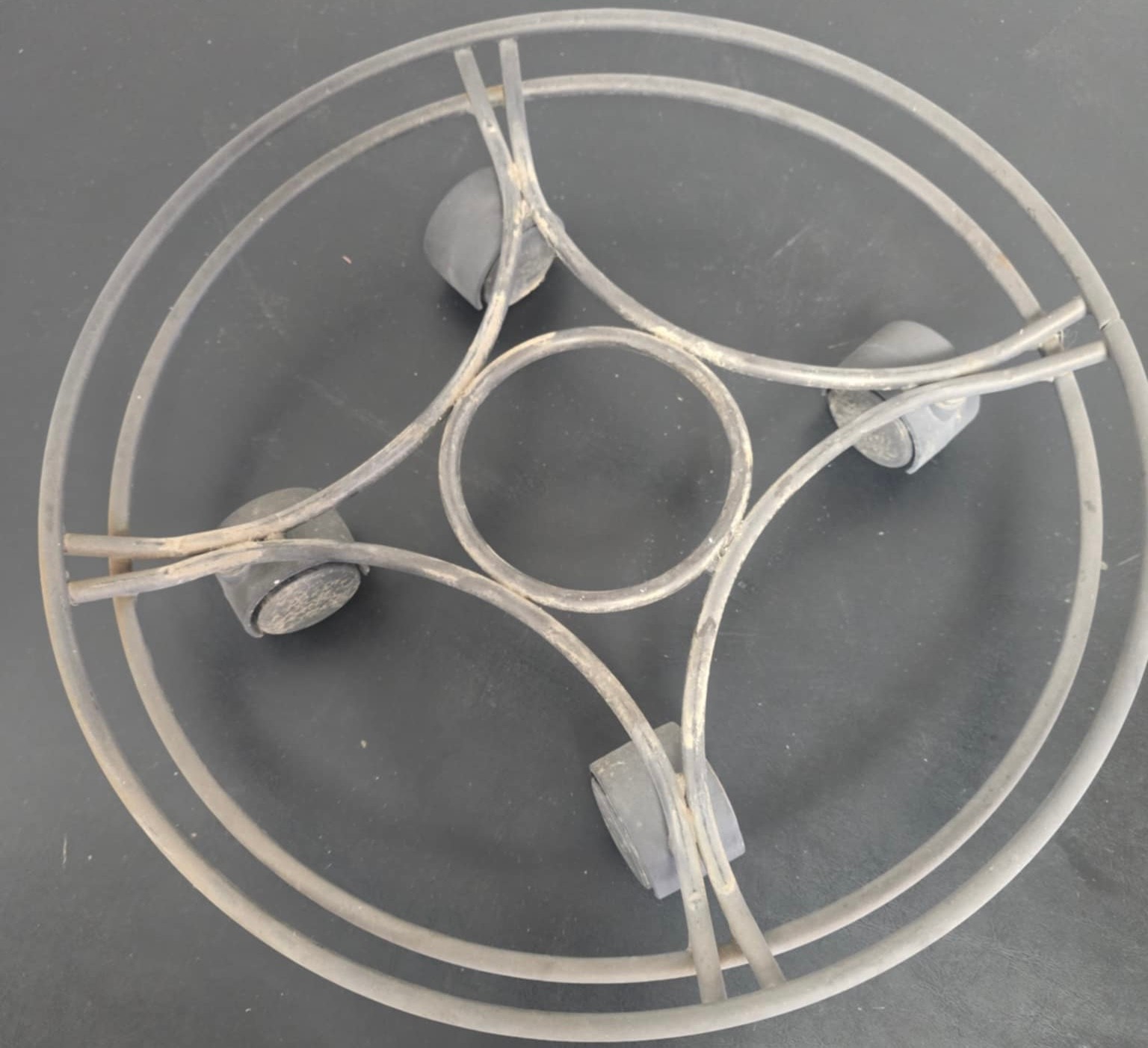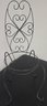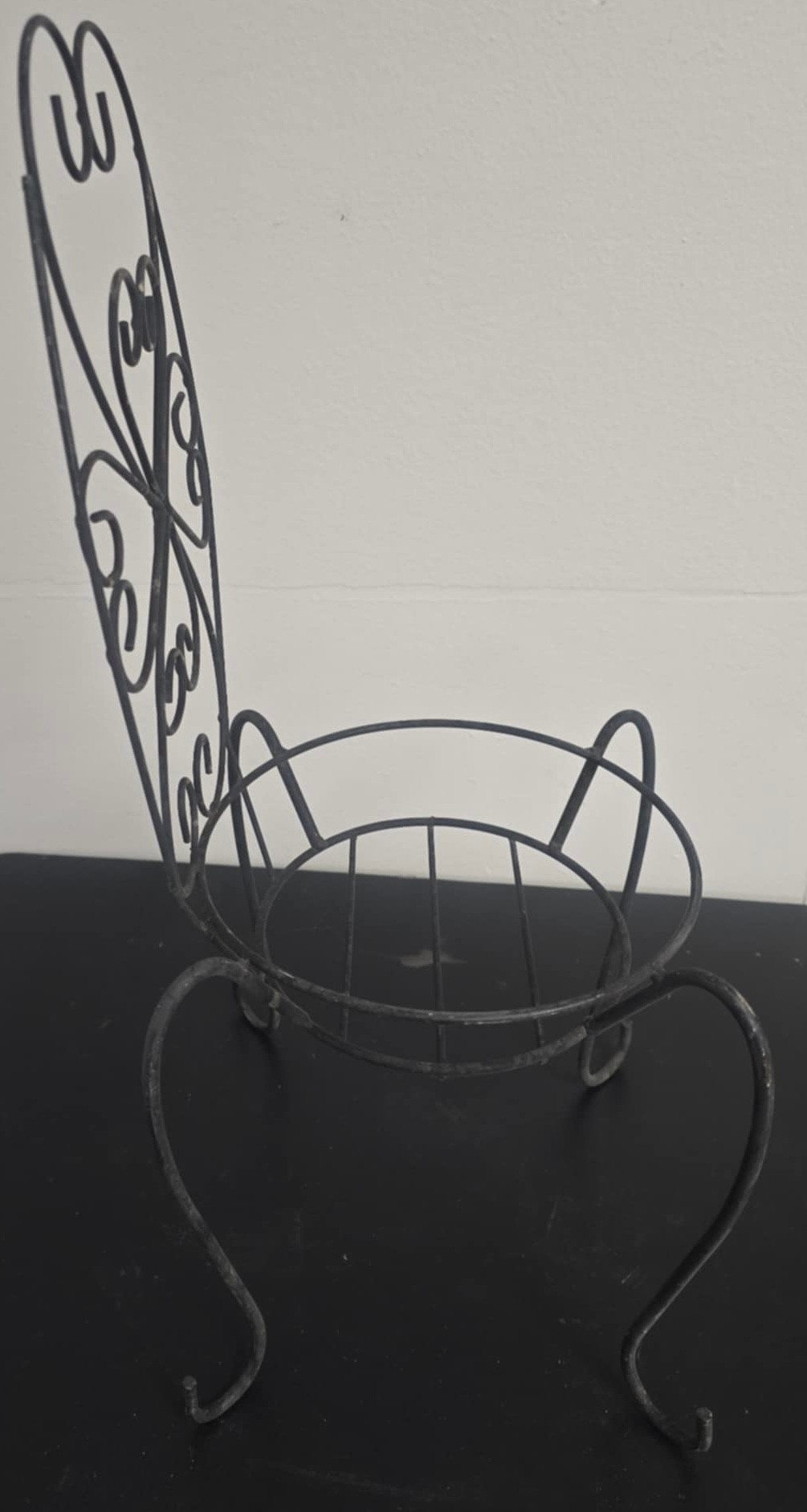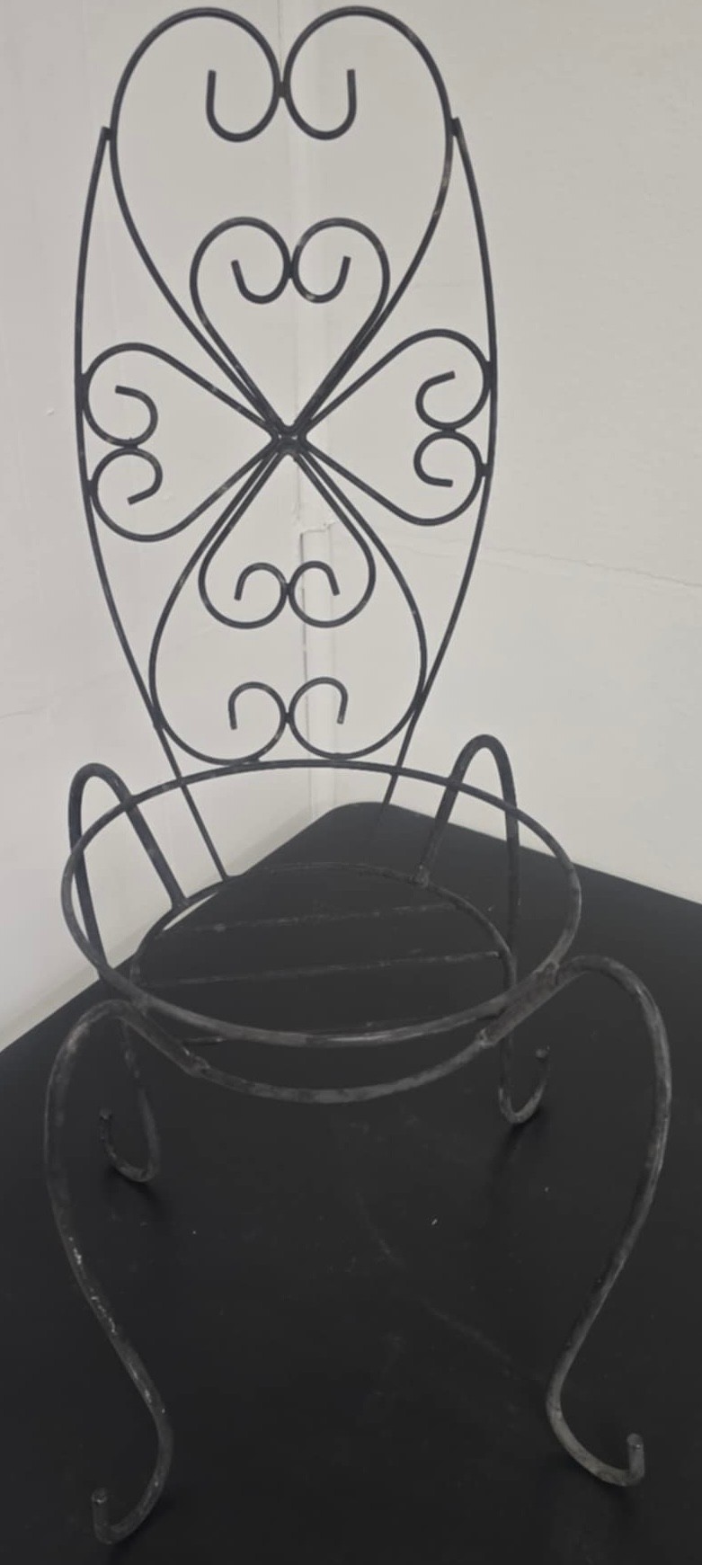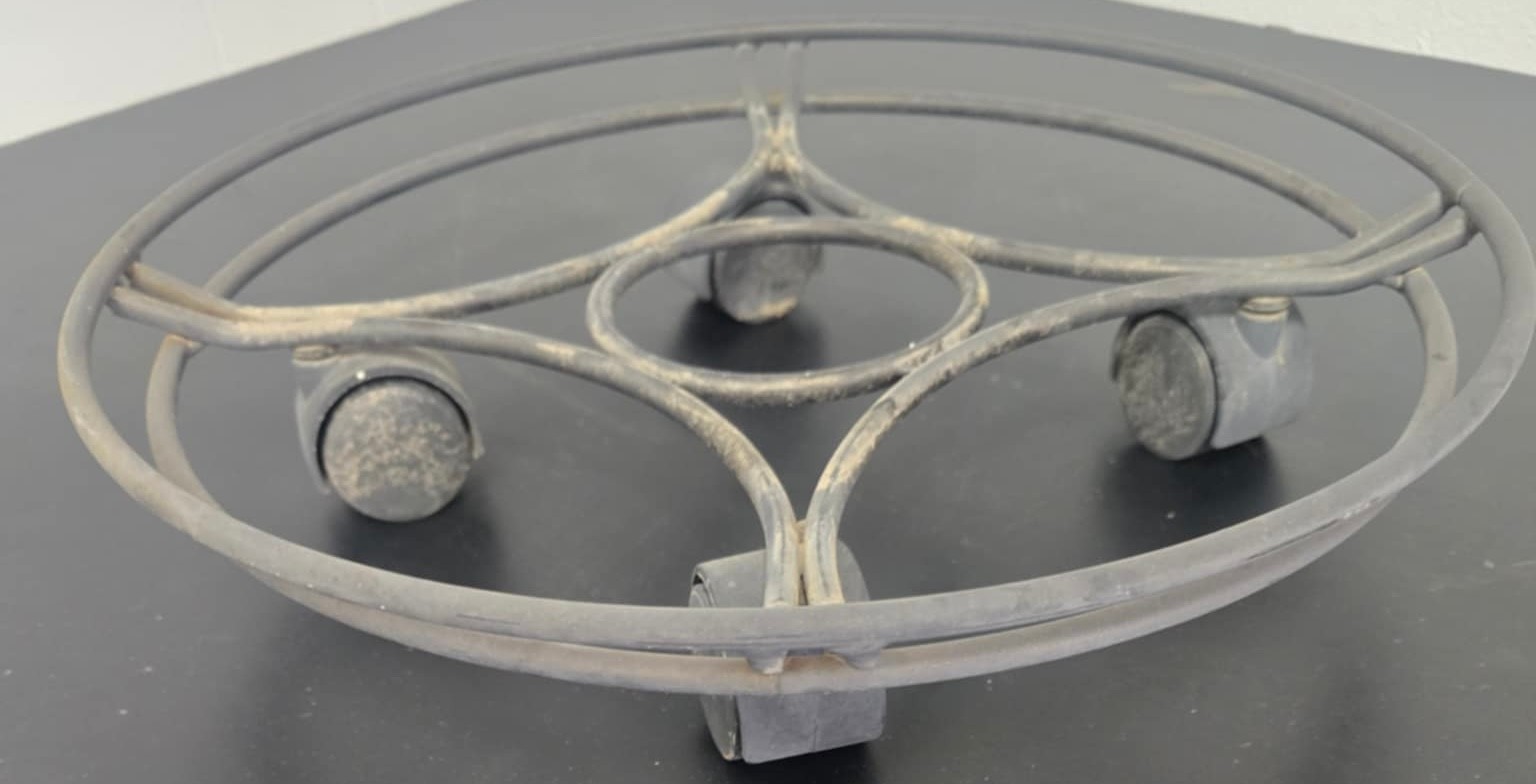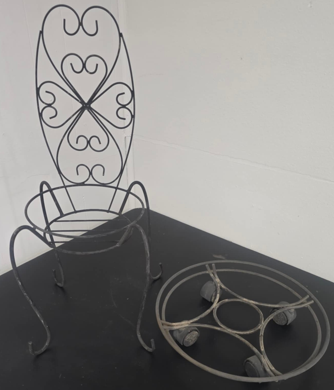 Pair of Metal Plant Holders. The round is 14d x 3 on wheels. and the chair is 9 x 9 x 23.5h. Holds a pot 9d.