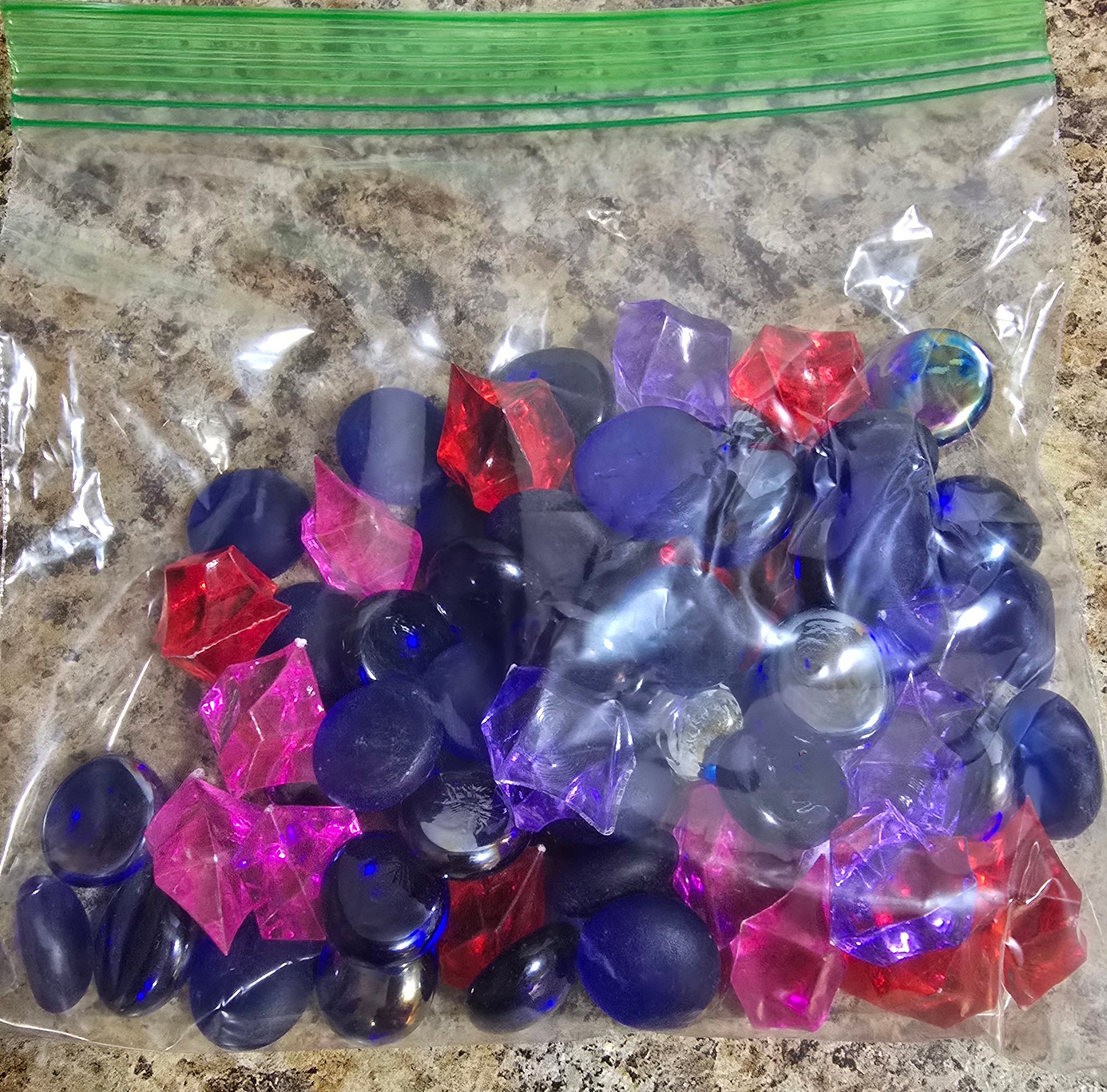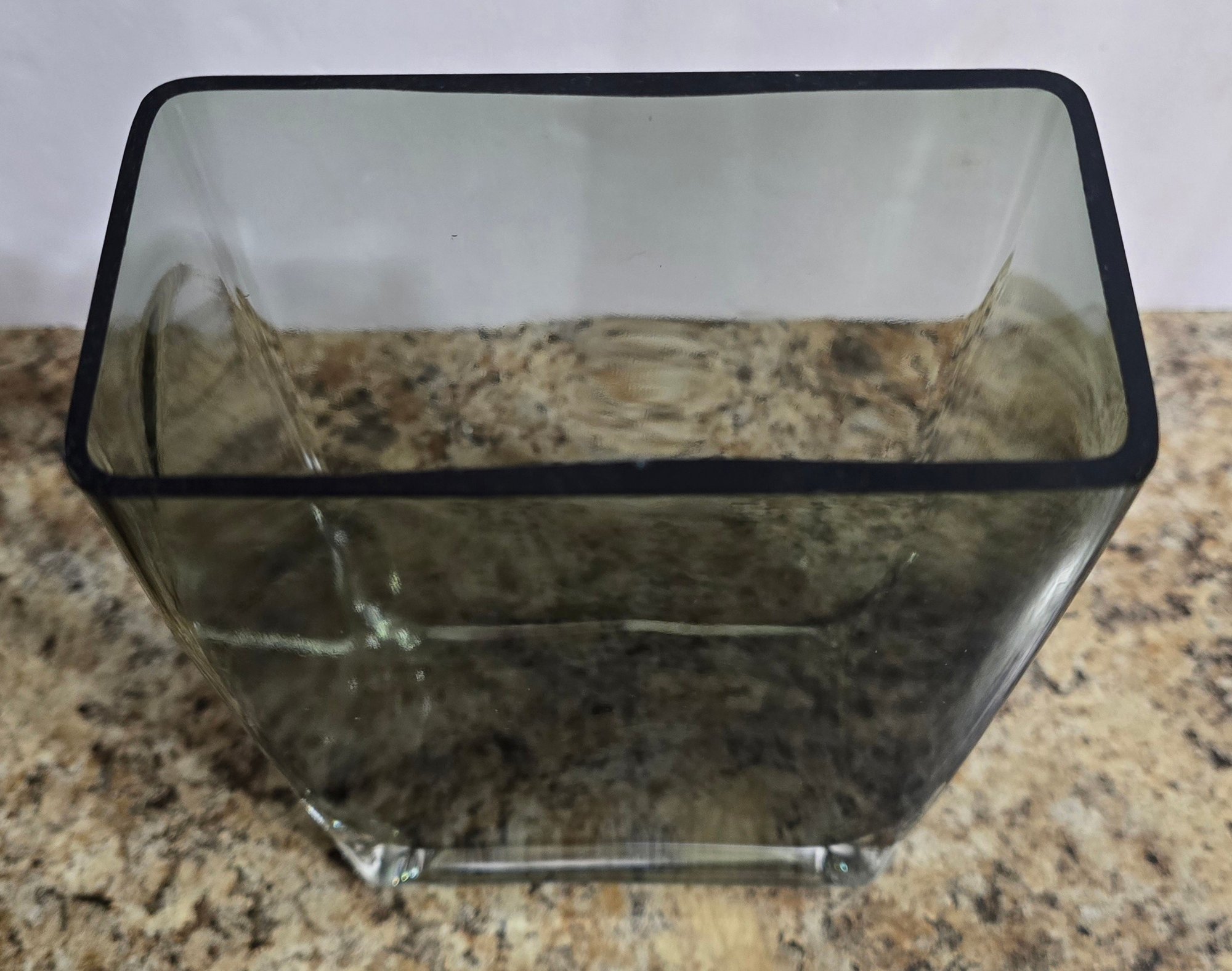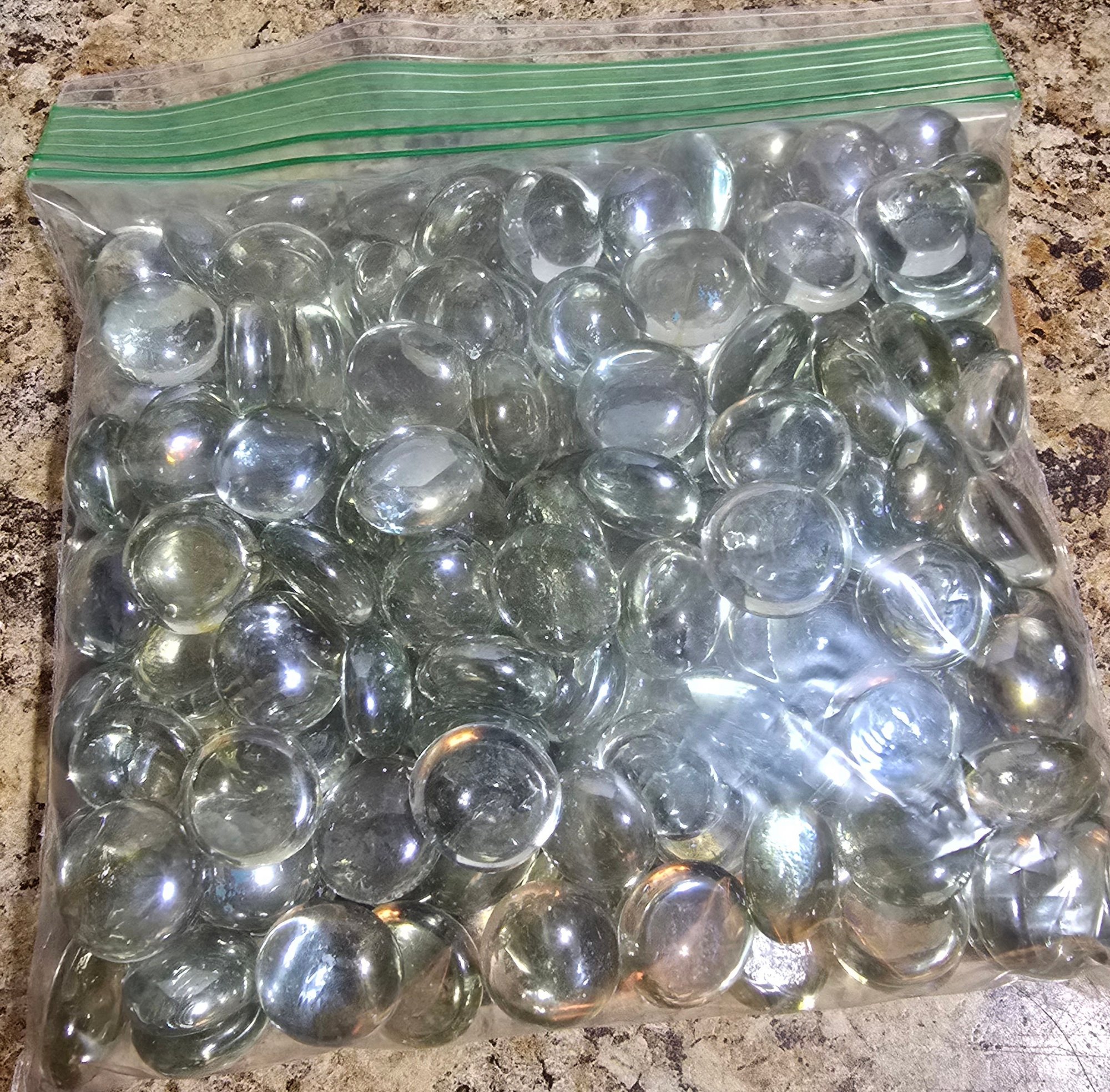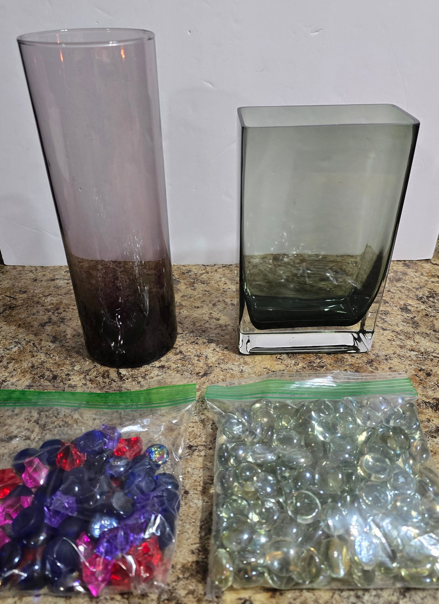 Pair of Modern Glass Vases with clear and colored gems for filler. Vases measures 4 75 x 2.5 x 8 & 3.5 x 10. No cracks or chips noted. Please see all pics for details.