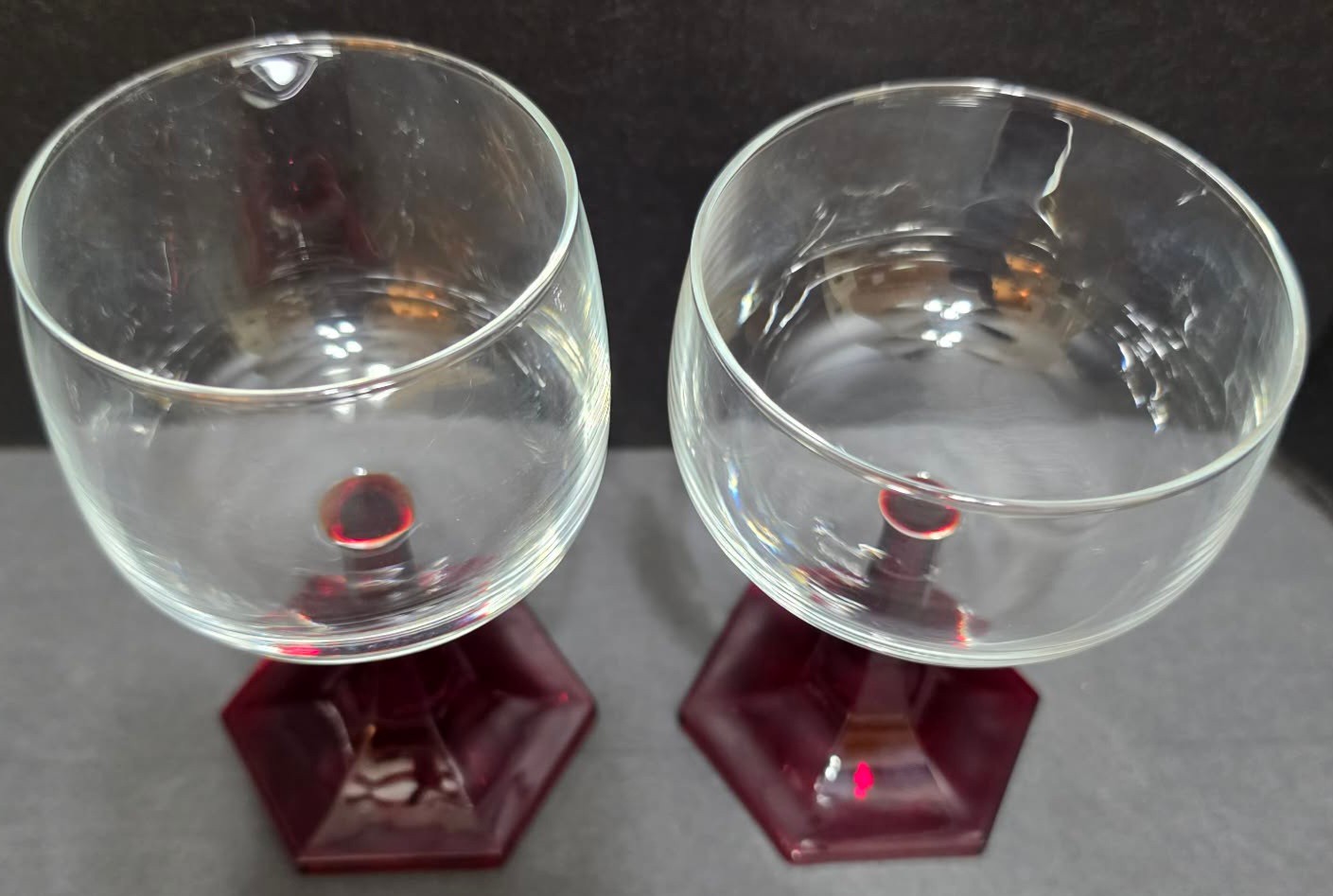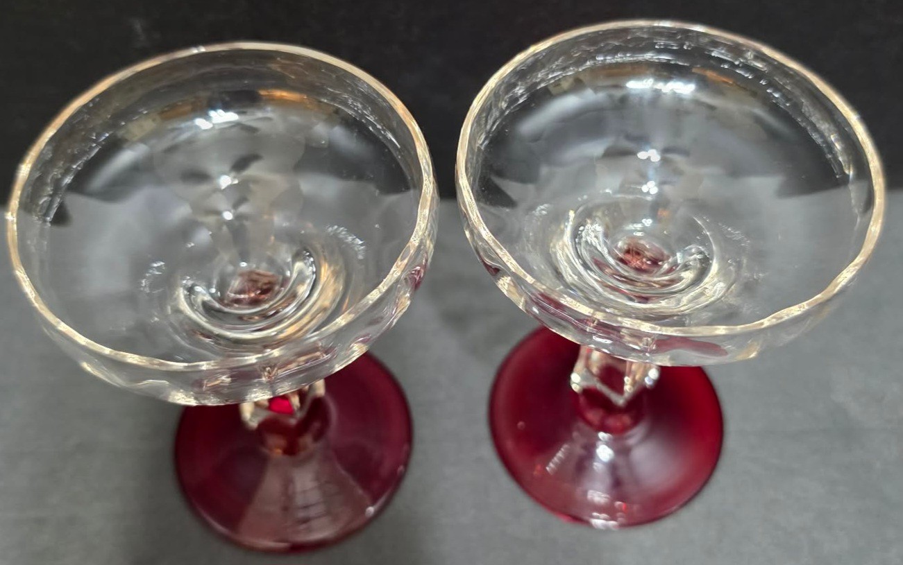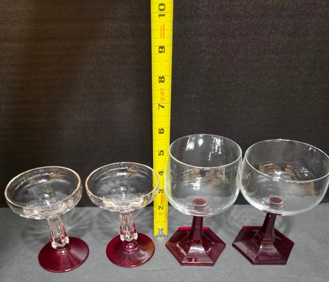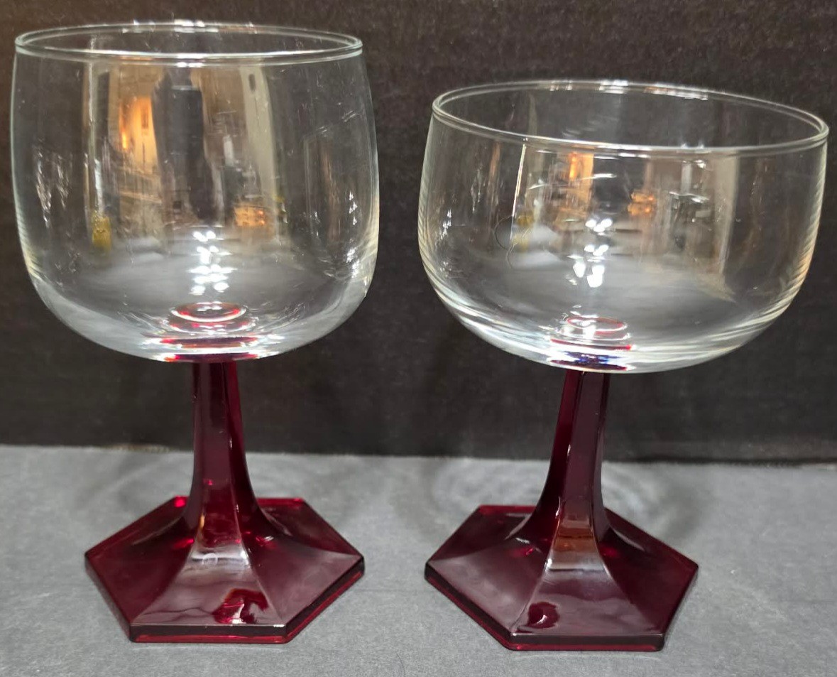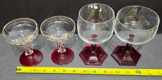 Pair of vintage clear glass coupe glasses with faceted ruby stems and bases and pair of vintage Luminarc ruby red stemmed wine glasses. No cracks or chips noted.