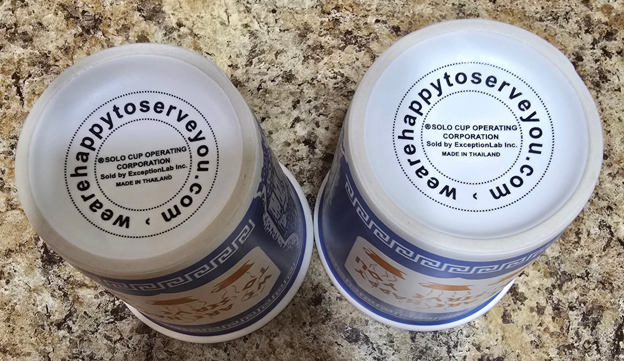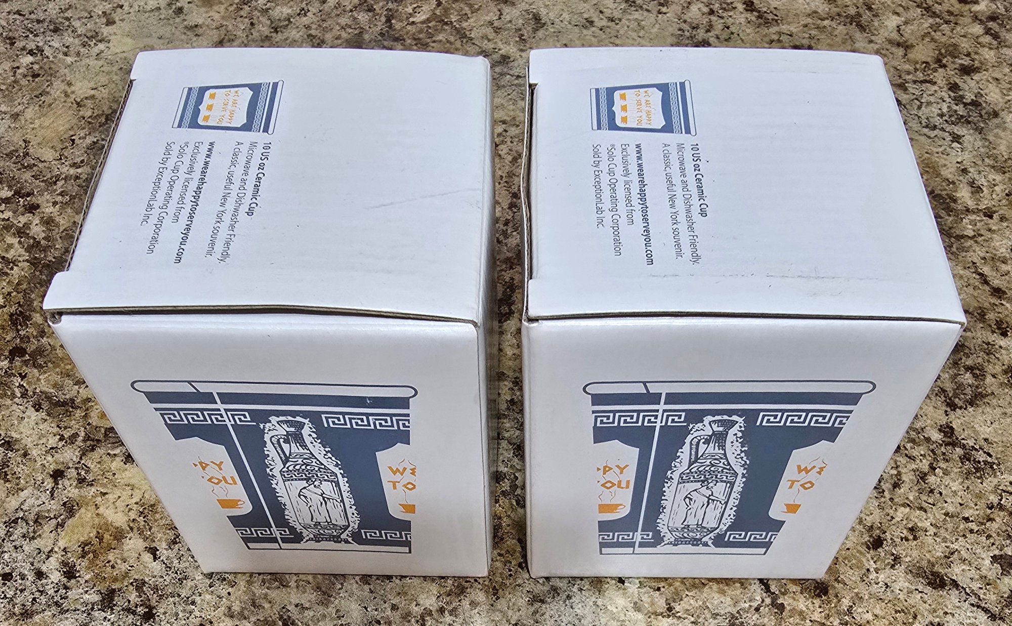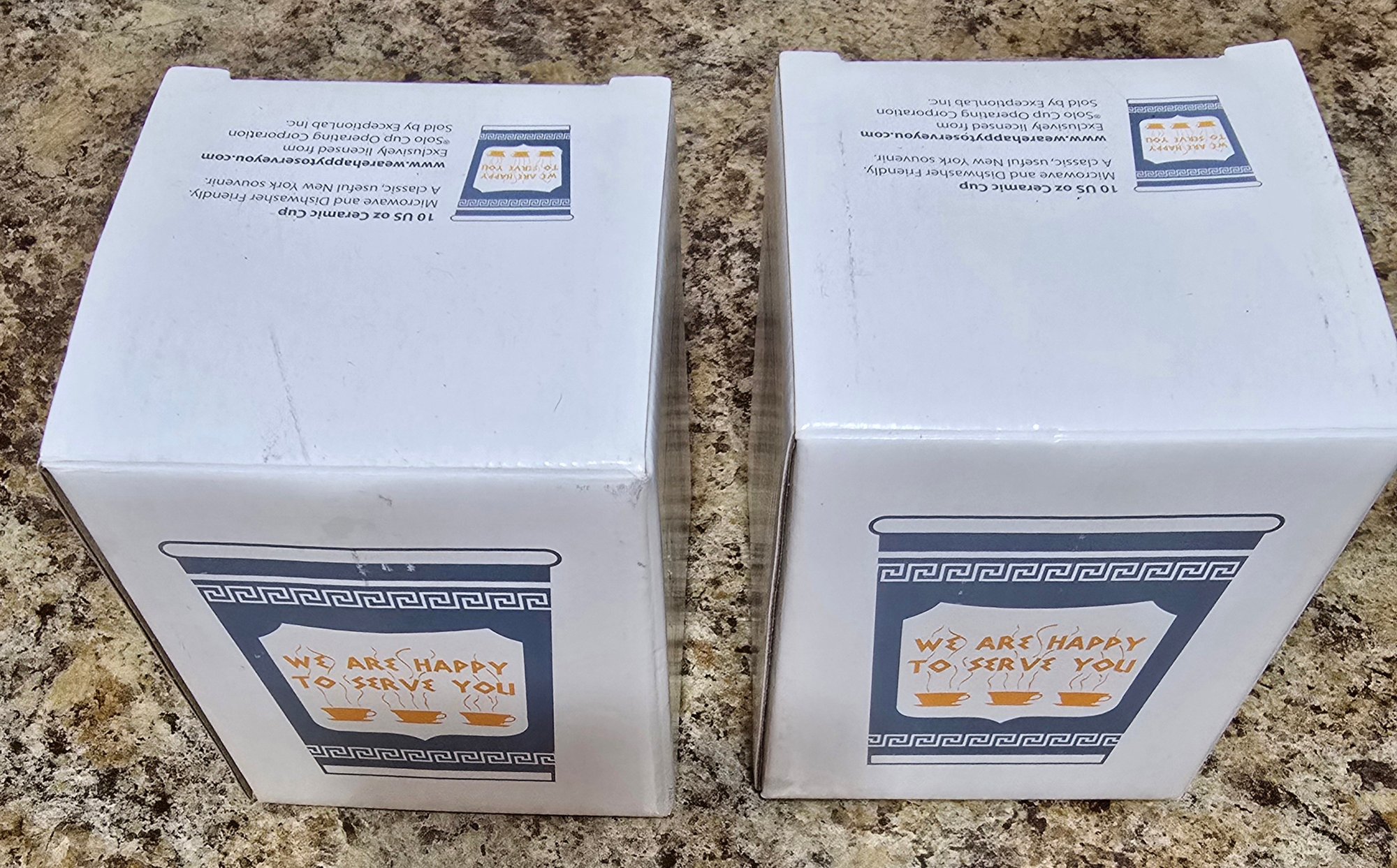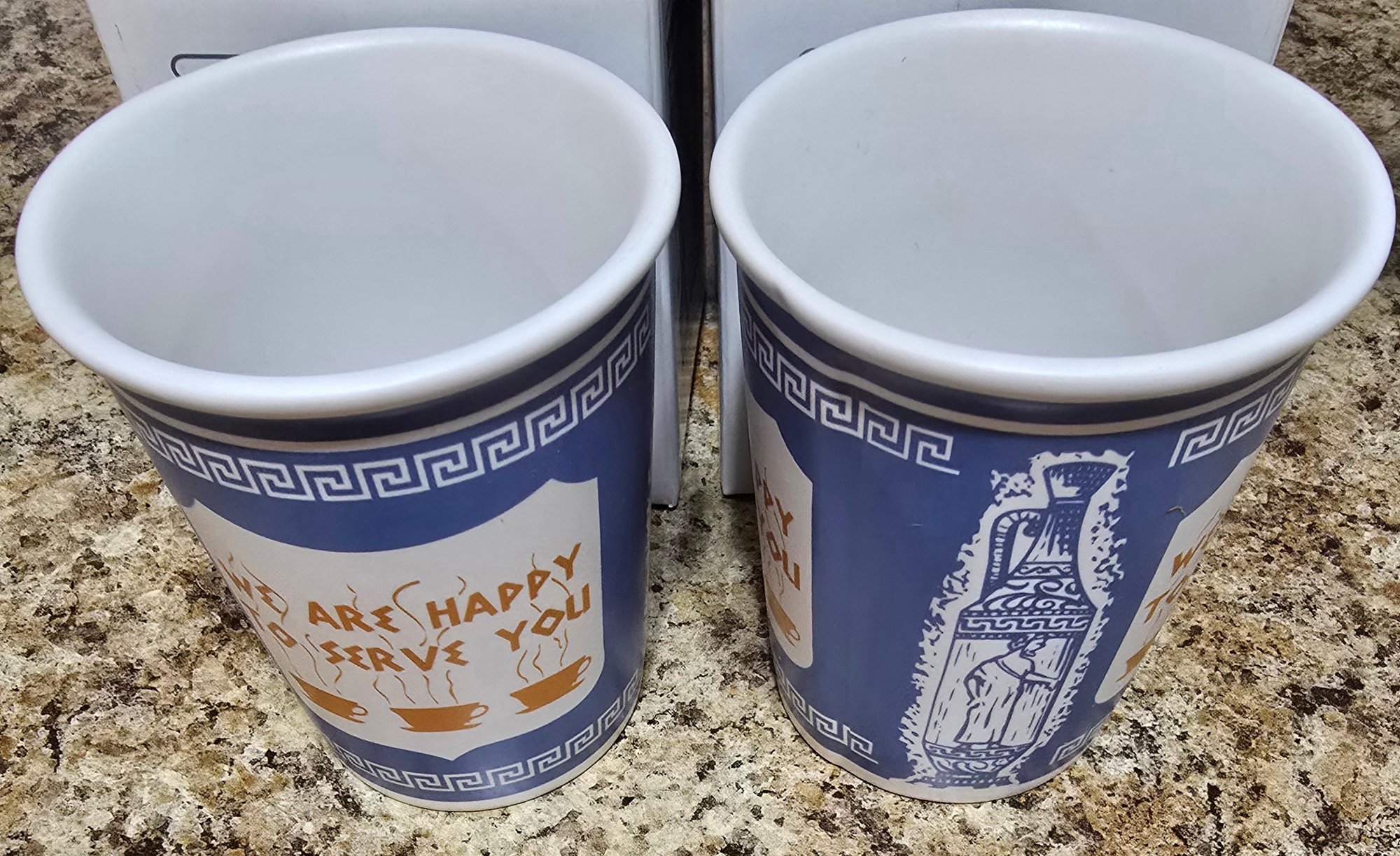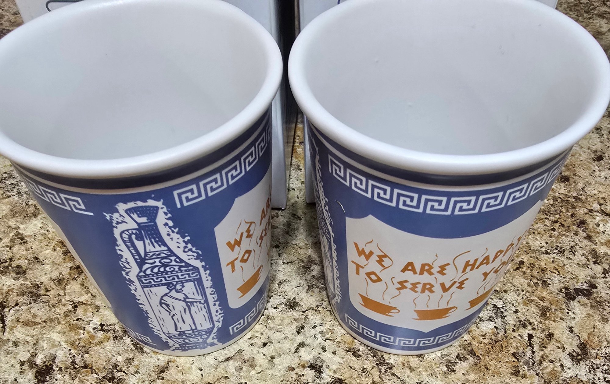 Pair of "We Are Happy To Serve You" Cups in original box. Measures 3.25 x 3.75. Please see all pics for details.