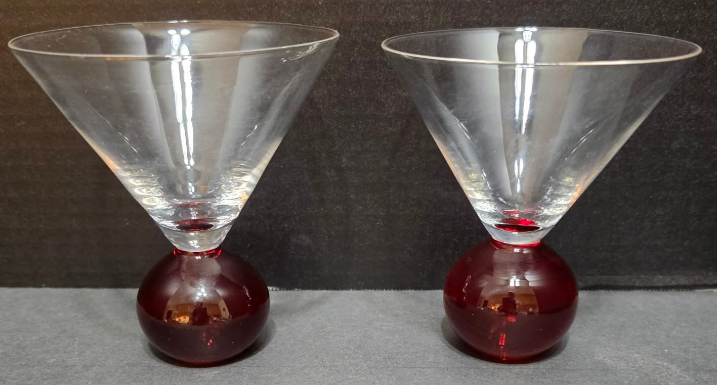 Pairpoint Art Glass Ruby Red Ball Bubble Base Martini Cocktail Glasses MCM Style. Measures 4.75 x 5.25. No cracks or chips noted.