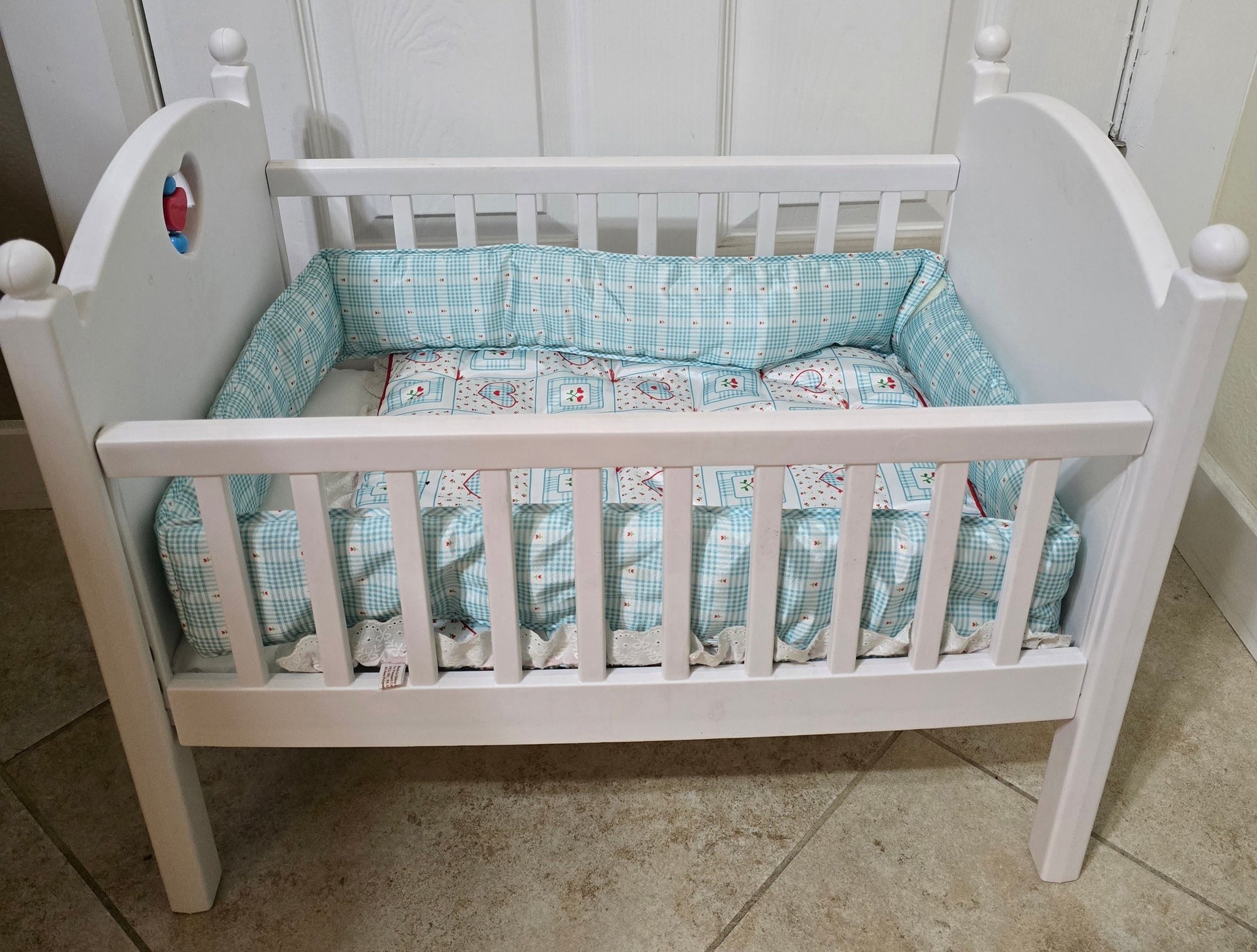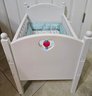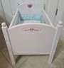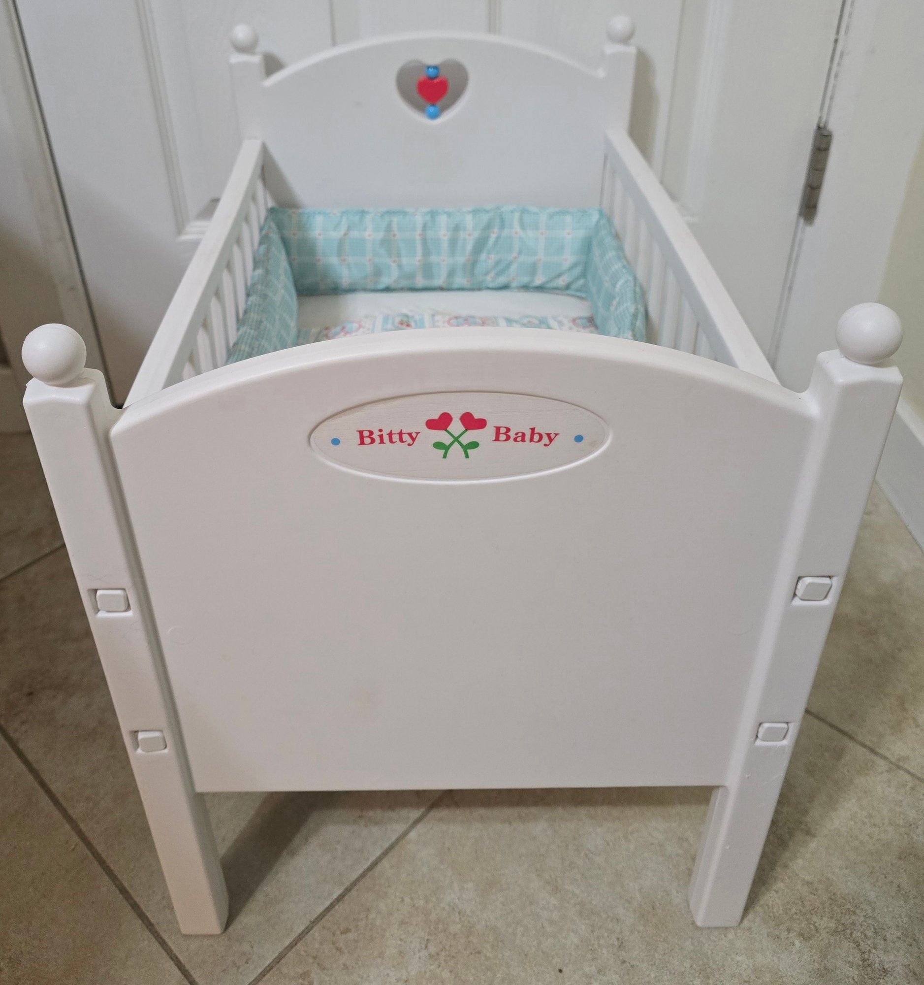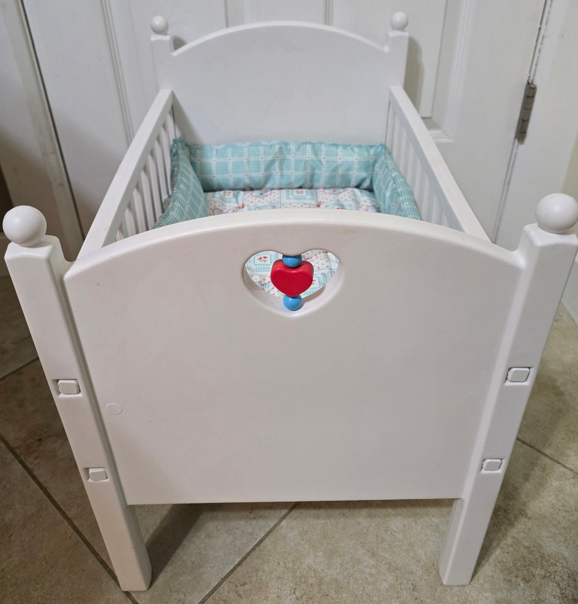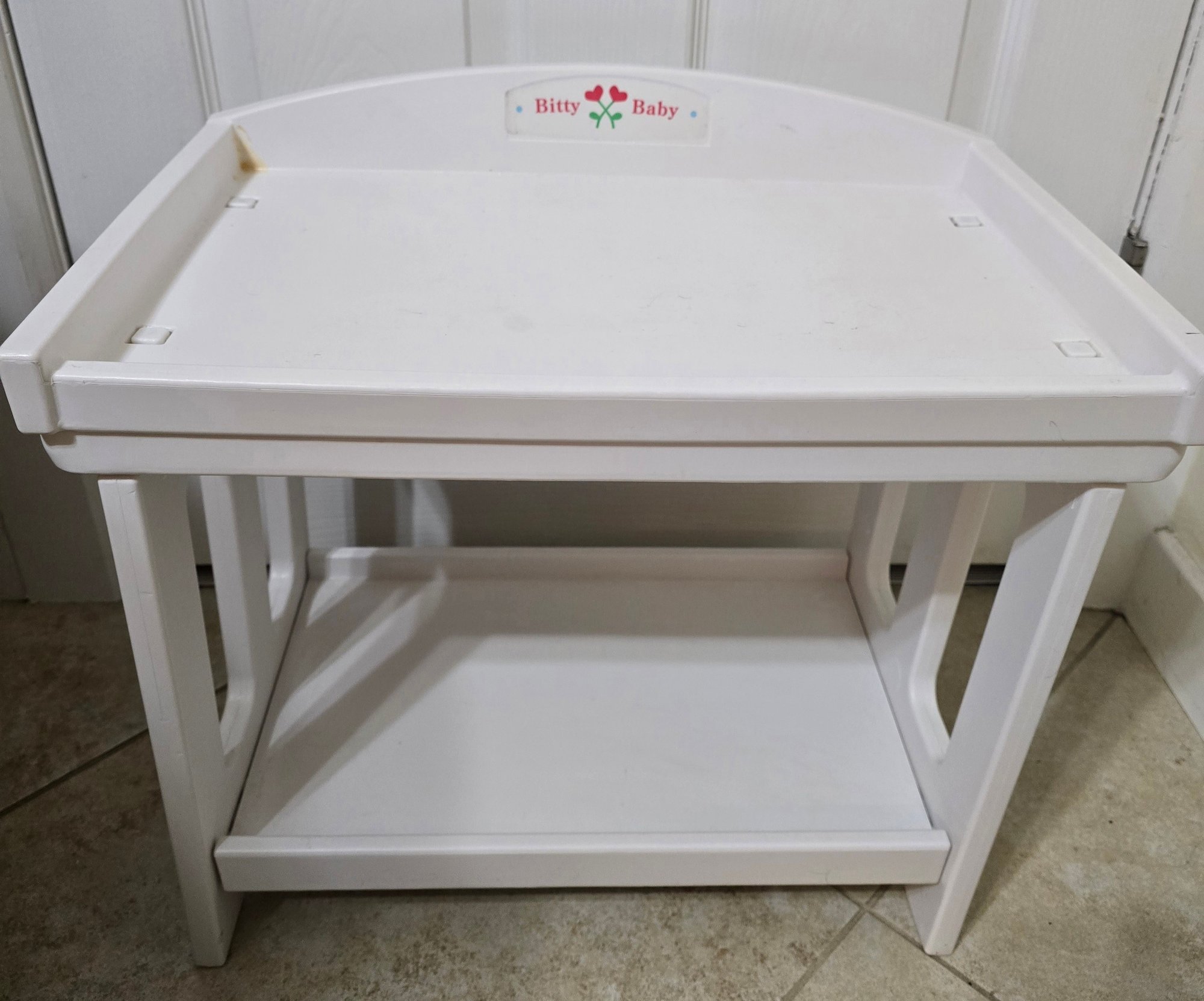 American Girl Bitty Baby white heart crib and changing table set, a retired model for 15-inch baby dolls. Measures 21.75 x 14.5 x 17.5 and 19.25 x 12 x 18. Please see all pics for details.