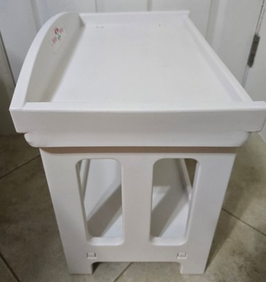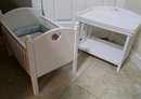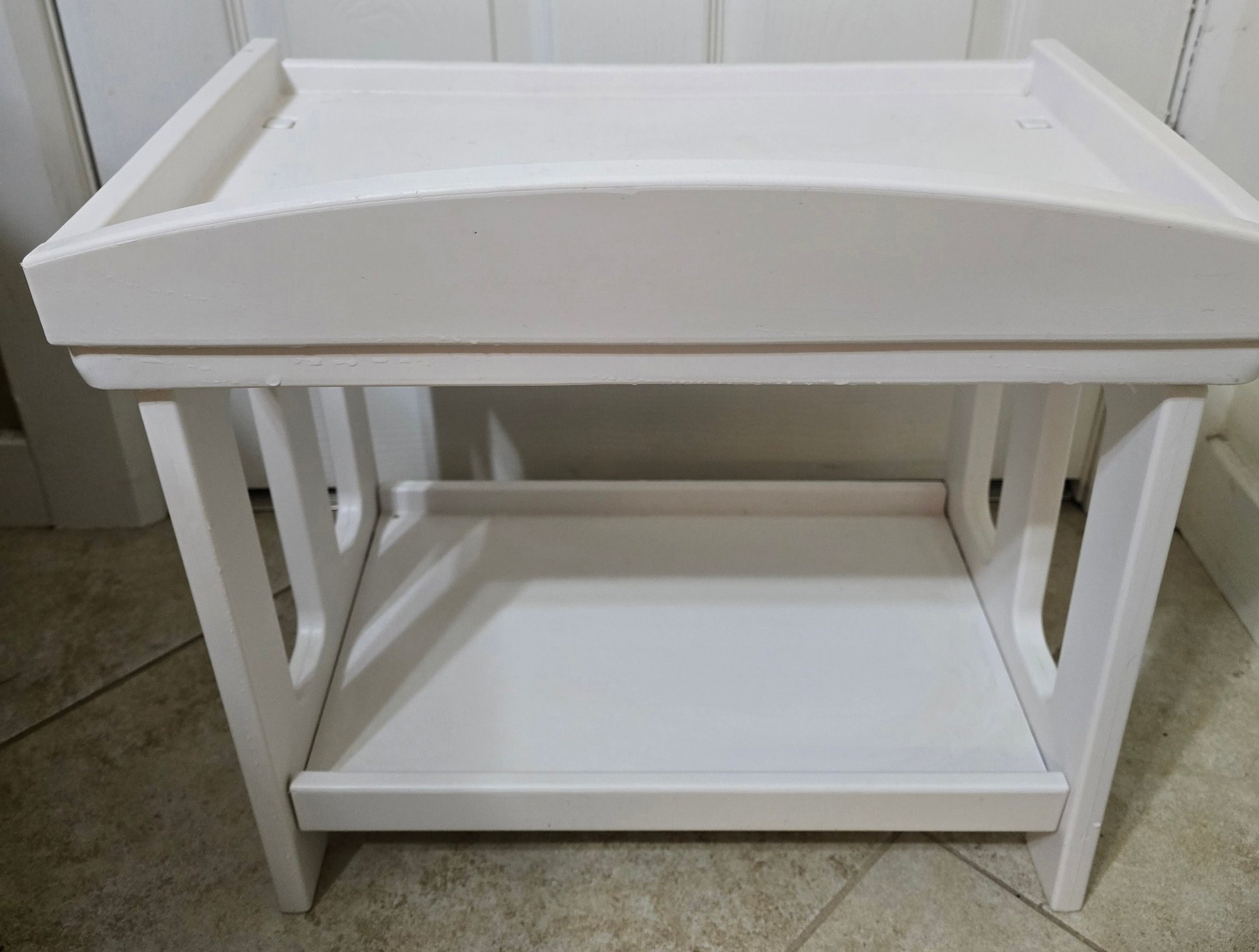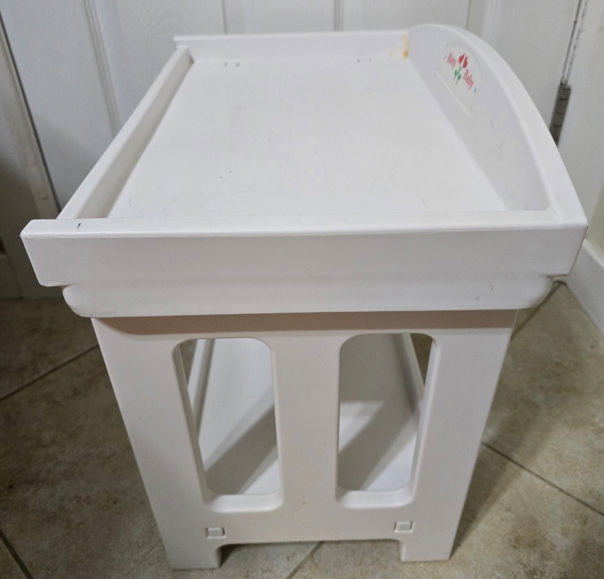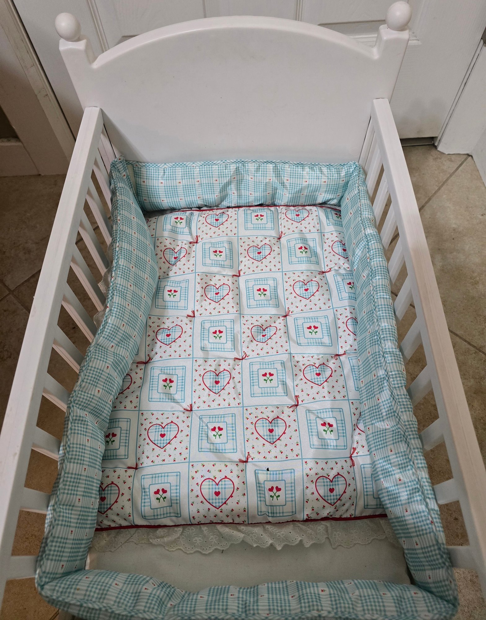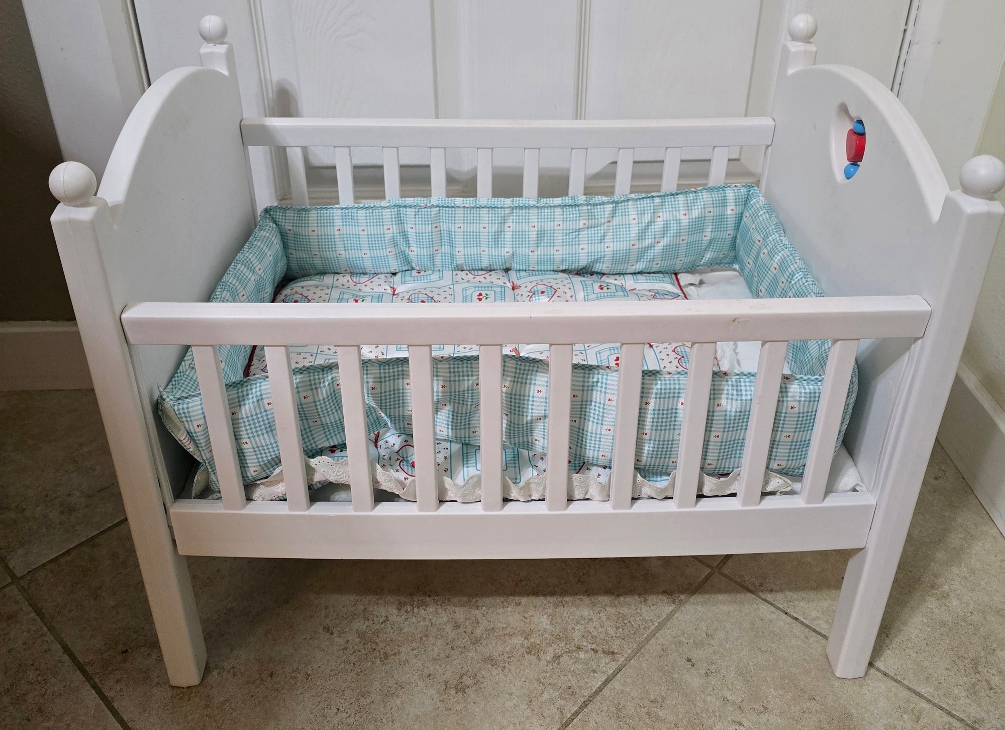 American Girl Bitty Baby white heart crib and changing table set, a retired model for 15-inch baby dolls. Measures 21.75 x 14.5 x 17.5 and 19.25 x 12 x 18. Please see all pics for details.