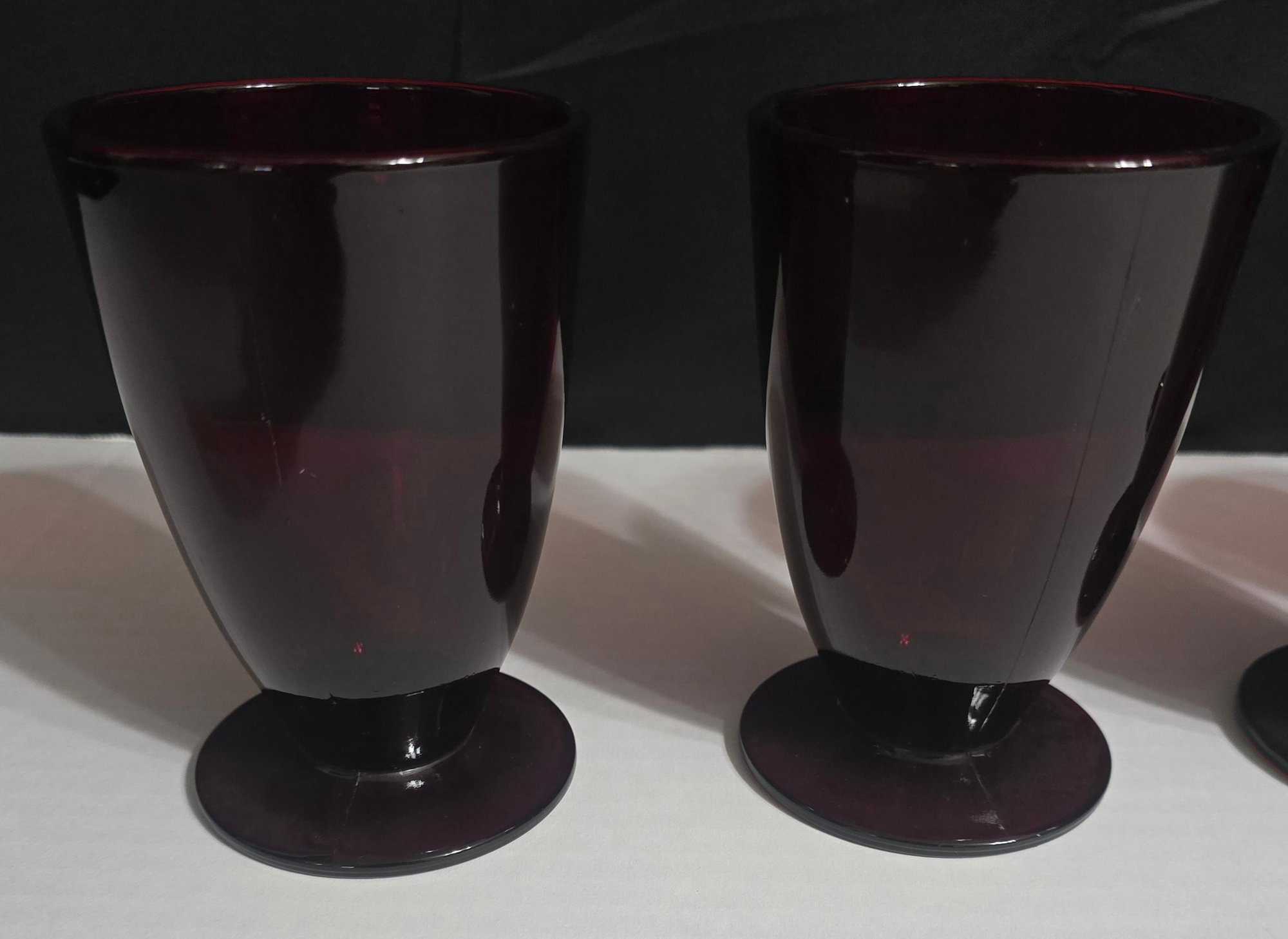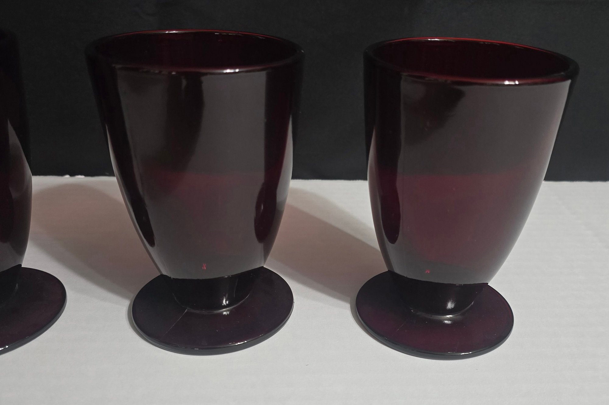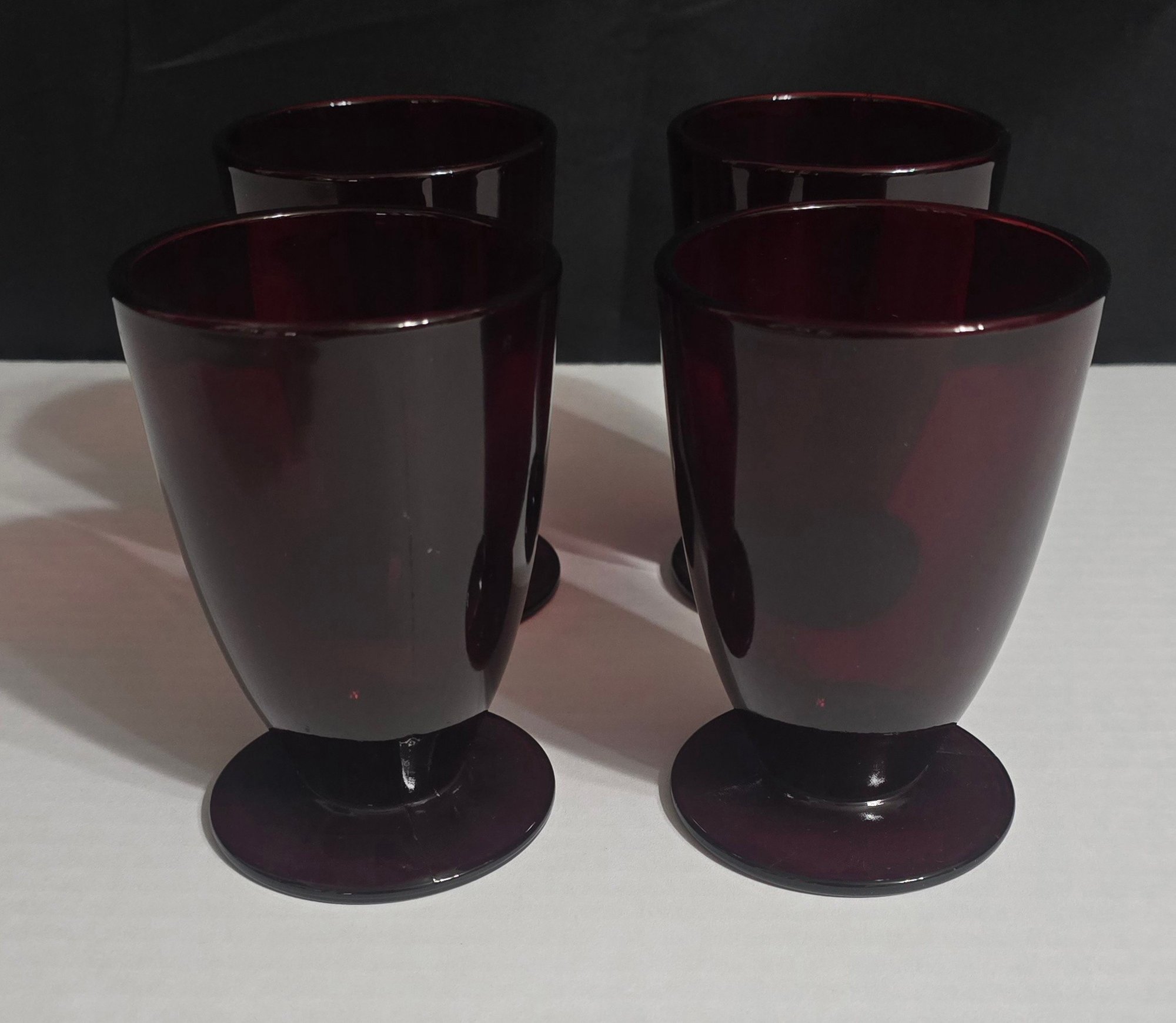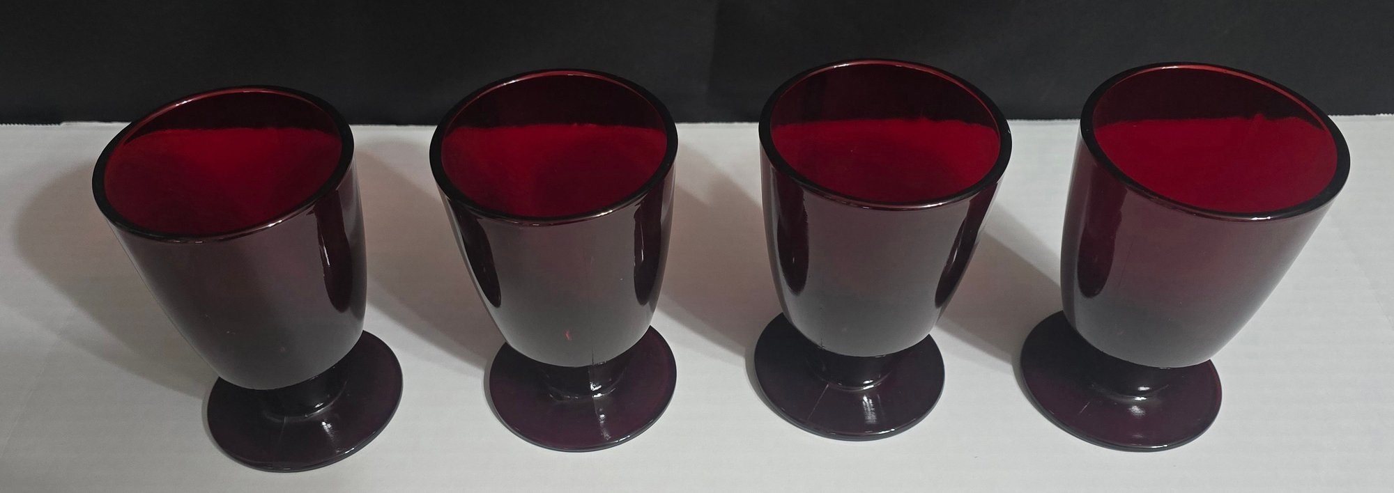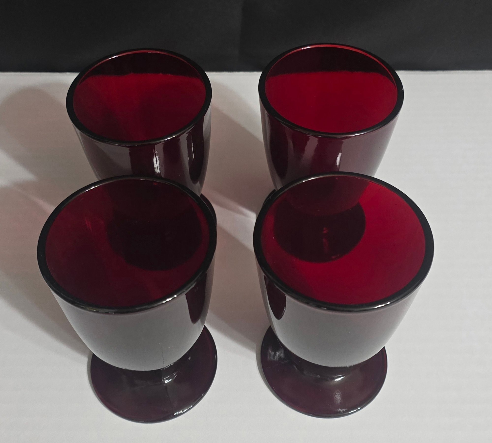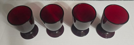 Vintage Anchor Hocking Royal Ruby red footed glasses. Measures 3.25 x 5. No cracks or chips noted. Please see all pics for details