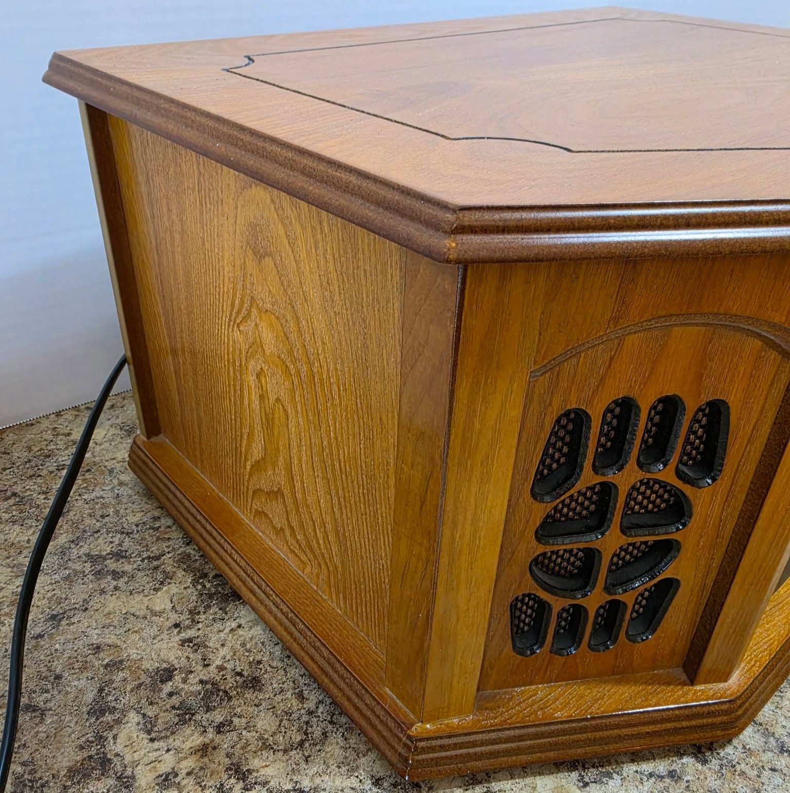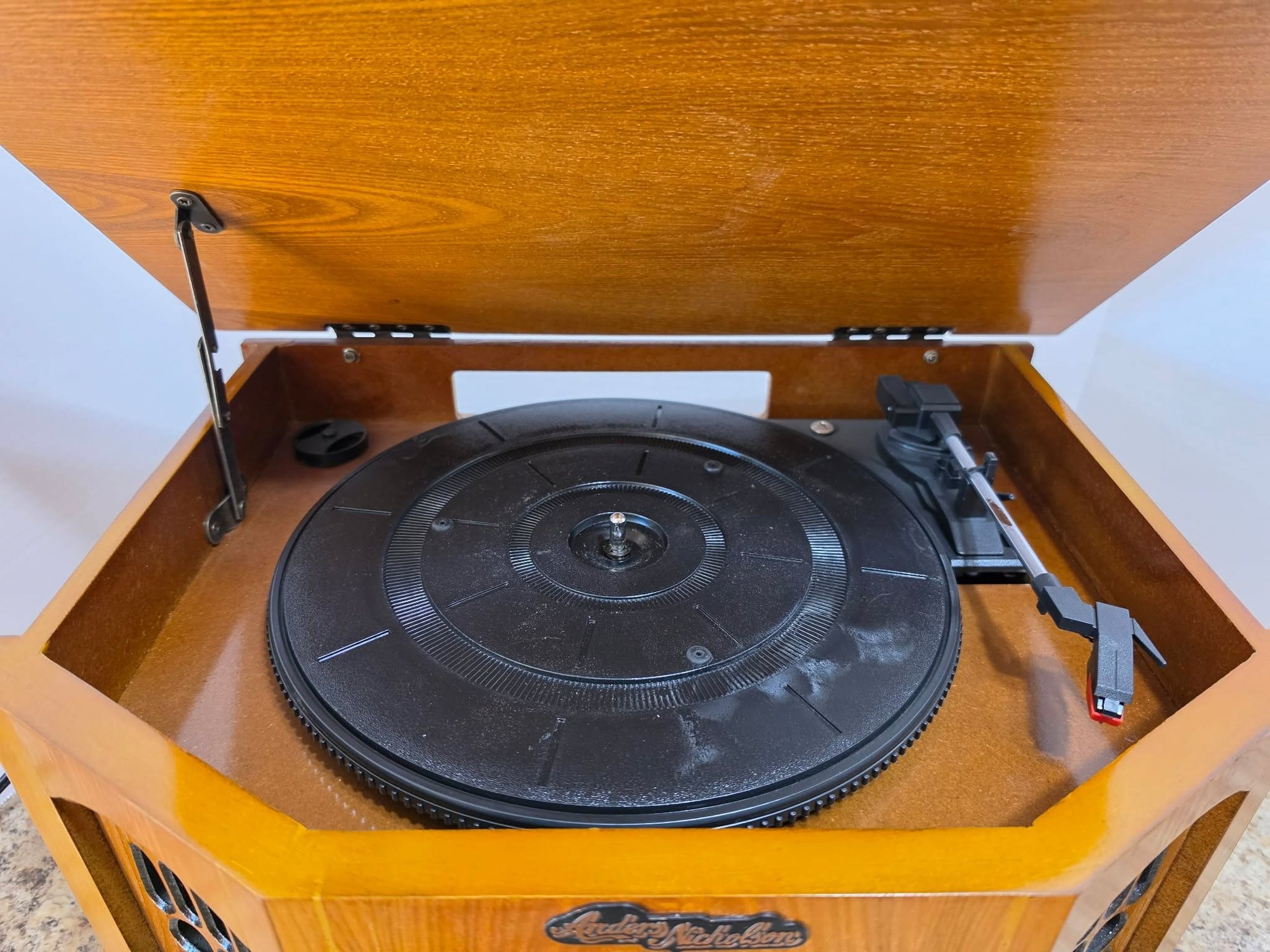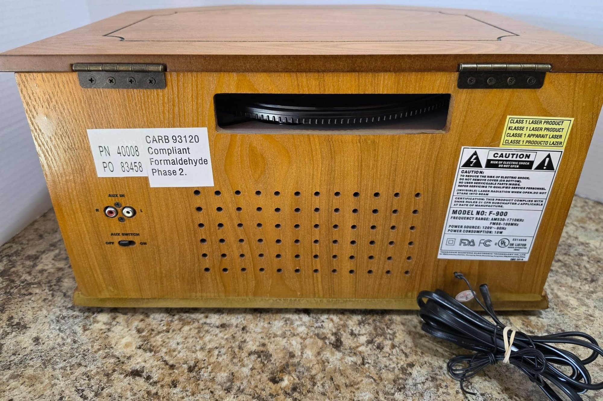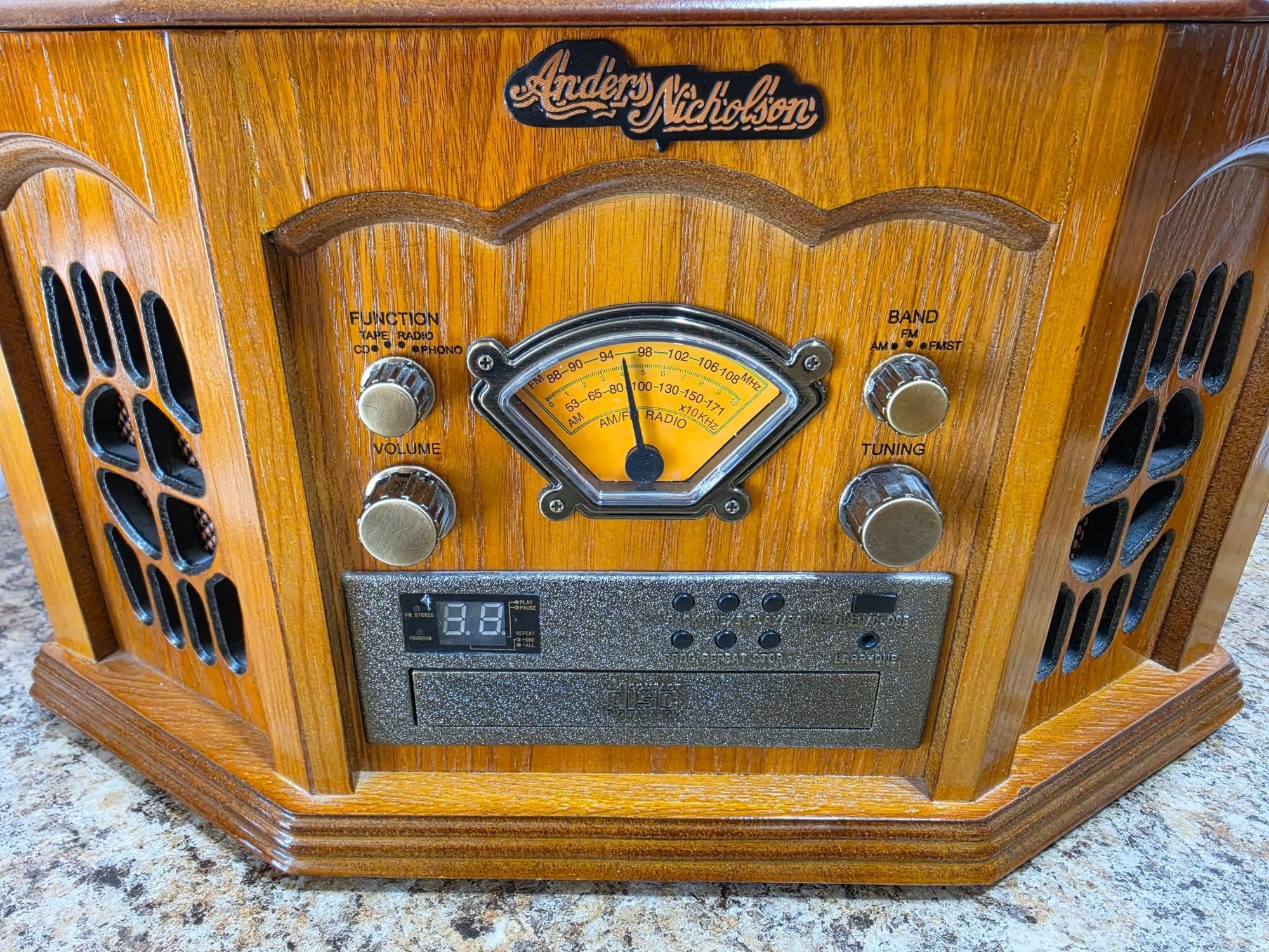 Anders Nicholson F-900 nostalgia music system, a 10-in-1 entertainment console featuring a wood grain veneer cabinet. Tested and works.